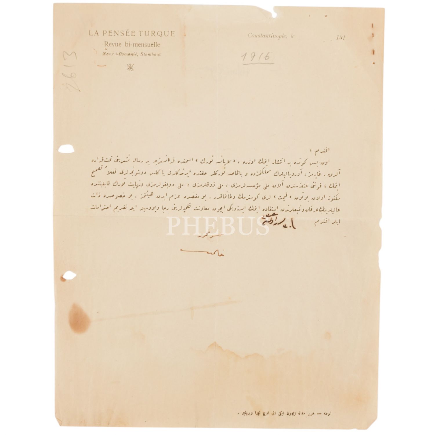 Hilmi Ziya Ülken tarafından çıkarılan LA PENSEE TURQUE adlı gazetenin, ilk neşri için karar alındığına ve derginin vizyonuna dair kaleme alınmış evrak, 1916, 21x27 cm...