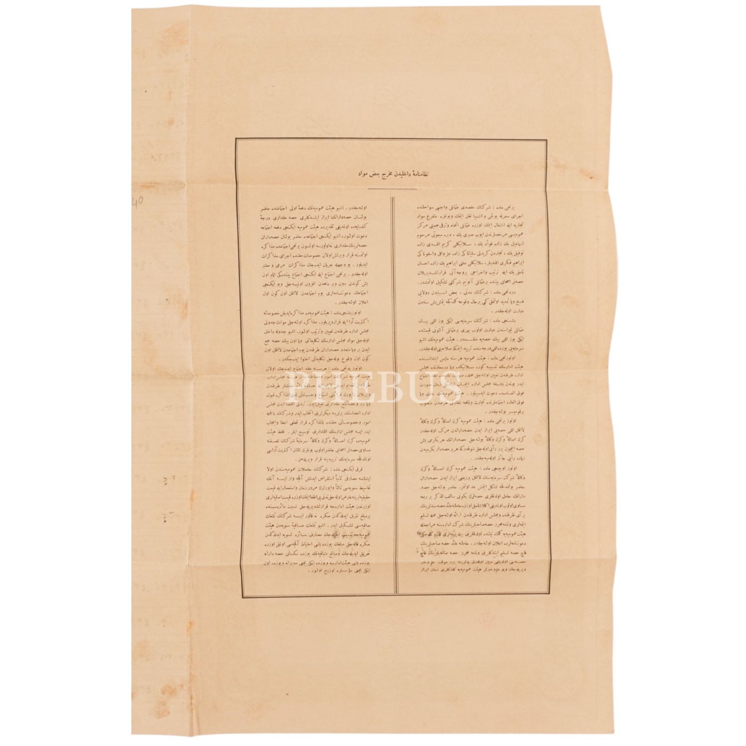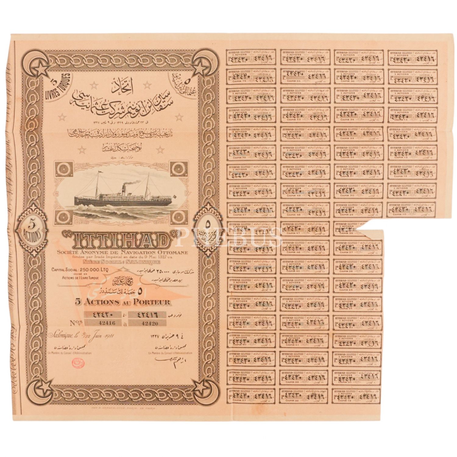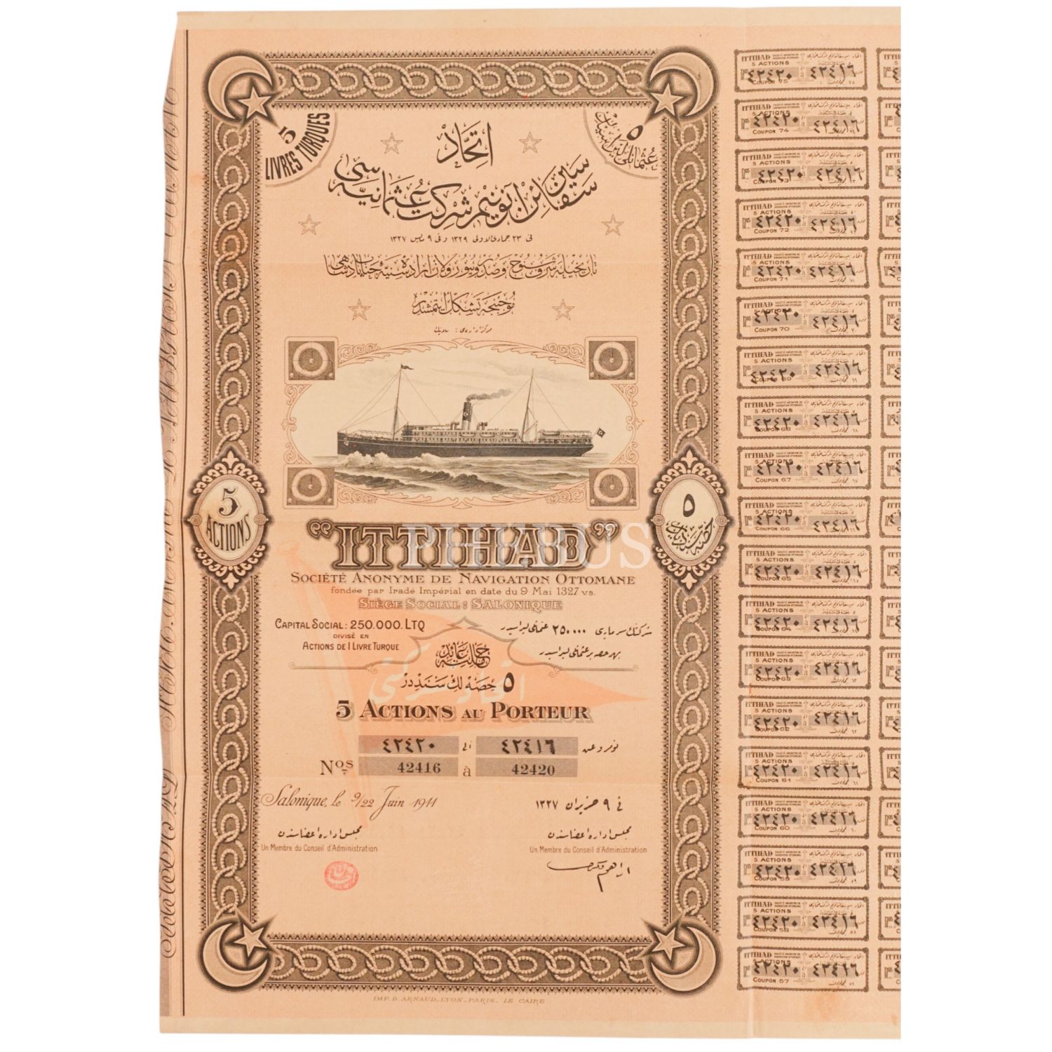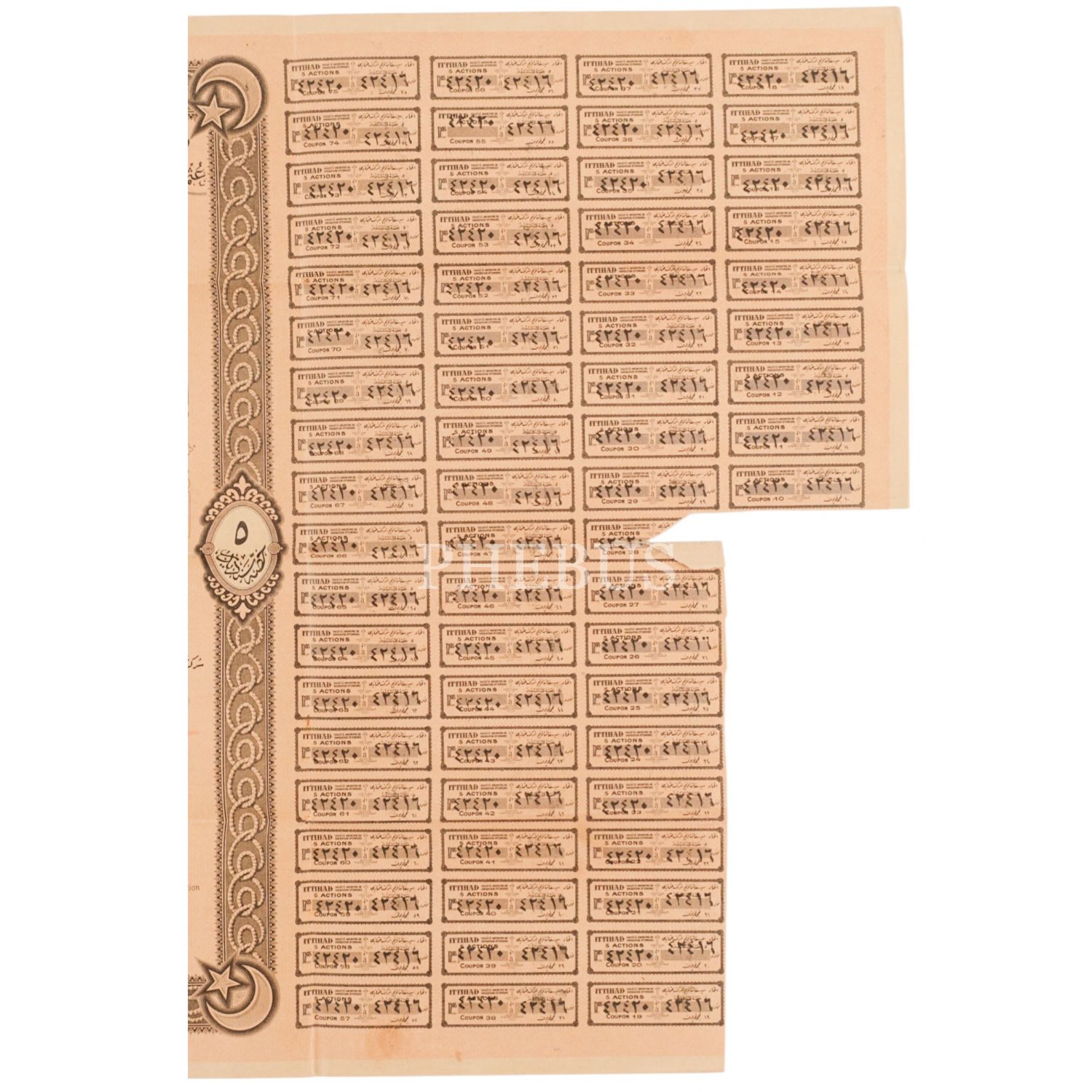 İTTİHAT SEYR-U SEFAİN ANONİM ŞİRKET-İ OSMANİYESİ´nin 5 Osmanlı Lirasına eşit hisse senedi, 53x46 cm...