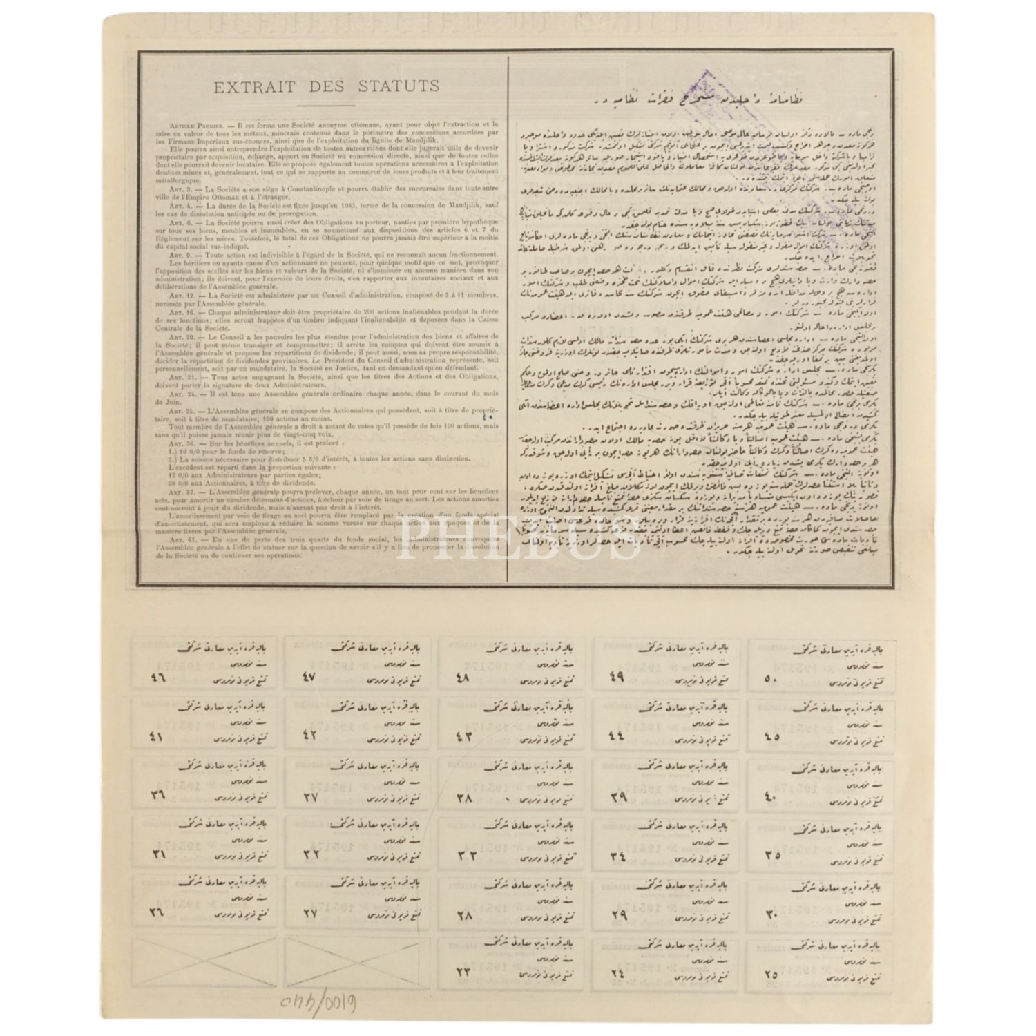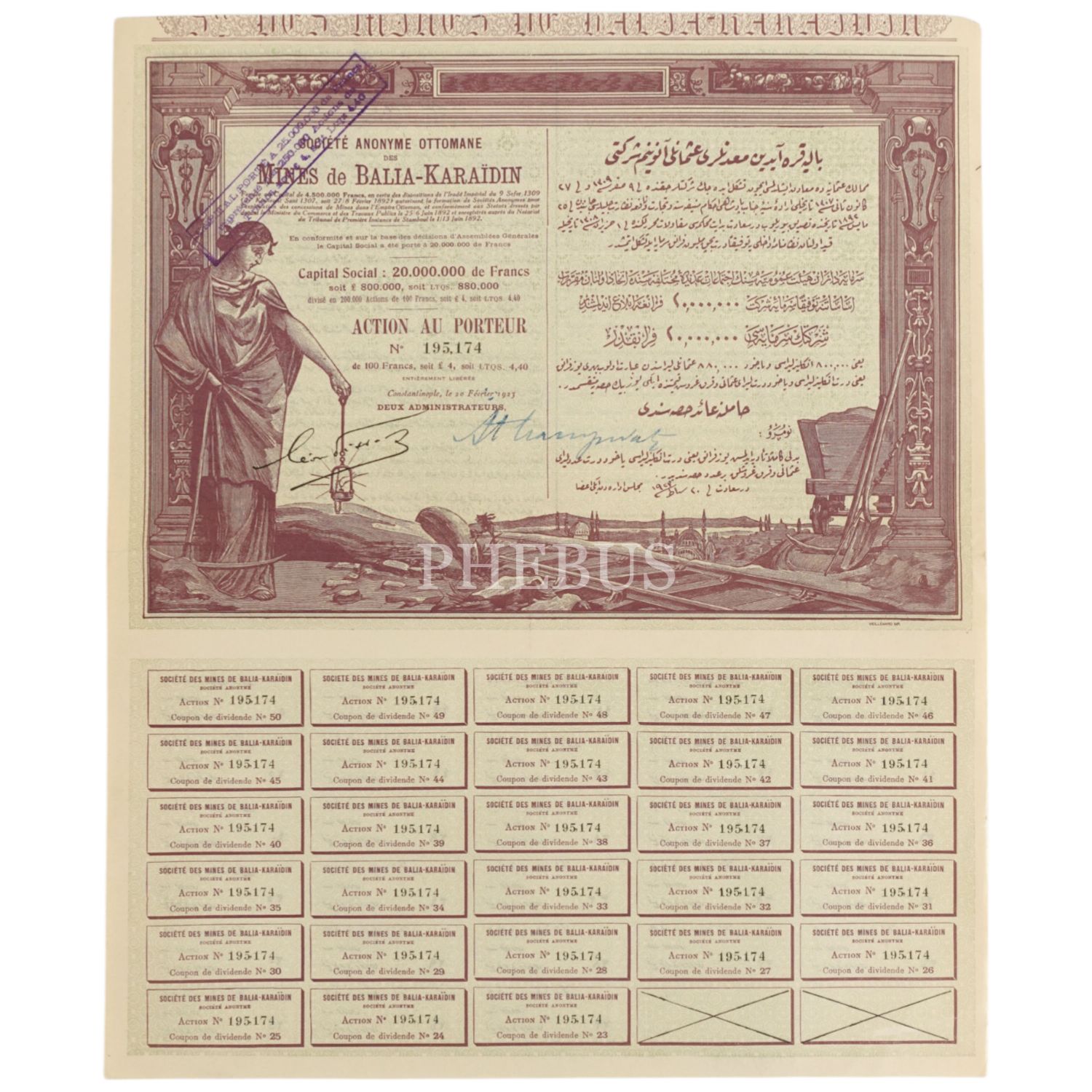 Balya-Karaaydın Madenleri Osmanlı Anonim Şirketi´nin Osmanlıca ve Fransızca hisse senedi, 33x37 cm...