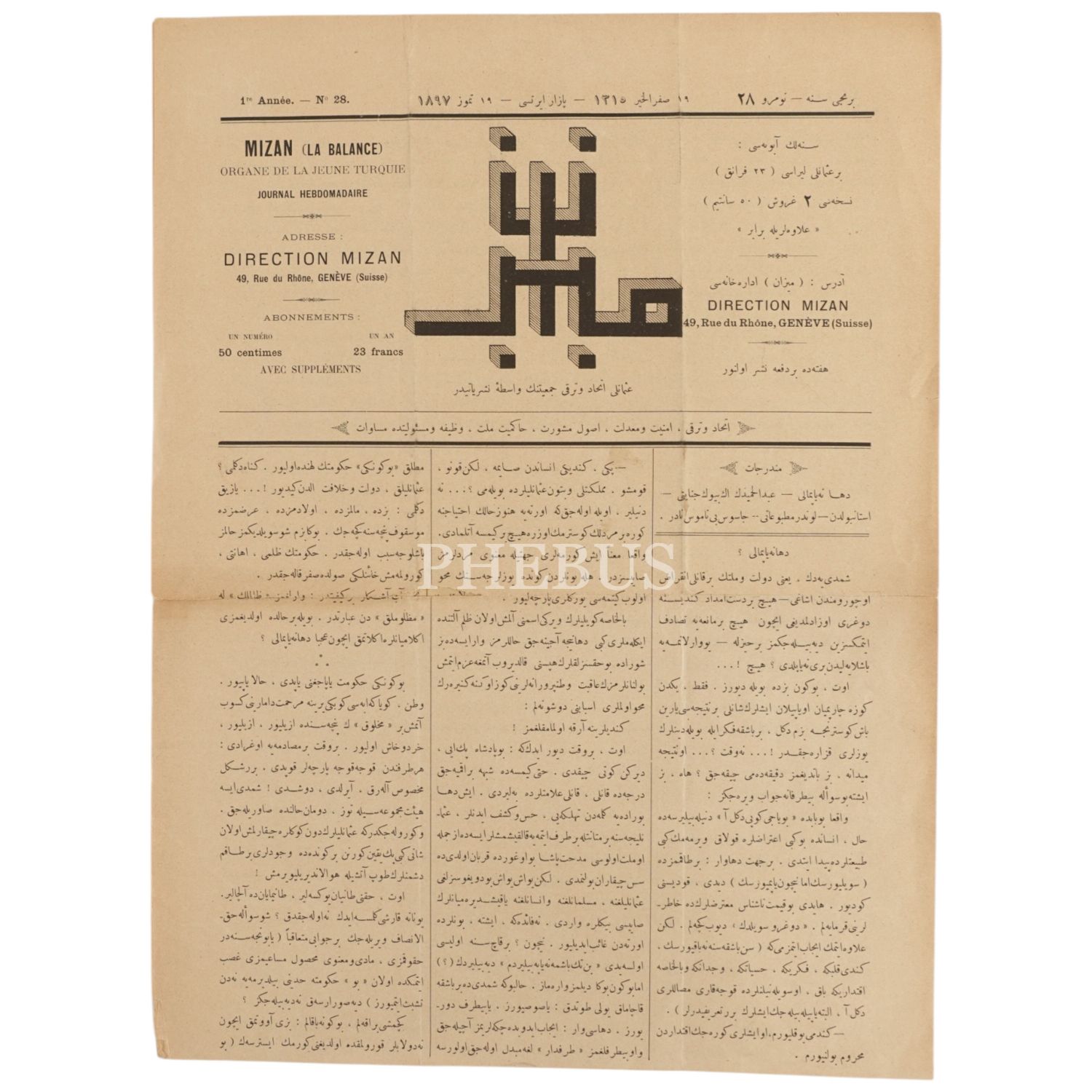 İttihat ve Terakki Cemiyeti´nin yayın organı MİZAN gazetesinin 19 Temmuz 1897 tarihli nüshası, 27x37 cm...