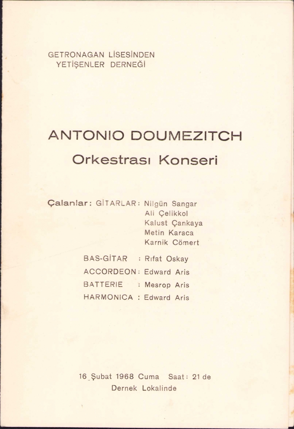 Antonio Doumezitch Orkestrası Konseri - Getronagan Lisesinden Yetişenler Derneği, 1968, 3 sayfa, 14x20 cm
