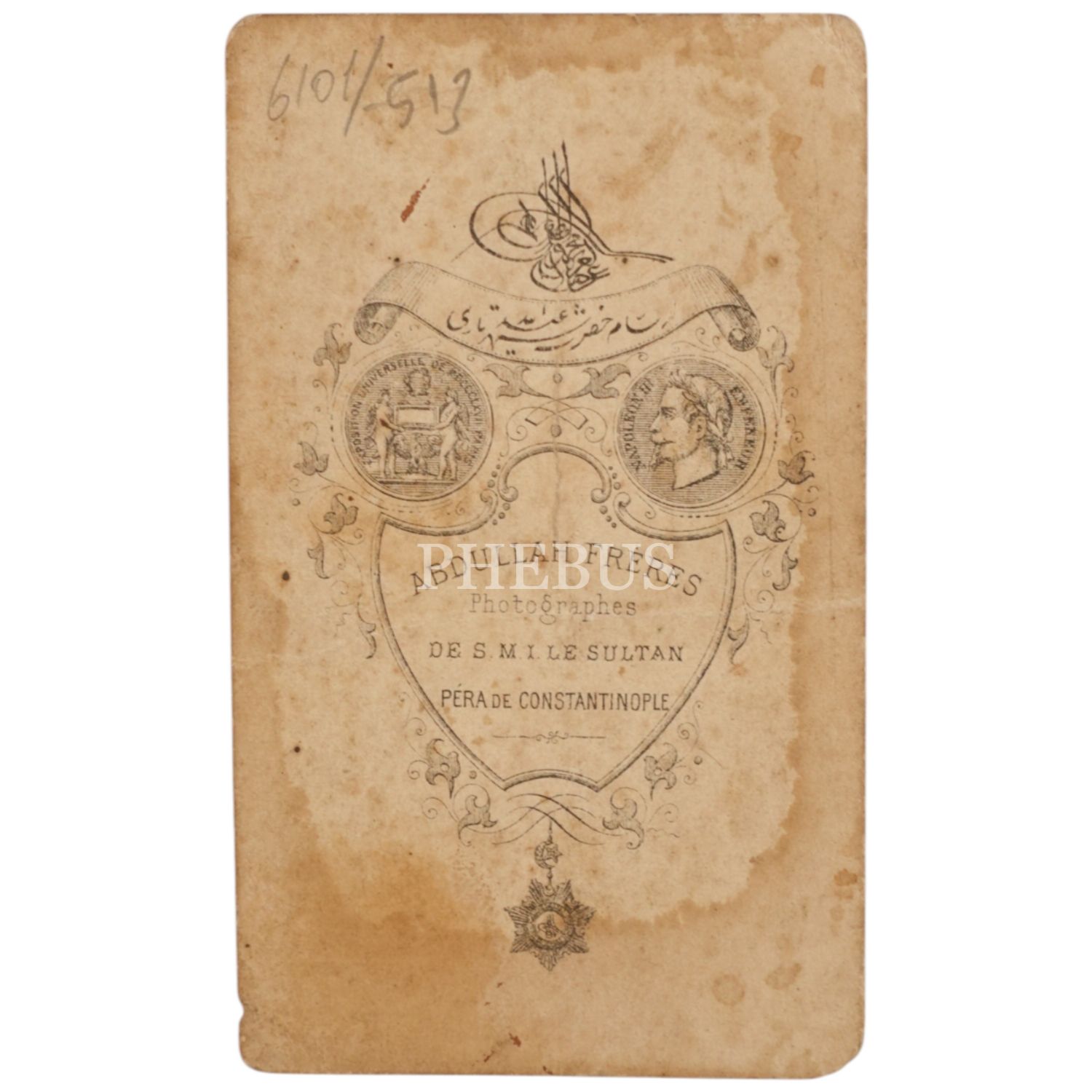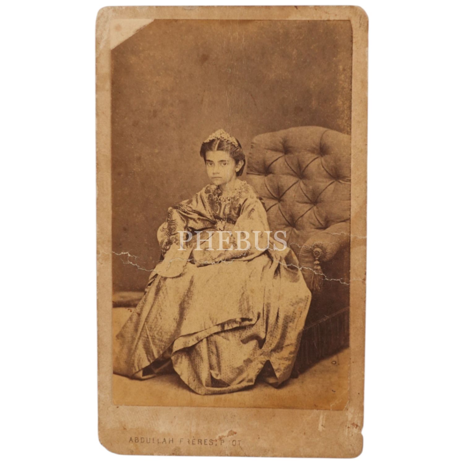 Şık giyimli bir kız çocuğunun Abdullah Freres Fotoğrafhanesi´nde çektirdiği hatıra fotoğrafı, 6x10 cm...