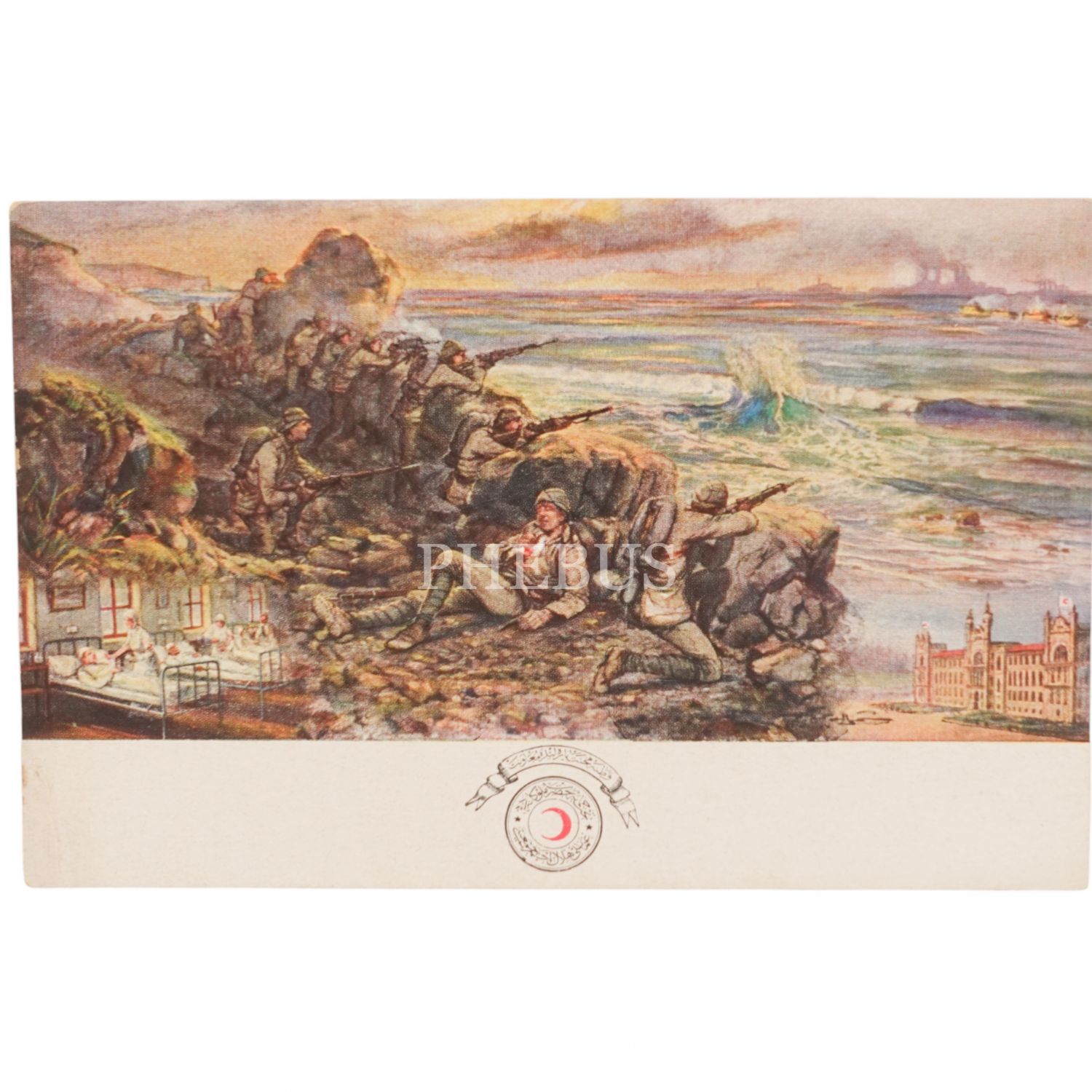Cephede yaralanmış bir Türk askeri, Haydarpaşa Askeri Hastahanesi ve bu hastanenin içinde tedavi gören askerler görselli parçalı kartpostal, ed. Hilal-i Ahmer Cemiyeti, 14x9 cm...