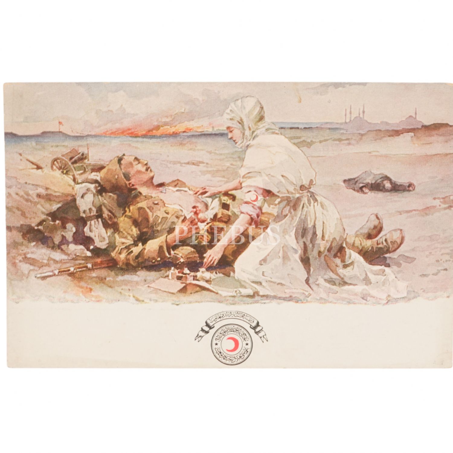 Birinci Cihan Harbi´nde yaralanan bir Türk askerine, cephe hattında müdahale eden bir hemşirenin resmedildiği kartpostal, ed. Hilal-i Ahmer Cemiyeti, 14x9 cm...