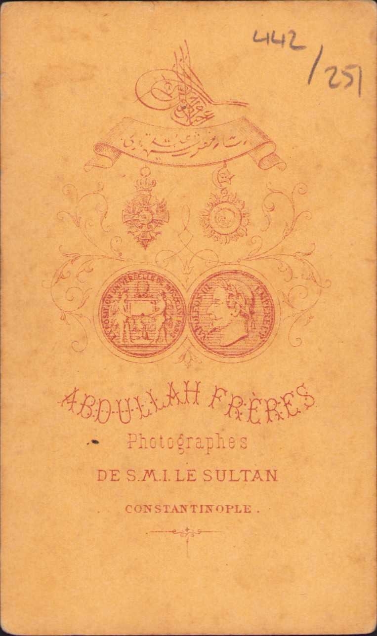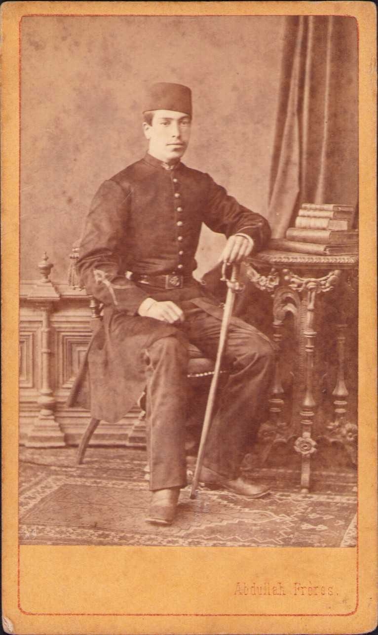 Photo Abdullah Freres, fesli, kılıçlı Osmanlı subayı kabin foto, 6x10 cm