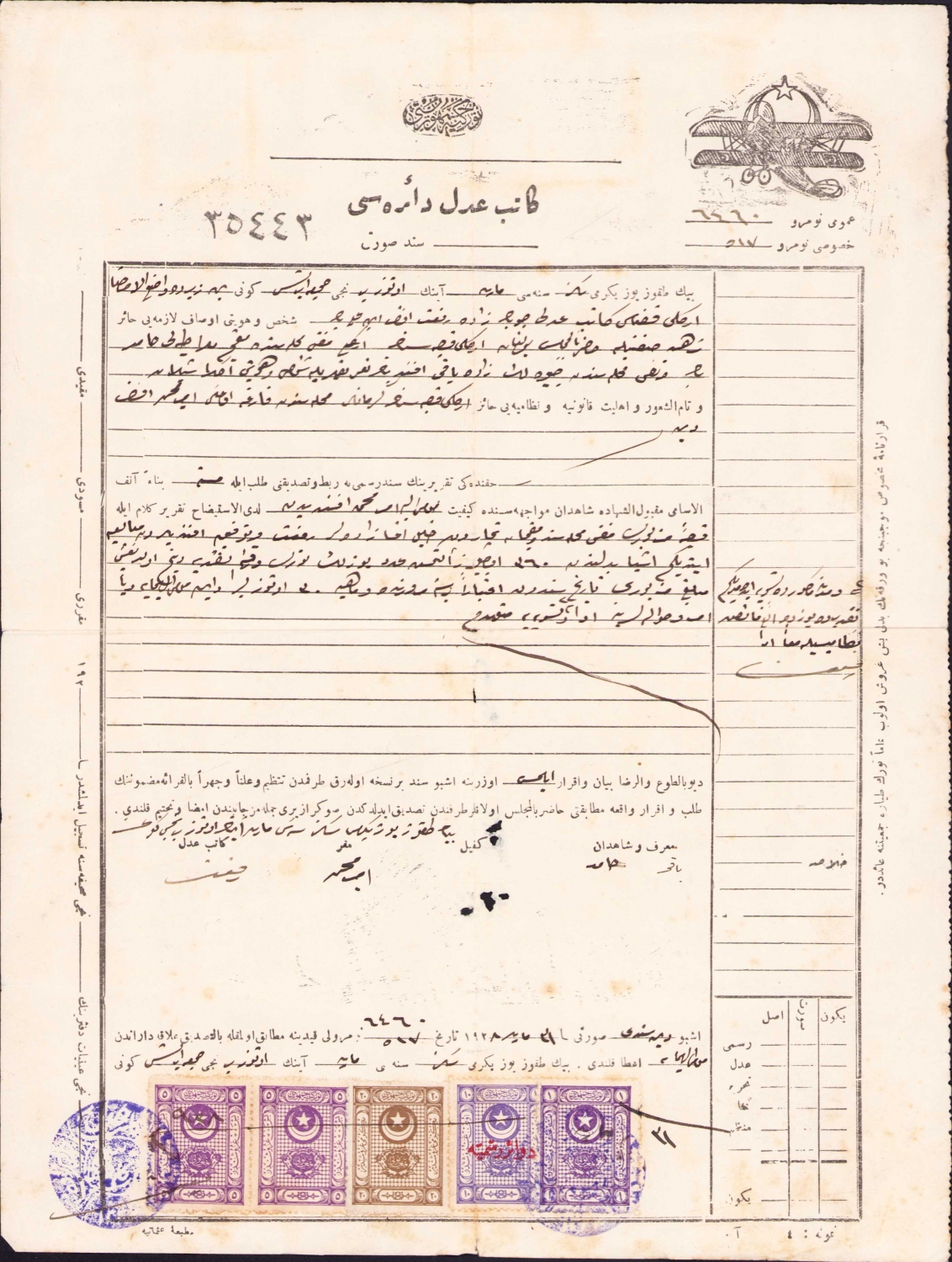 Osmanlıca Zonguldak Ereğli katibi adli Noter belgesi, 1928, pullu damgalı, ortadan kopukluk var, 23x32 cm