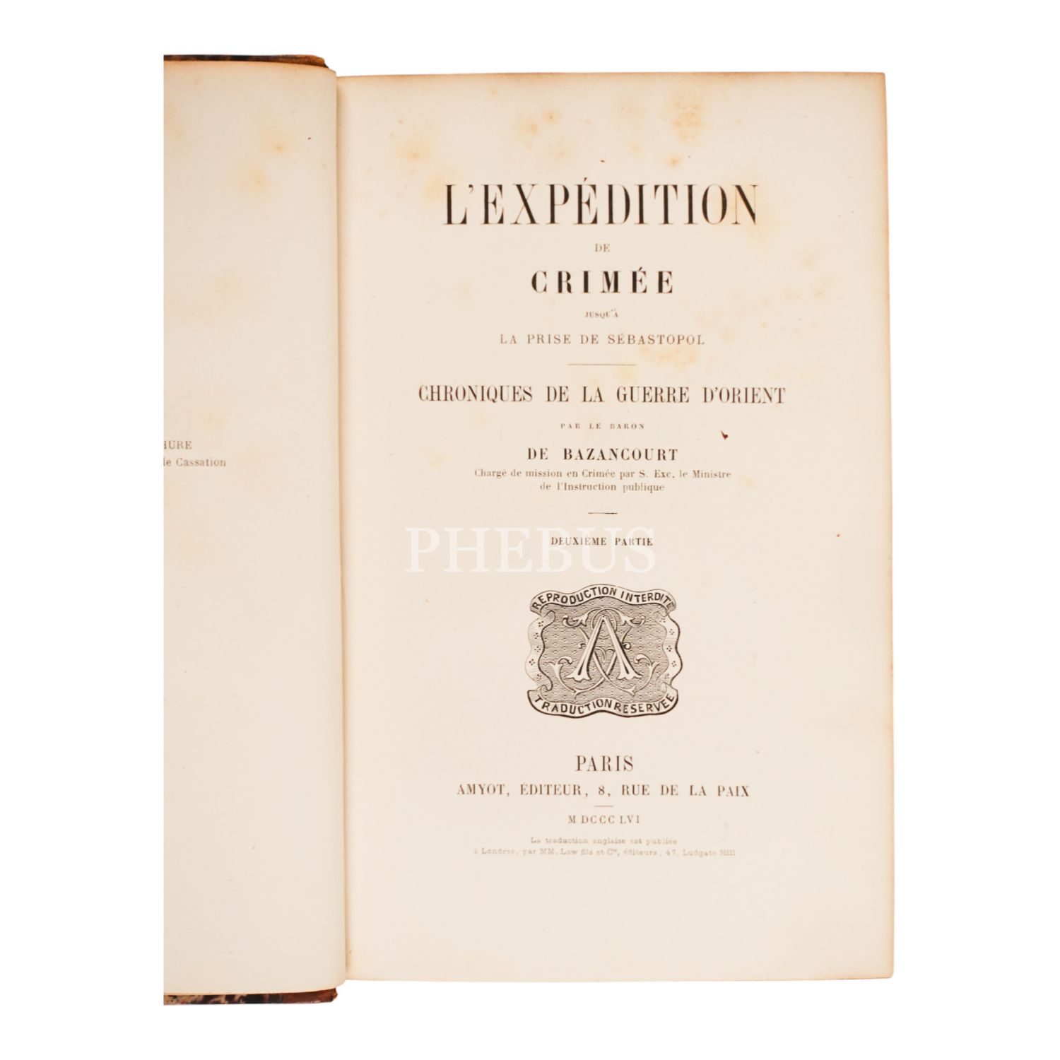 Baron de Bazancourt tarafından kaleme alınan, Kırım Savaşı'nı detaylı bir şekilde anlatan "L'EXPEDITION DE CRIMEE" (Kırım Seferi) adlı, 1856 yılı baskılı, 2 ciltlik nadir bir kitaptır. Paris'teki Amyot Editeur yayınevi tarafından basılan bu eser, savaşın kronolojik gelişimini, askeri operasyonları ve diplomatik olayları kapsamaktadır.