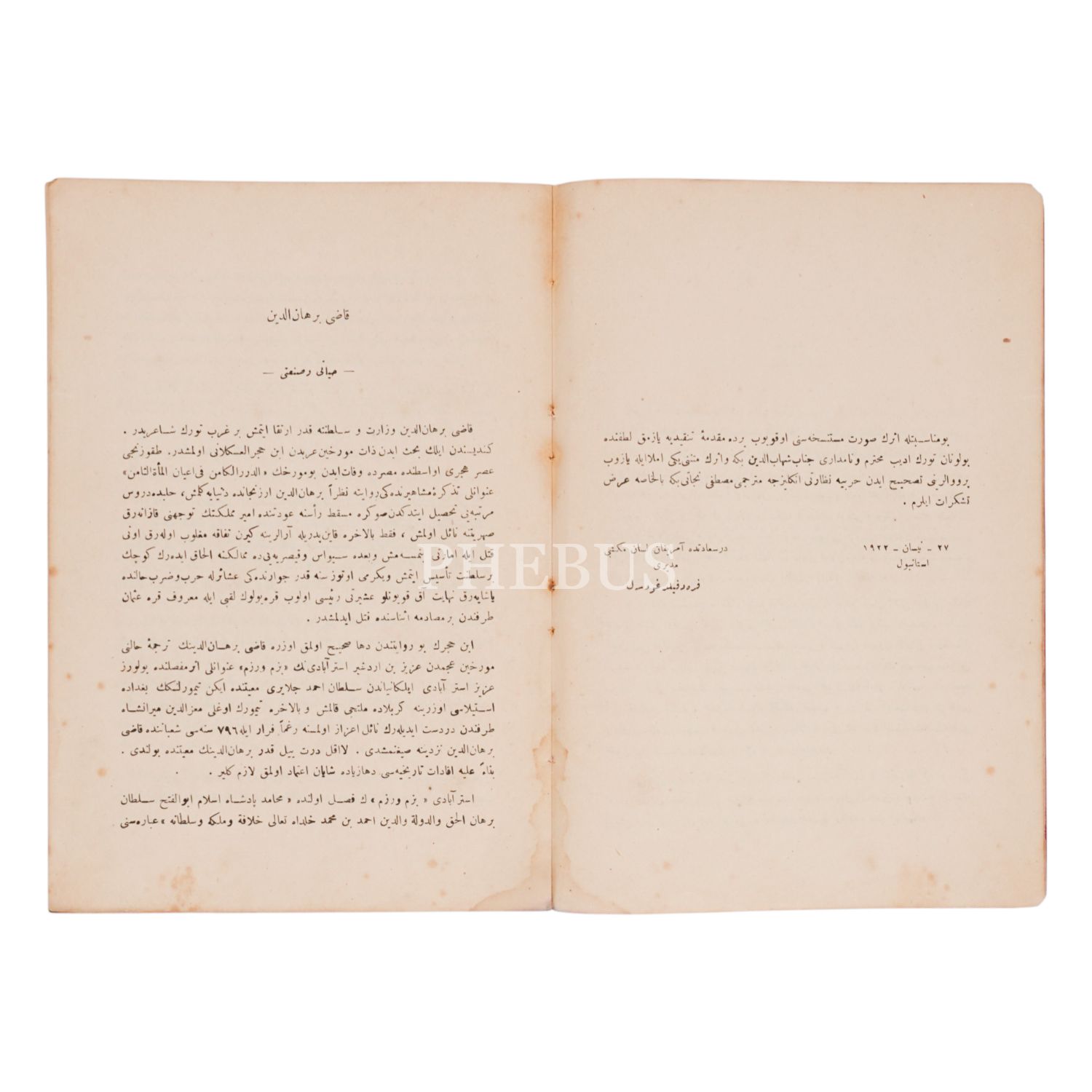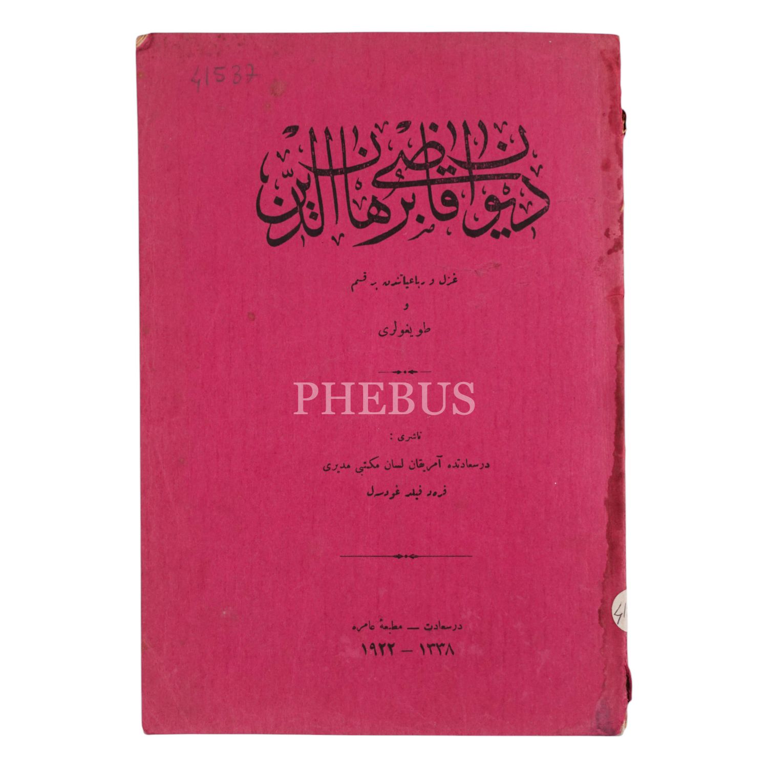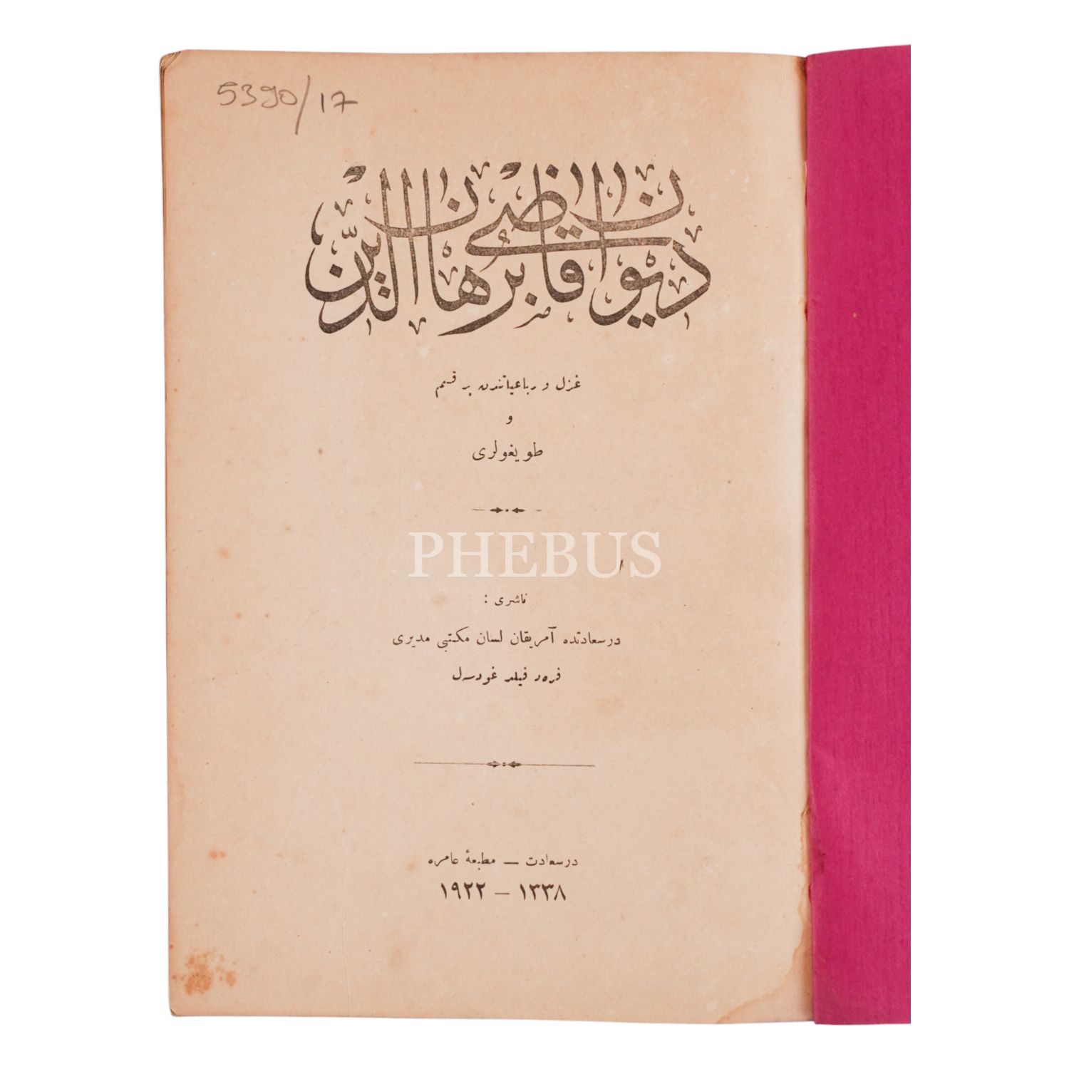 DÎVÂN-I KADI BURHÂNEDDİN (GAZEL VE RUBÂİYÂTDAN BİR KISIM VE TUYUĞLARI), Kadı Burhaneddin, Matbaa-i Âmire, 1922, 61 sayfa, 16x24 cm...