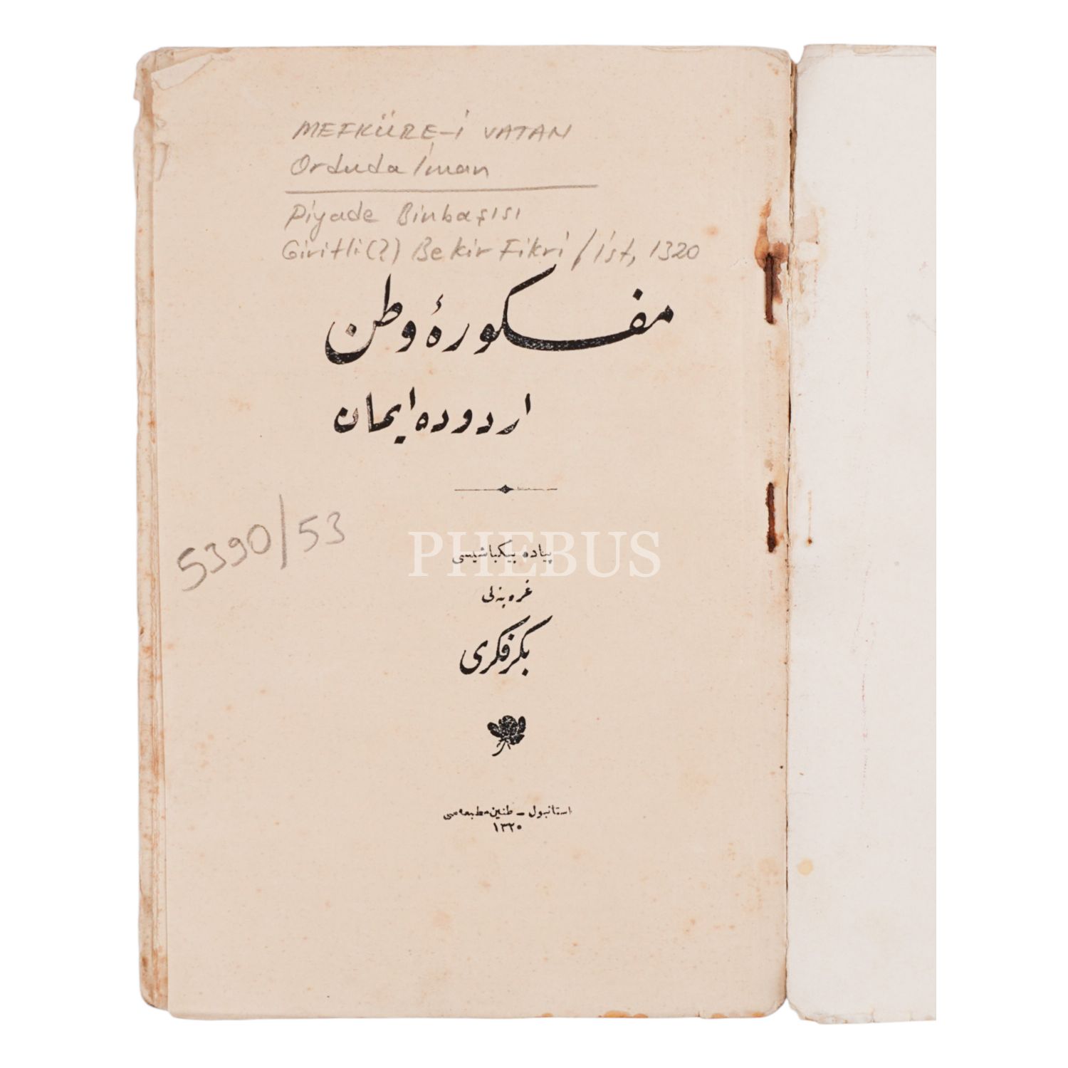 MEFKÛRE-İ VATAN, ORDUDA İMAN, Grebeneli Bekir Fikri, Tanin Matbaası, 1320, 189 sayfa, 13x19 cm...