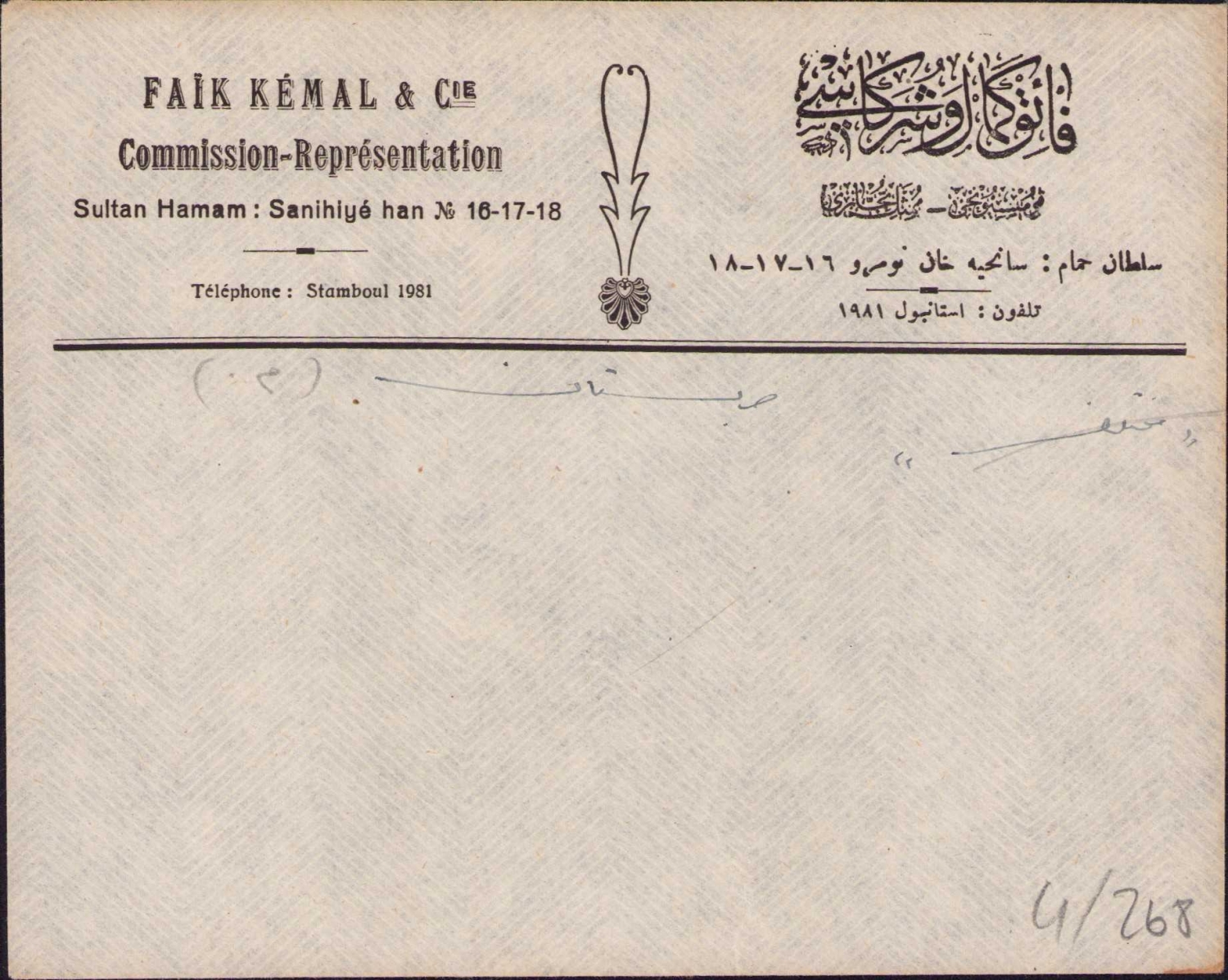 Osmanlıca - Fransızca Komisyonce - Manifaturacı Faik Kemal ve Şürekası antetli zarf, 15x12 cm