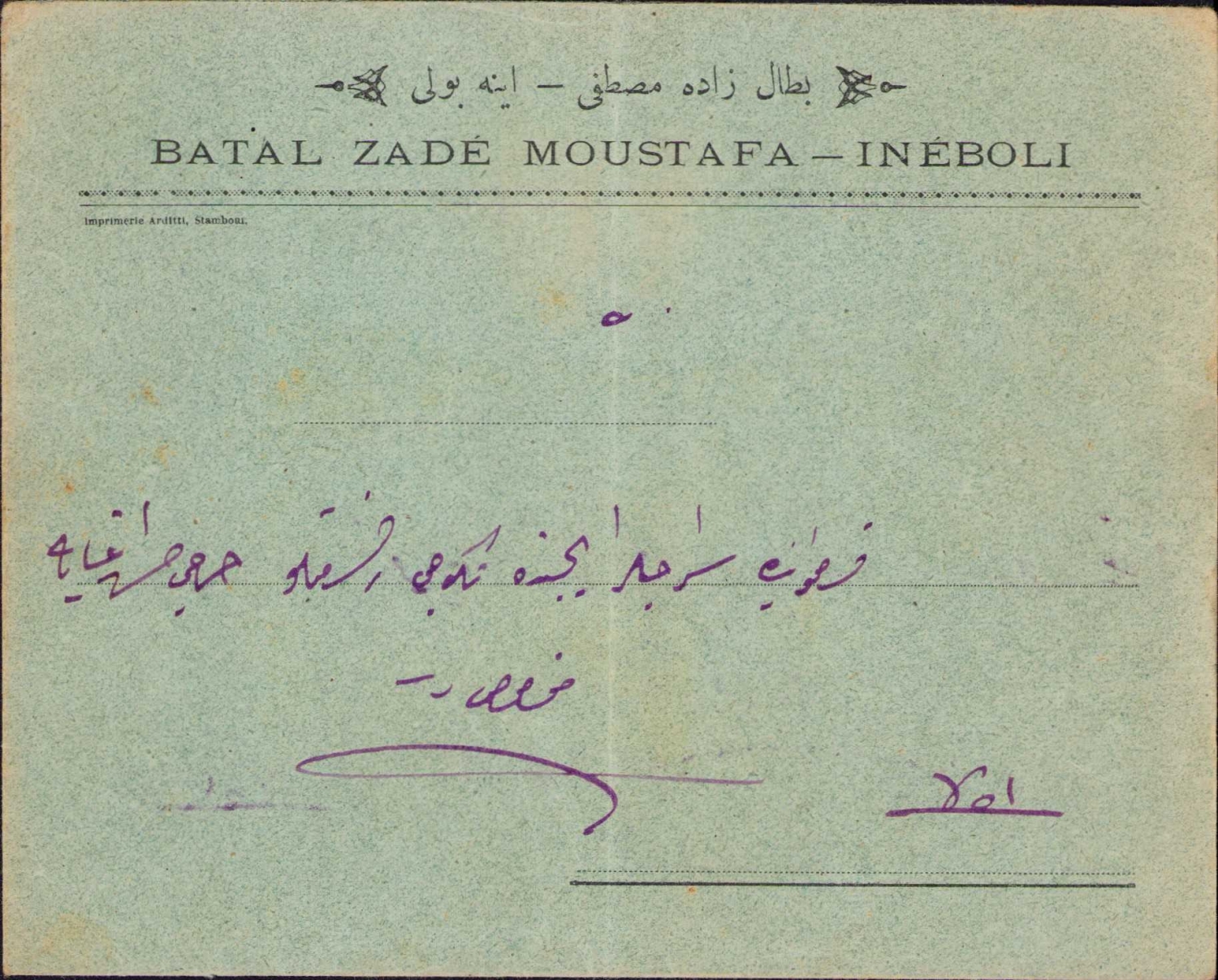 Osmanlıca Battal Zade Mustafa, İnebolu antetli zarf, 14x11 cm