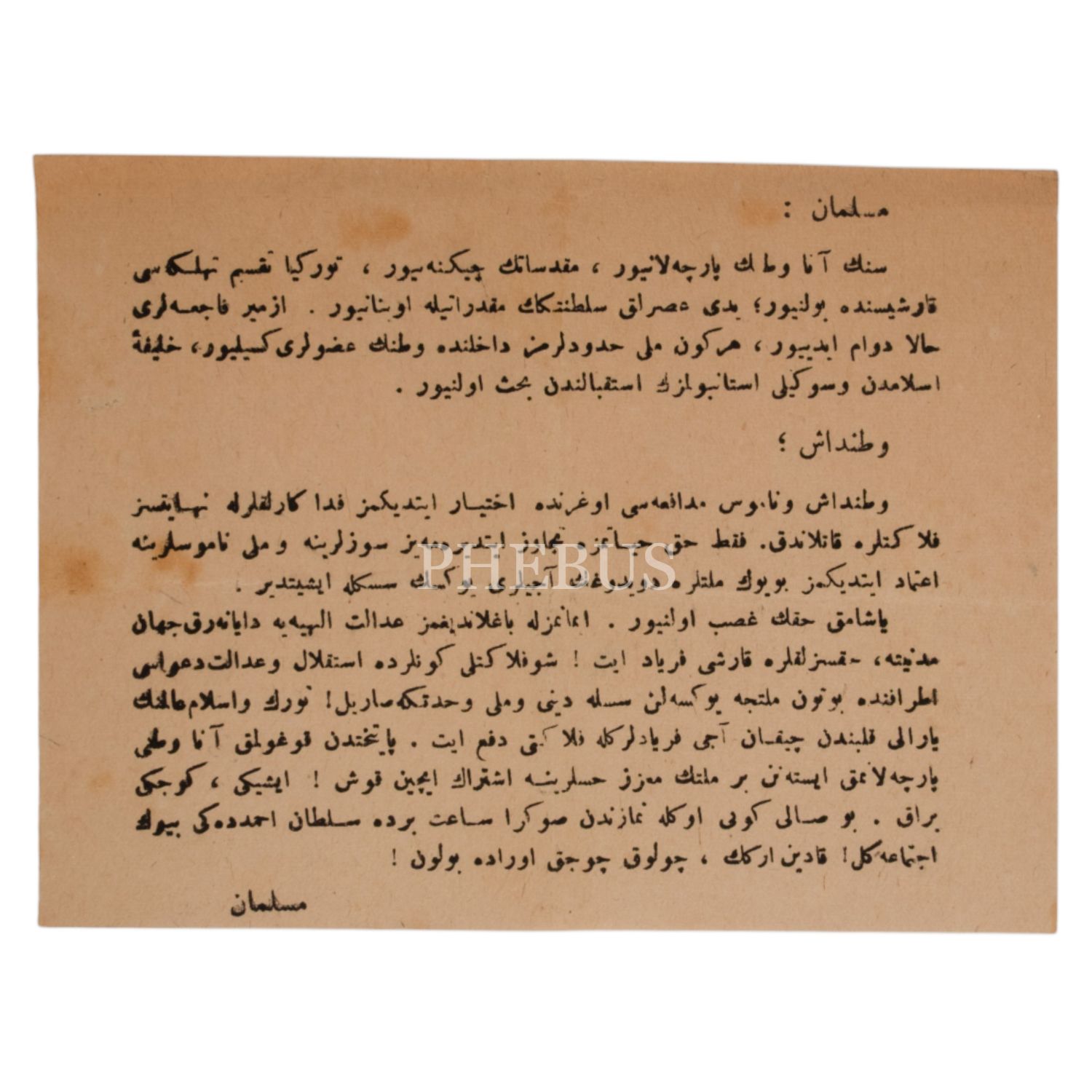 3. "Müslüman" hitabıyla kaleme alınmış, işgal altındaki vatanın savunması için seferberlik çağrısı