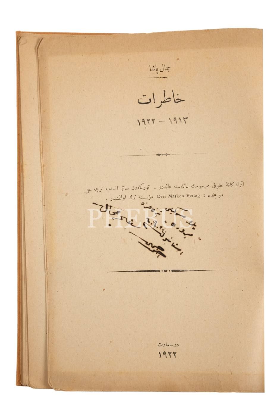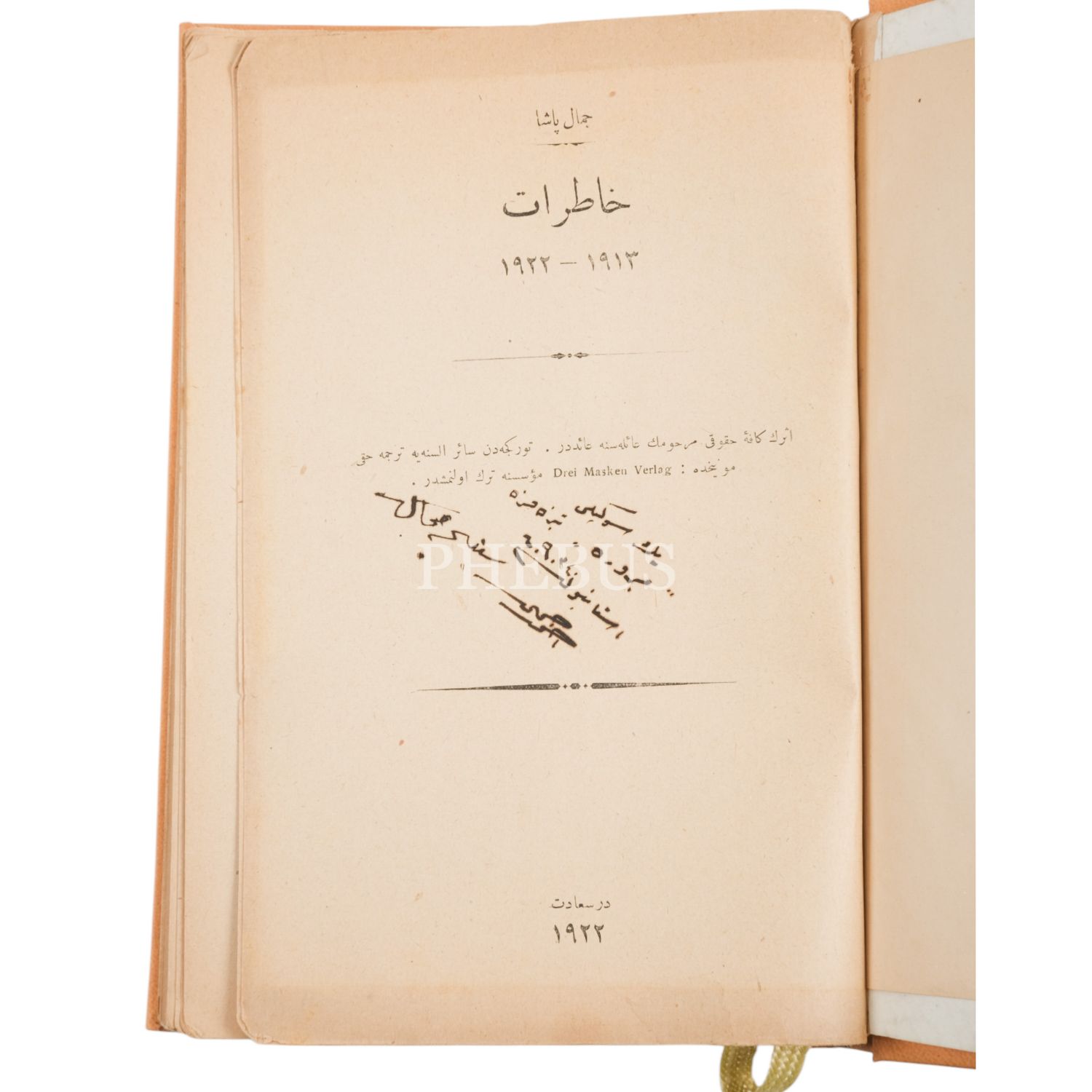 İttihat ve Terakki Cemiyeti´nin üç büyük paşasından biri olan Ahmet Cemal Paşa´nın 1913 yılından başlayarak 1922 yılına kadar devam eden hatıralarını kaleme aldığı eserinin, kendisi ve eşi Seniha Cemal´den "Pek sevgili Mebrure teyzemiz" ithafıyla imzalanmış nüshası...