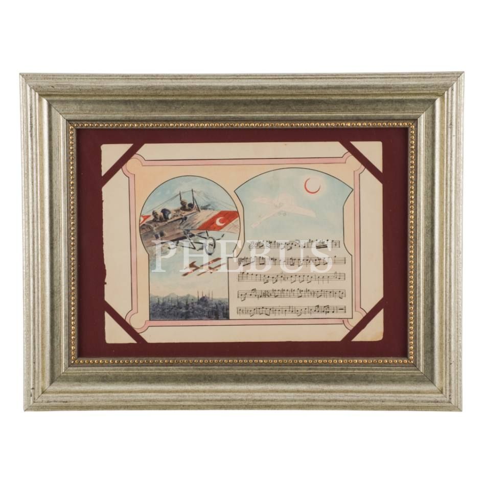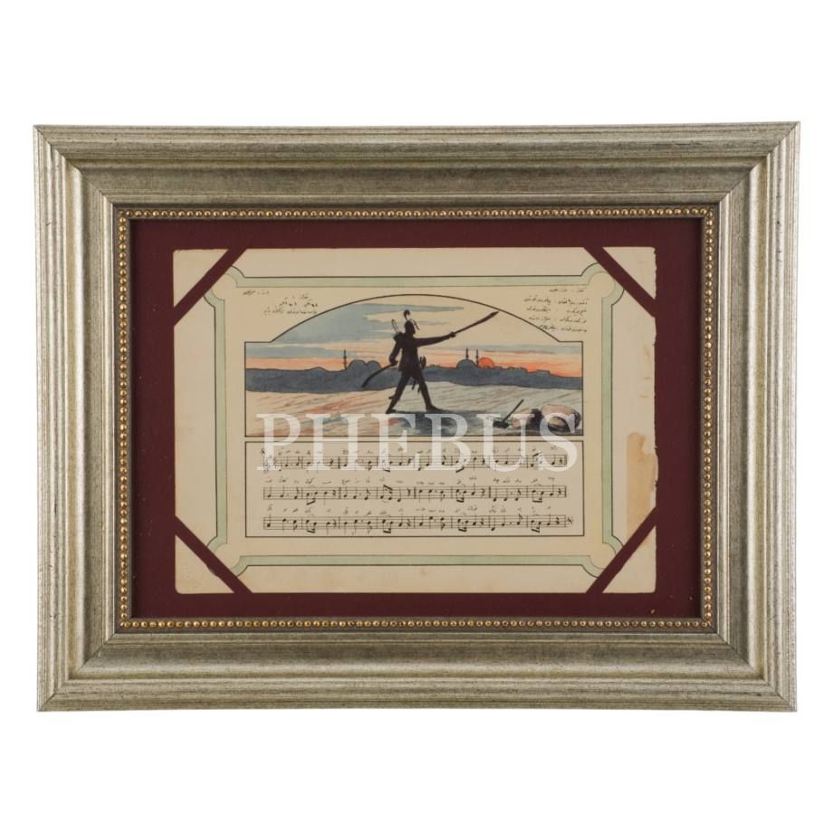 Bestesi ve güftesi Mehmet Halis´e ait Sancak Marşı ve Balkan Harbi´ni konu alan Balkan Marşı´nın notalarının ve sözlerinin yazılı olduğu, ayrıca içeriğe uygun, özgün desenlerin çizildiği, elle hazırlanmış sayfalar, 4 sayfa, 26x18 cm...