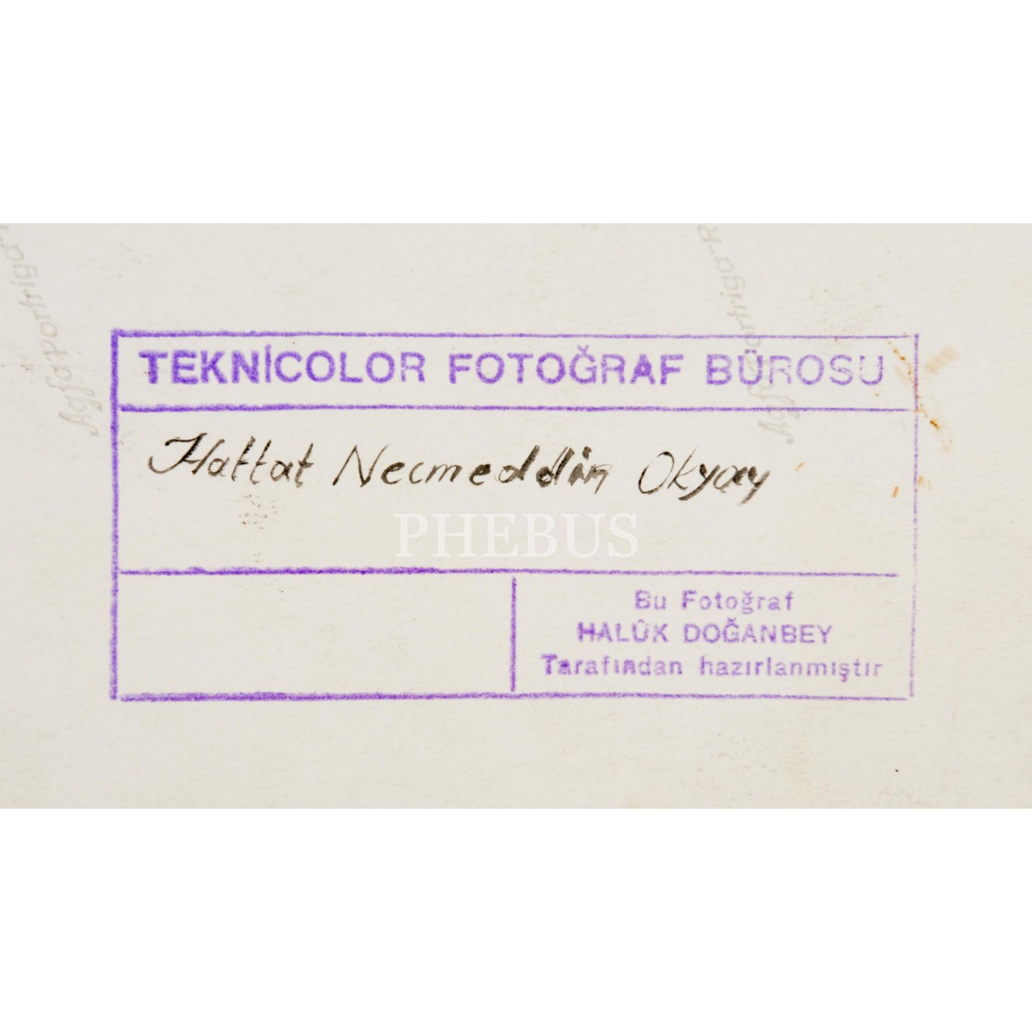 Necmeddin Okyay'ın kendi yazdığı eşsiz bir levha önünde yazı meşk ederken çekilmiş fotoğrafı, 17x23 cm...
