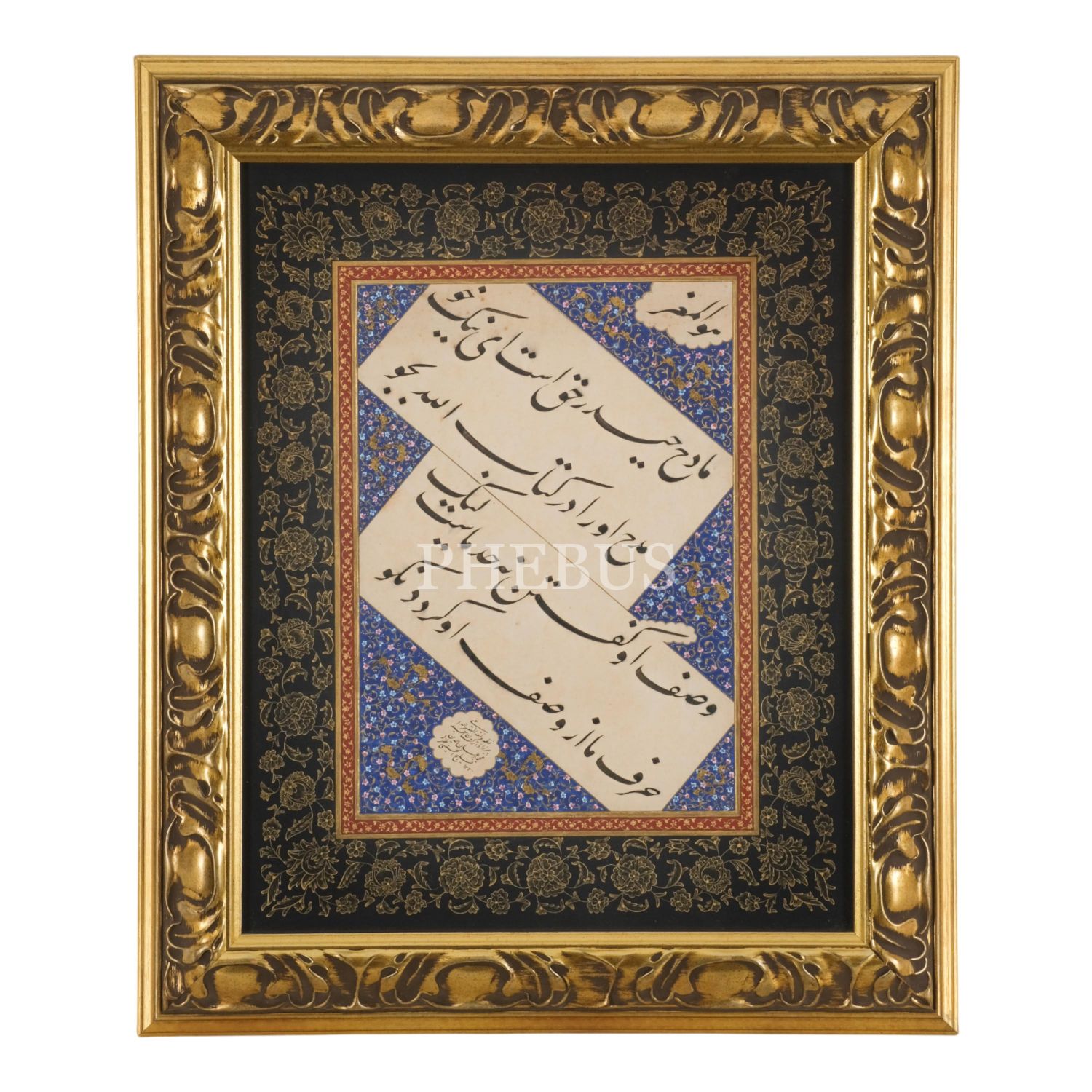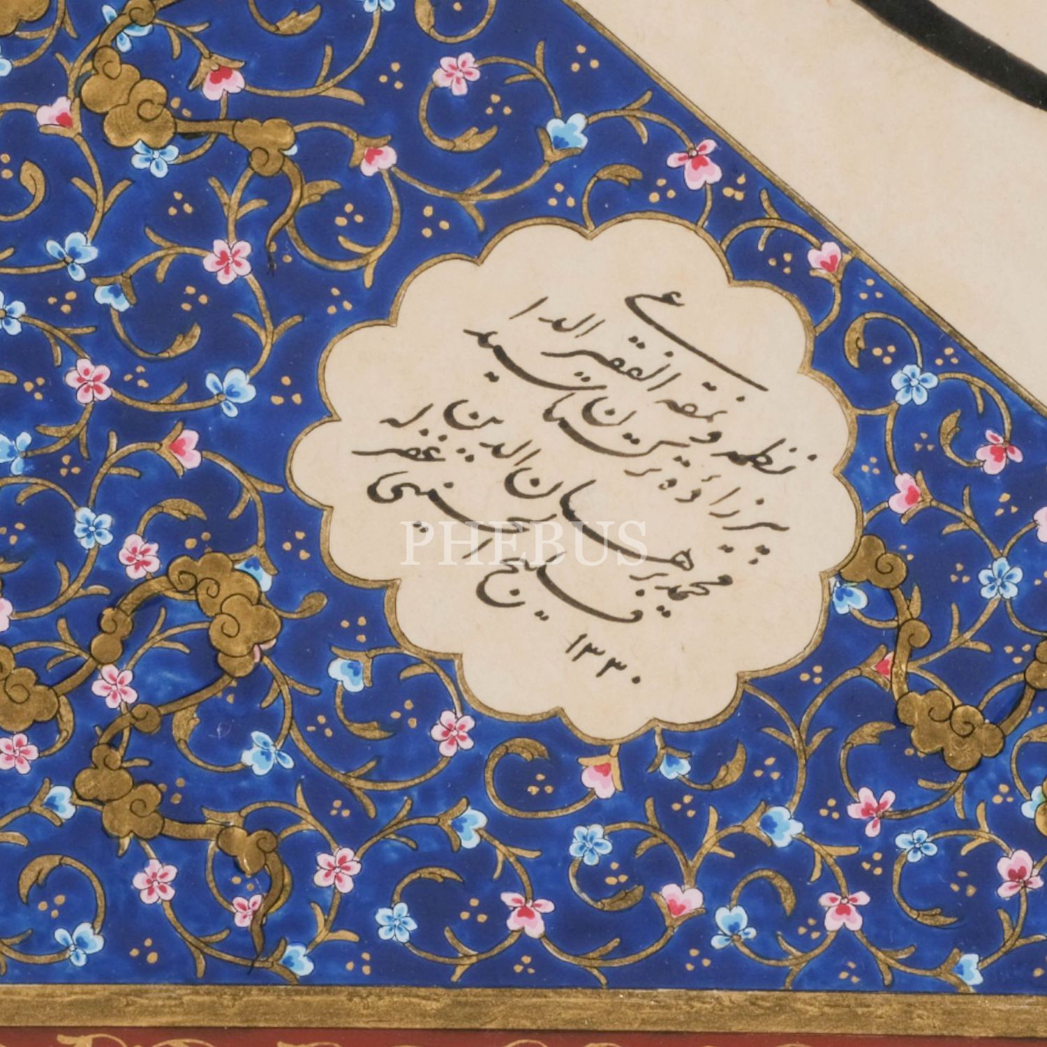 Burhaneddin Belhî ketebeli Farsça talik mail kıta, 1330 tarihli, tezhipli, yazı ölçü: 27x39 cm, çerçeve içi ölçü: 45x56 cm...