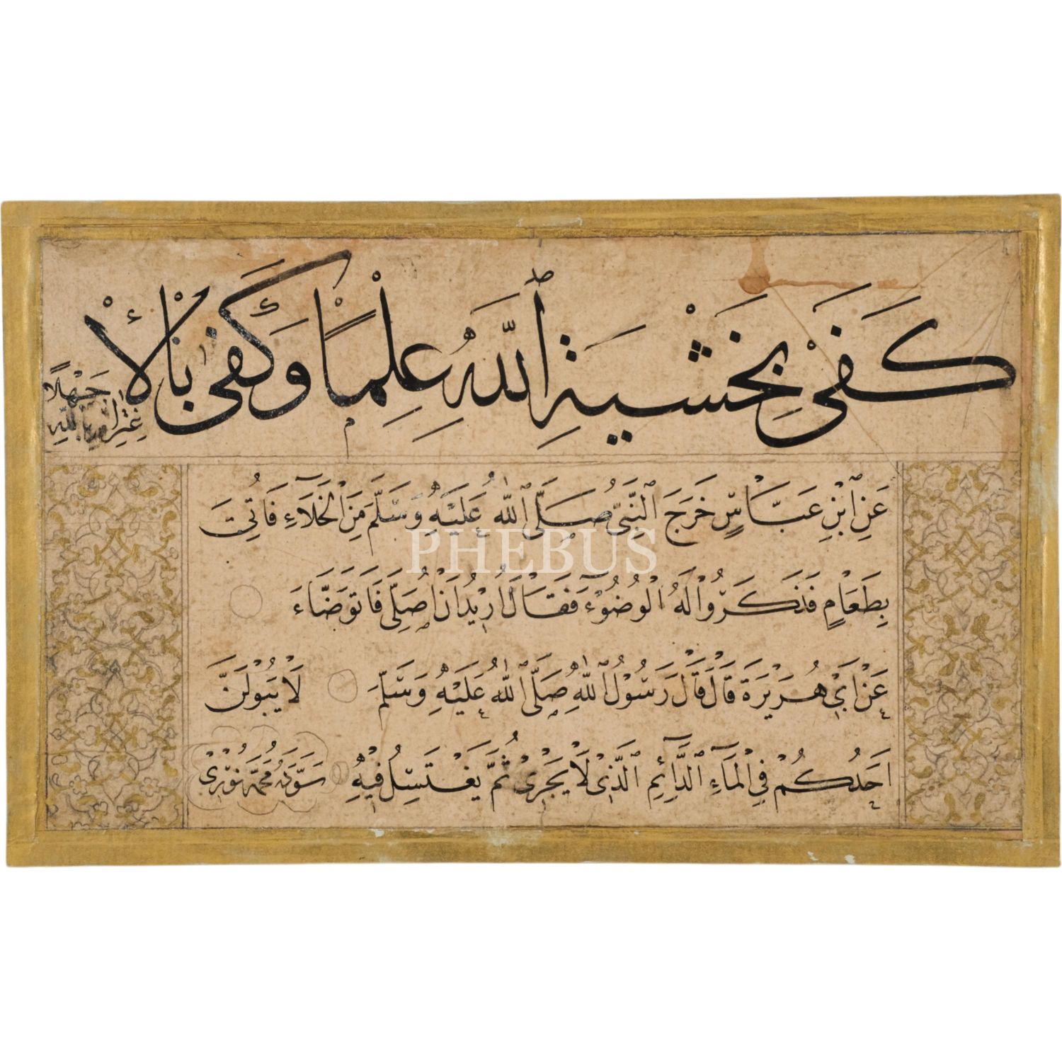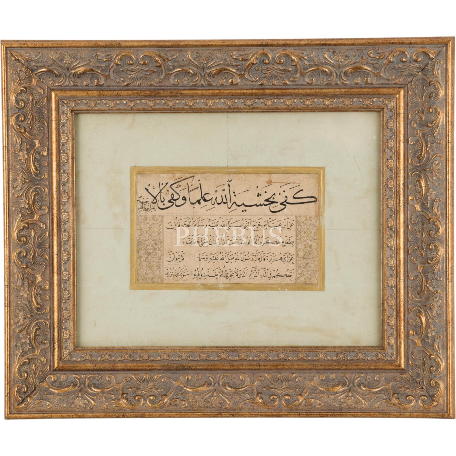 Hadis-i şerif. Okunuşu: "Kefâ bihaşyeti´llâhi ilmen ve kefâ bi´l-iğtirâri billâhi cehlen" Anlamı: "İnsana ilim olarak Allah korkusu, cehalet olarak da Allah´ı bilmemesi yeter" Hattatın ketebesinden ve kaleminden hangi Mehmed Nuri olduğu anlaşılamasa da mahir bir hattat olduğu bellidir.