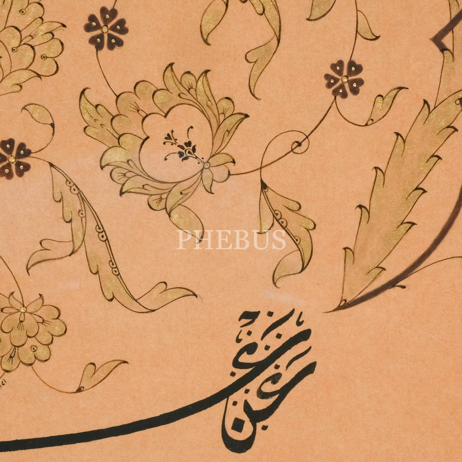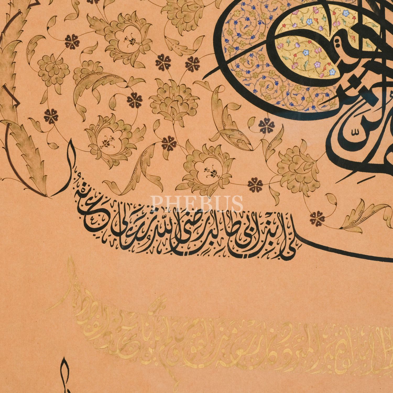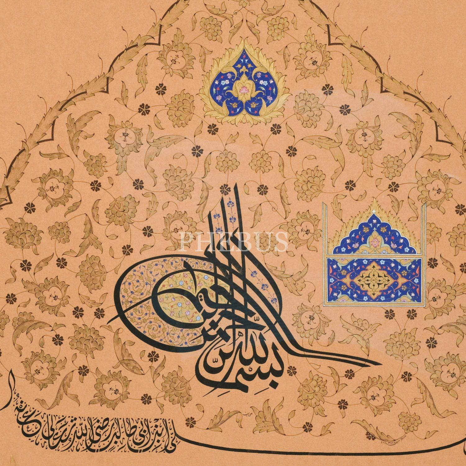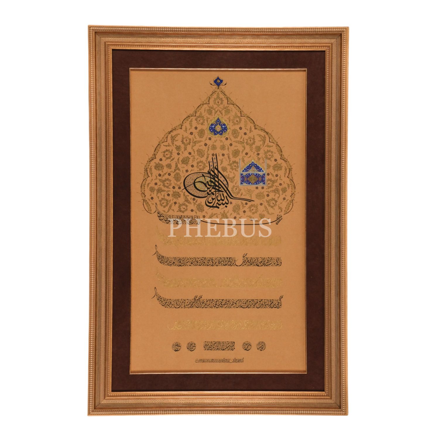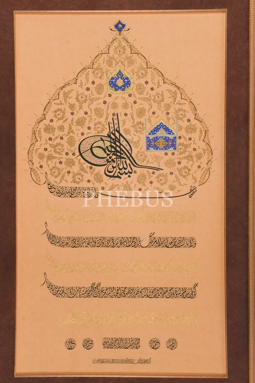Turan Sevgili ketebeli büyük boy celî divânî hilye-i şerife, hicrî 1436 tarihli, tezhibi Müzeyyen Yazıcı imzalı, yazı ölçü: 55x95 cm, çerçeve ölçü: 81x121 cm...