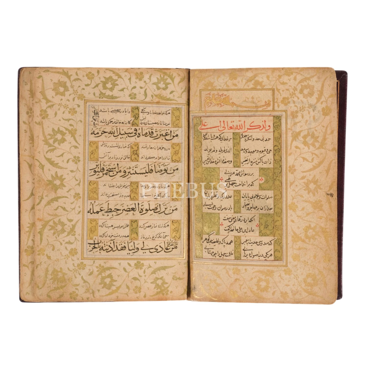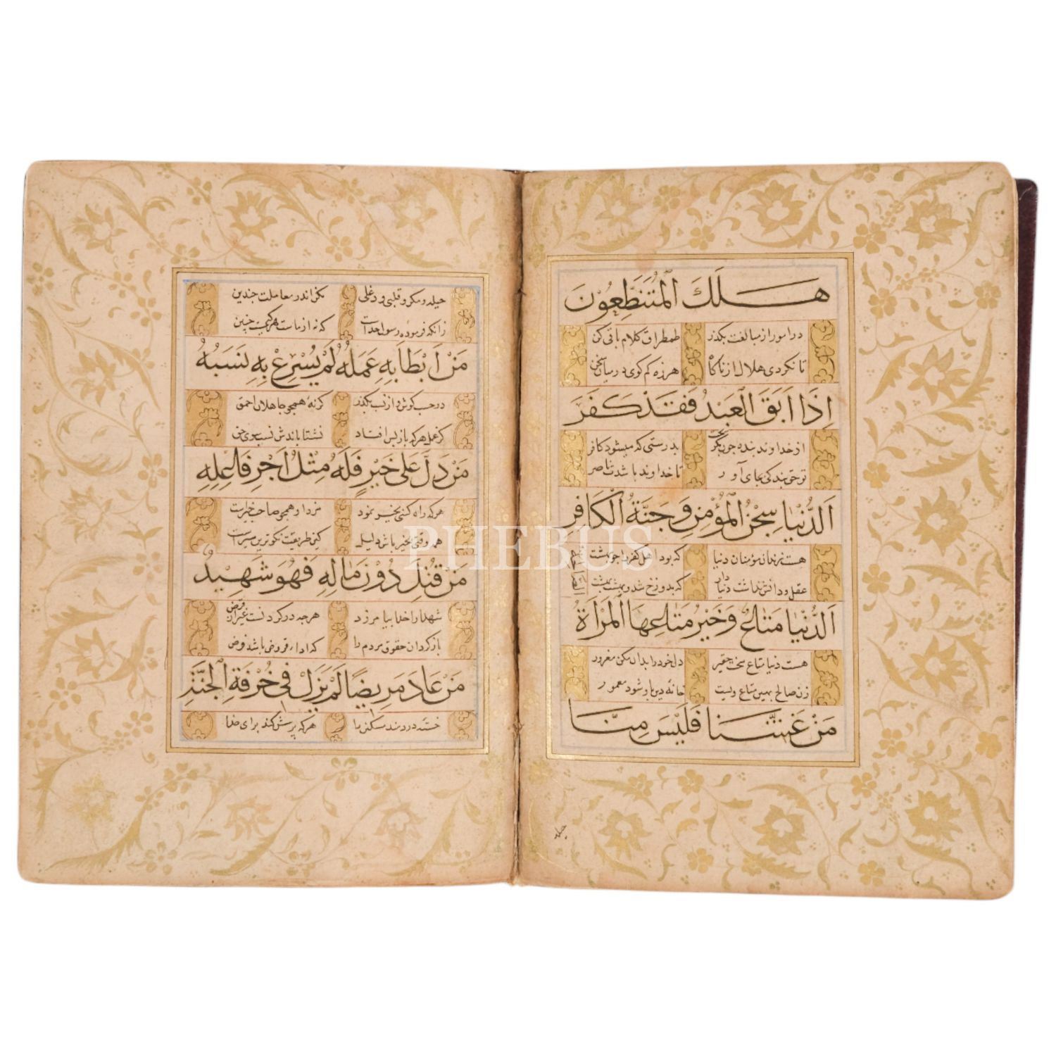 Bütün sayfaları tezhipli, mavi ve altın cetvelli, tahrirli, baş sayfası müselsel altın besmeleli ve sayfa kenarları çiçek desenleriyle bezelidir. Deri dönem cildinde, zencerekli ve şemsesinde mâkılî hattıyla "Allah Muhammed" yazılıdır. Metin Sülüs ve nesih yazıyla siyah mürekkeple yazılmıştır. Arapça ibareler altınla tahrirlenmiştir.