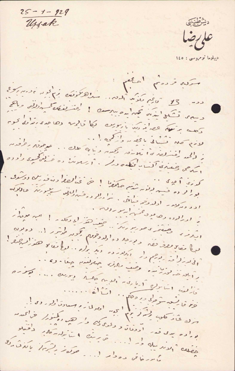 Osmanlıca Diş tabibi Ali Rıza antetli mektup,1929 Uşşak, Ali Rıza imzalı, 13x20 cm