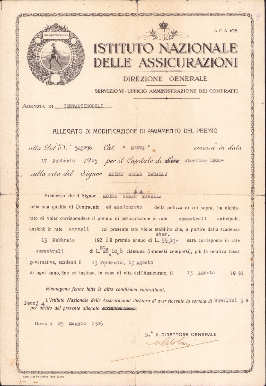 İtalyanca Istituto Nazionale Delle Assicurazioni Direzione Generale antetli 1926 tarihli döküman