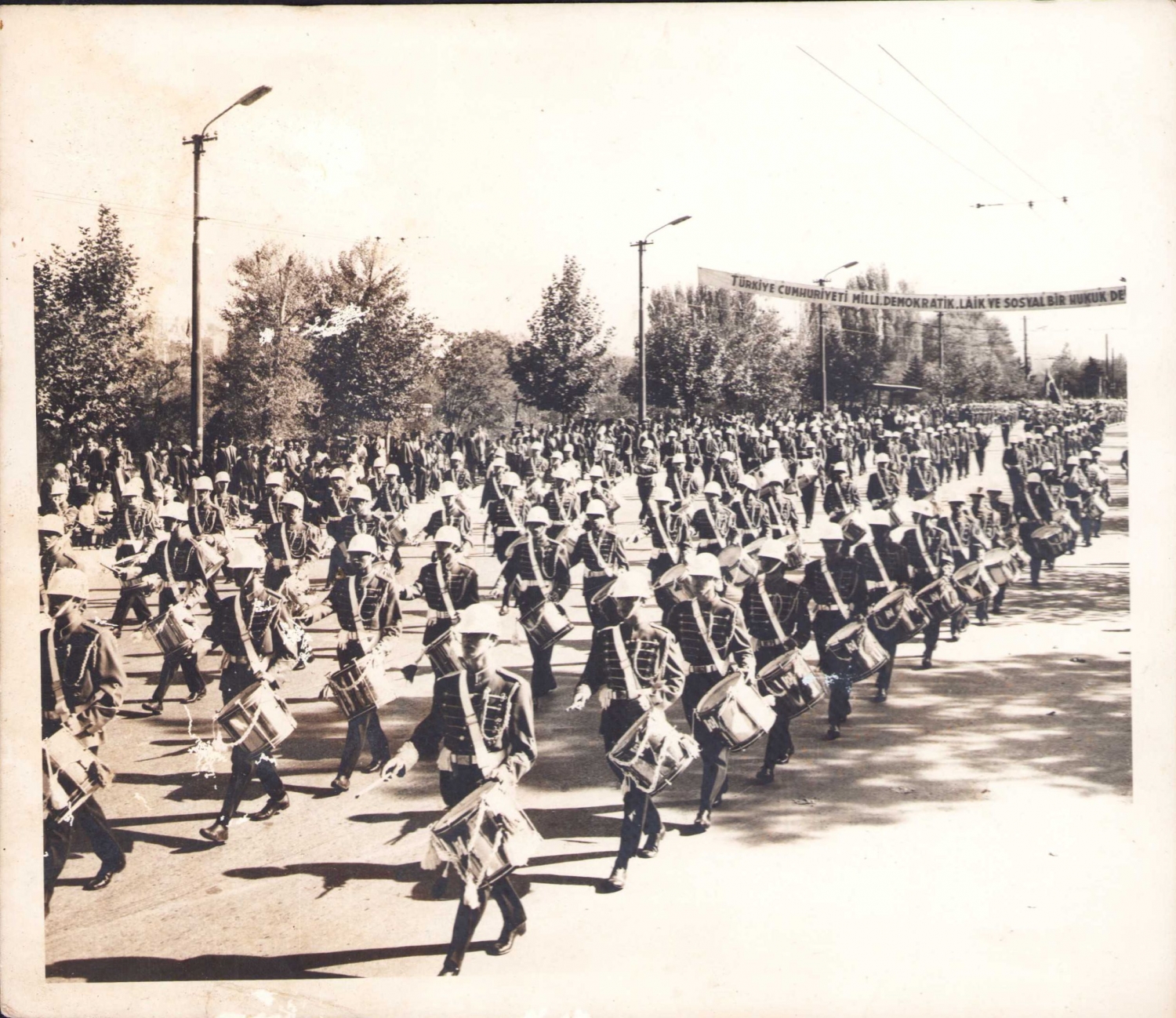 Bando takımı geçit, pankart: "Türkiye Cumhuriyeti Milli, Demokratik, Laik ve Sosyal Bir Hukuk Devletidir", 20x17 cm