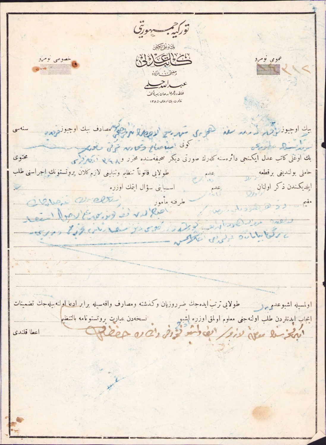 Osmanlıca Türkiye Cumhuriyeti Beyoğlu İkinci Katip Adli Abdullah Hilmi antetli Noter belgesi, 18x25 cm