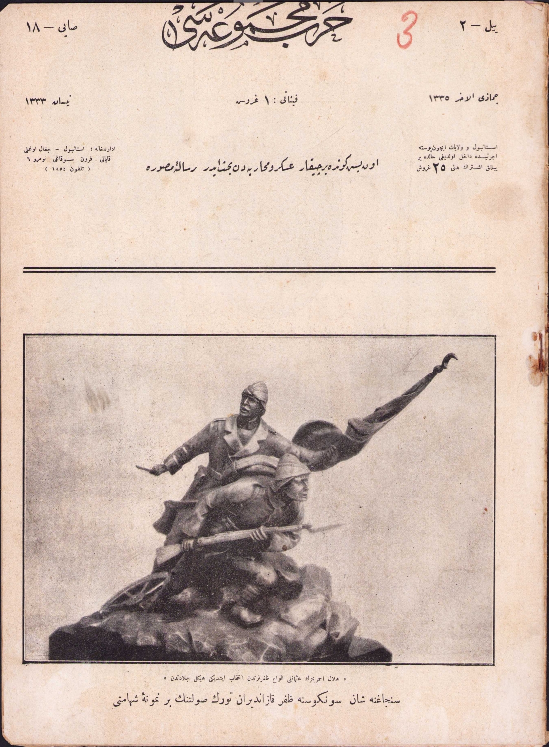 Osmanlıca Harp Mecmuası, 1333, kapak: "Sancağına Şan Süngüsüne Zafer Kazandıran Türk Saltanatının Bir Numune-i Şehameti", resimli, 16 sayfa, sayfalar kopuk, 22x29 cm