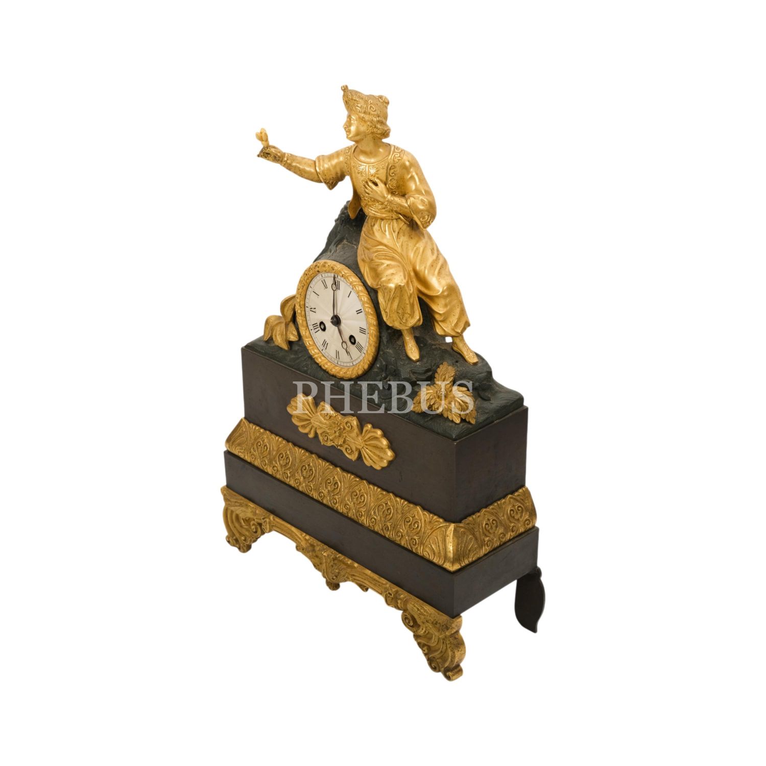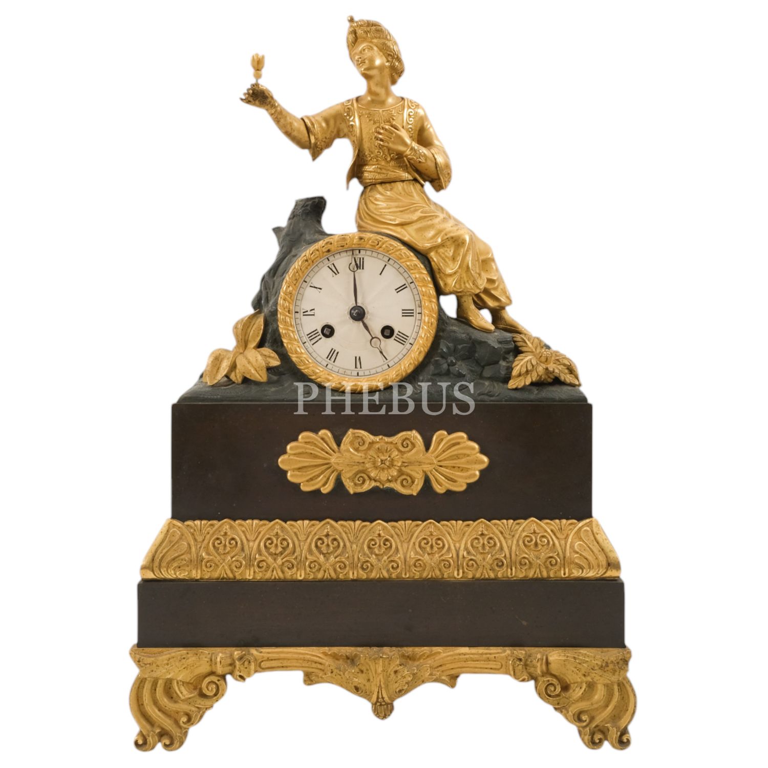 Çiçek uzatan genç dekorlu, kadranı romen rakamlı bronz konsol saat, 40x24x9 cm...