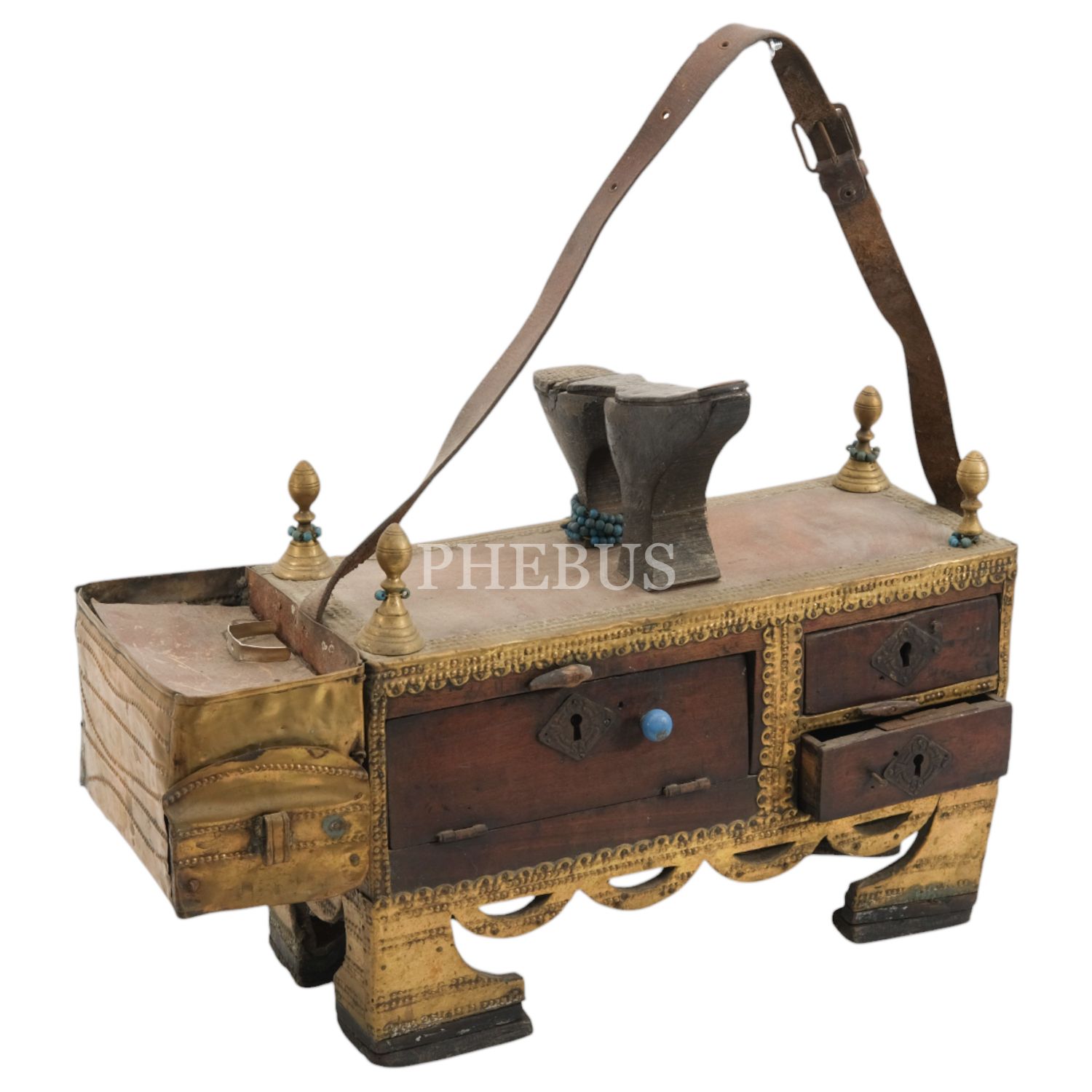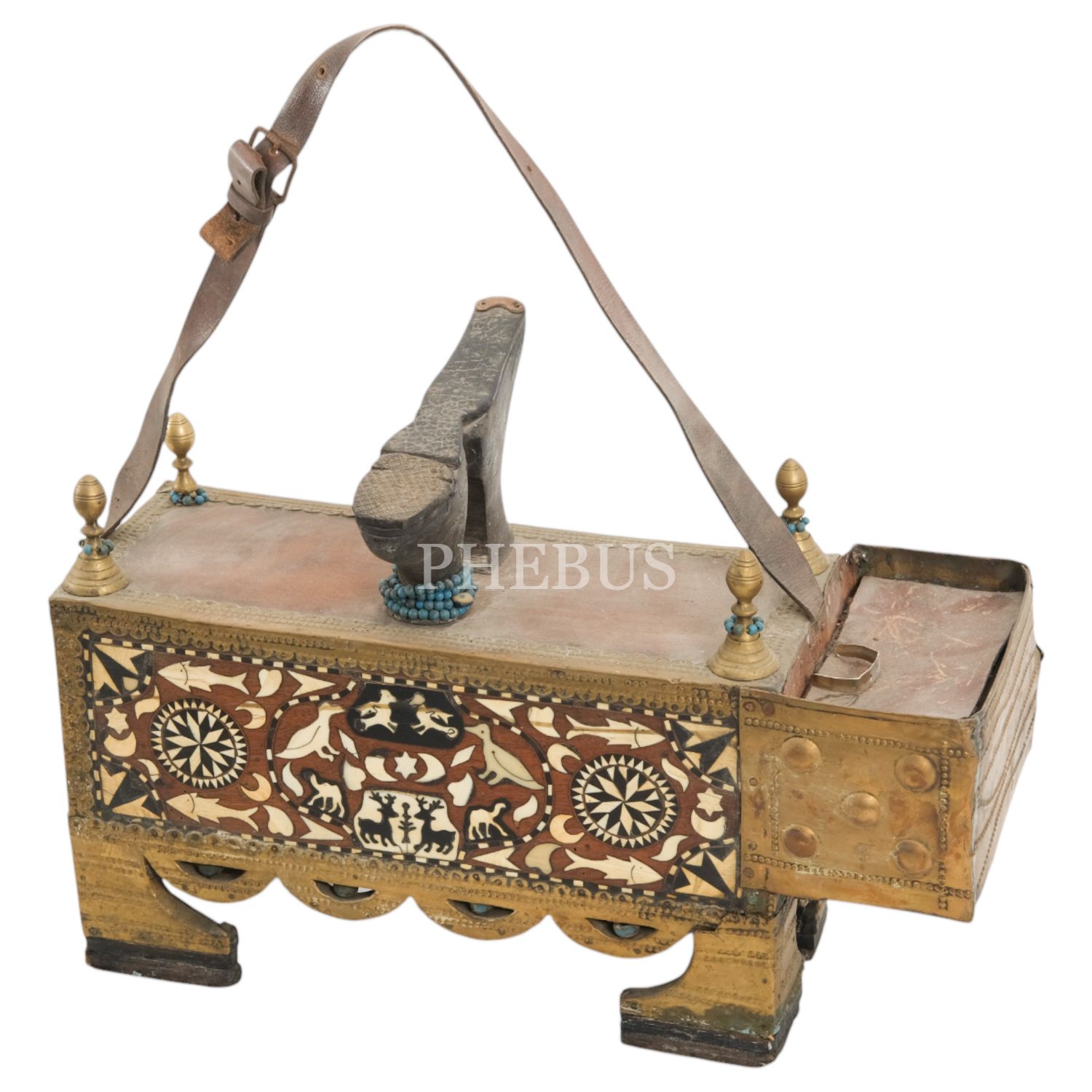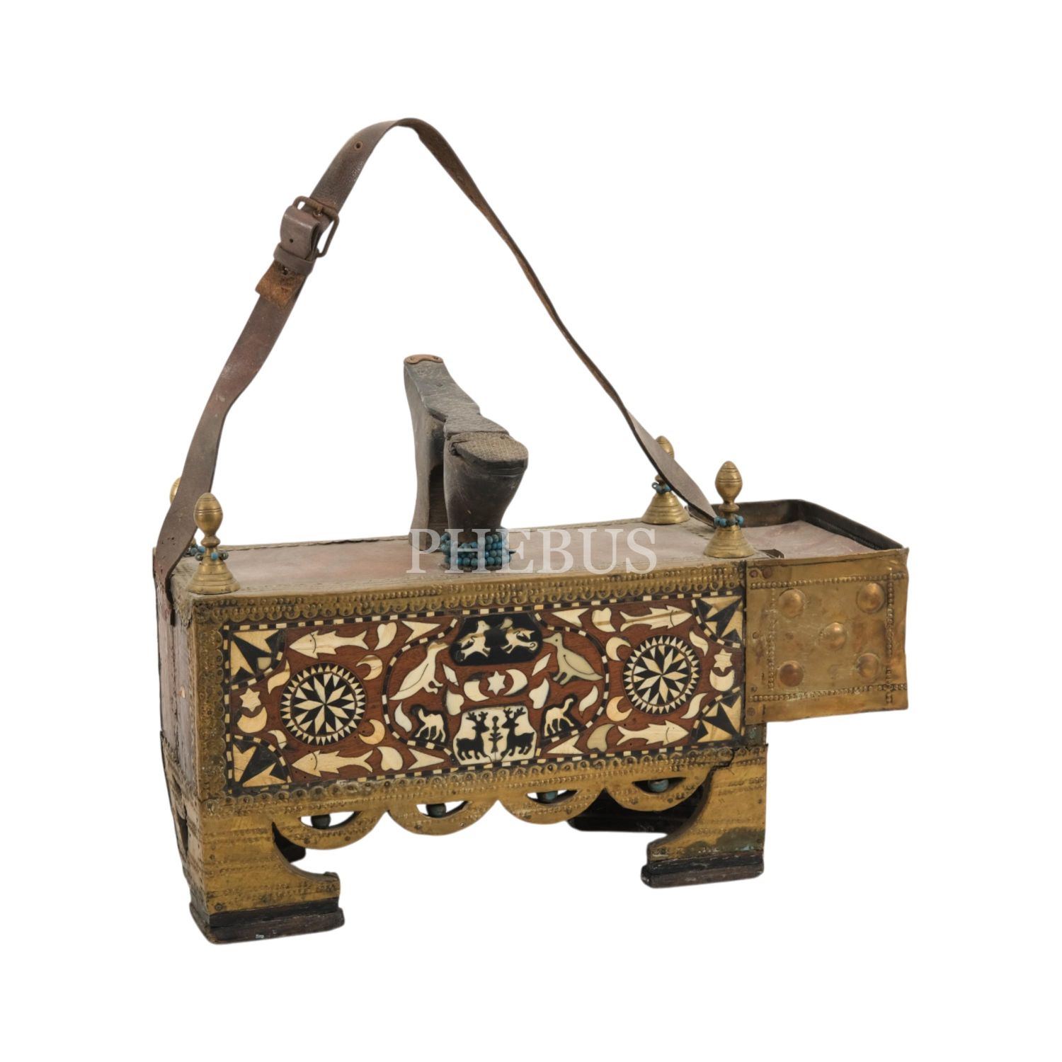 Sedef işçilikle ay-yıldız, deve, kuş ve geyik motifleri işlenmiş, Osmanlı döneminden boyacı sandığı, 53x20x13 cm...