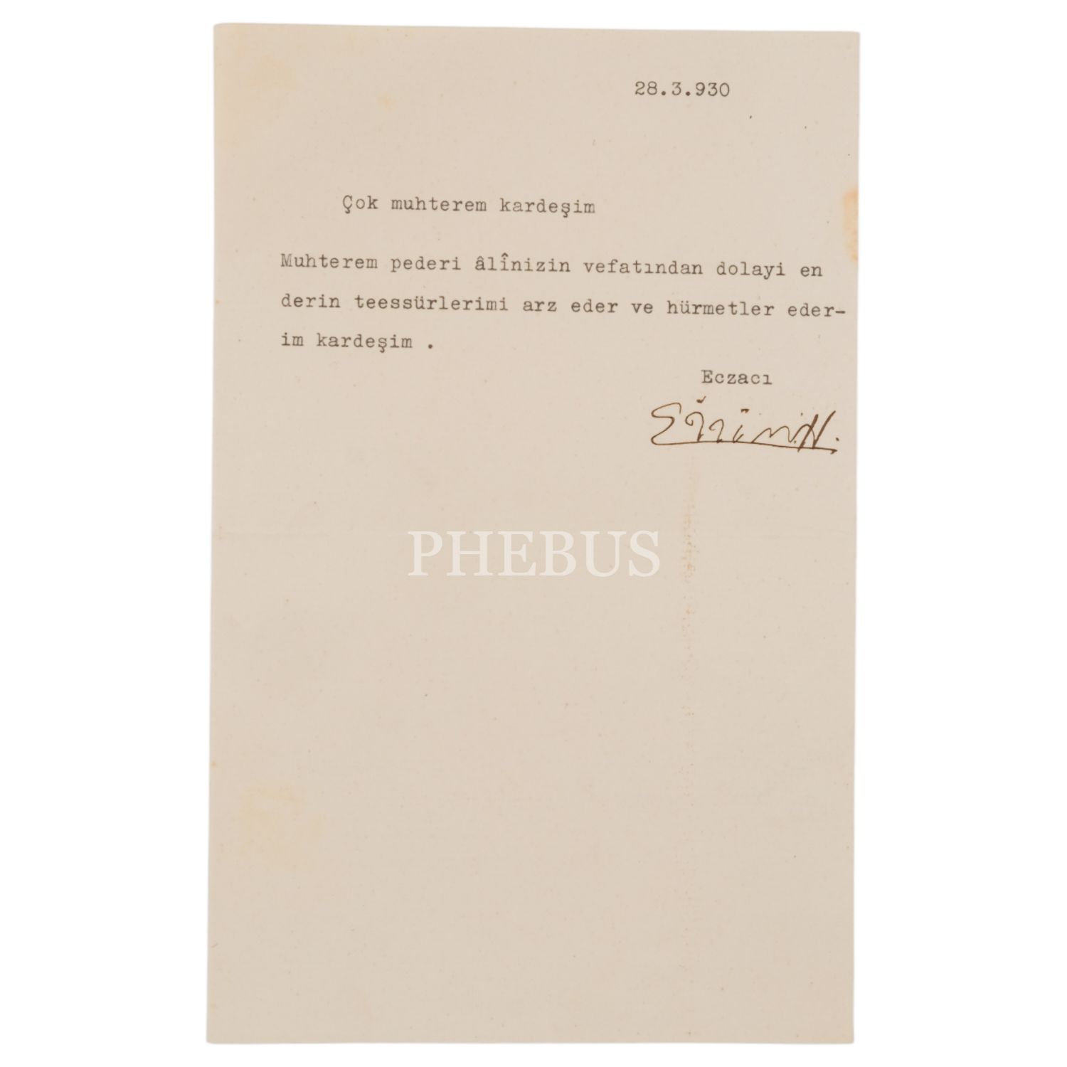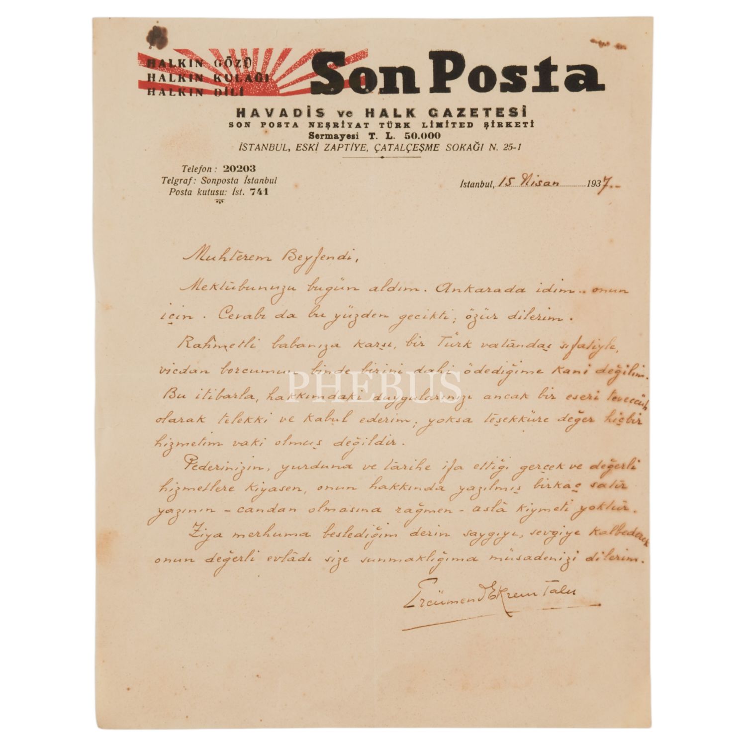 İhtifalci Mehmet Ziya Bey´in oğlu Celal Ergun´a Ercüment Ekrem Talu´dan imzalı yazı,