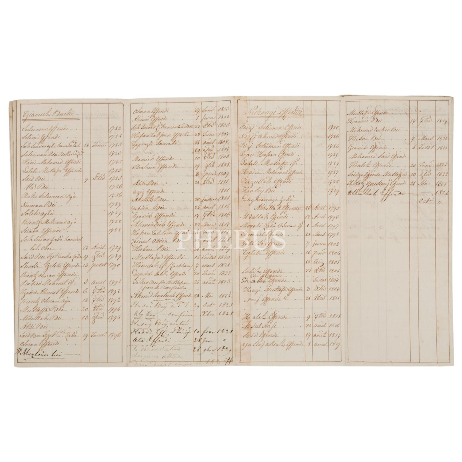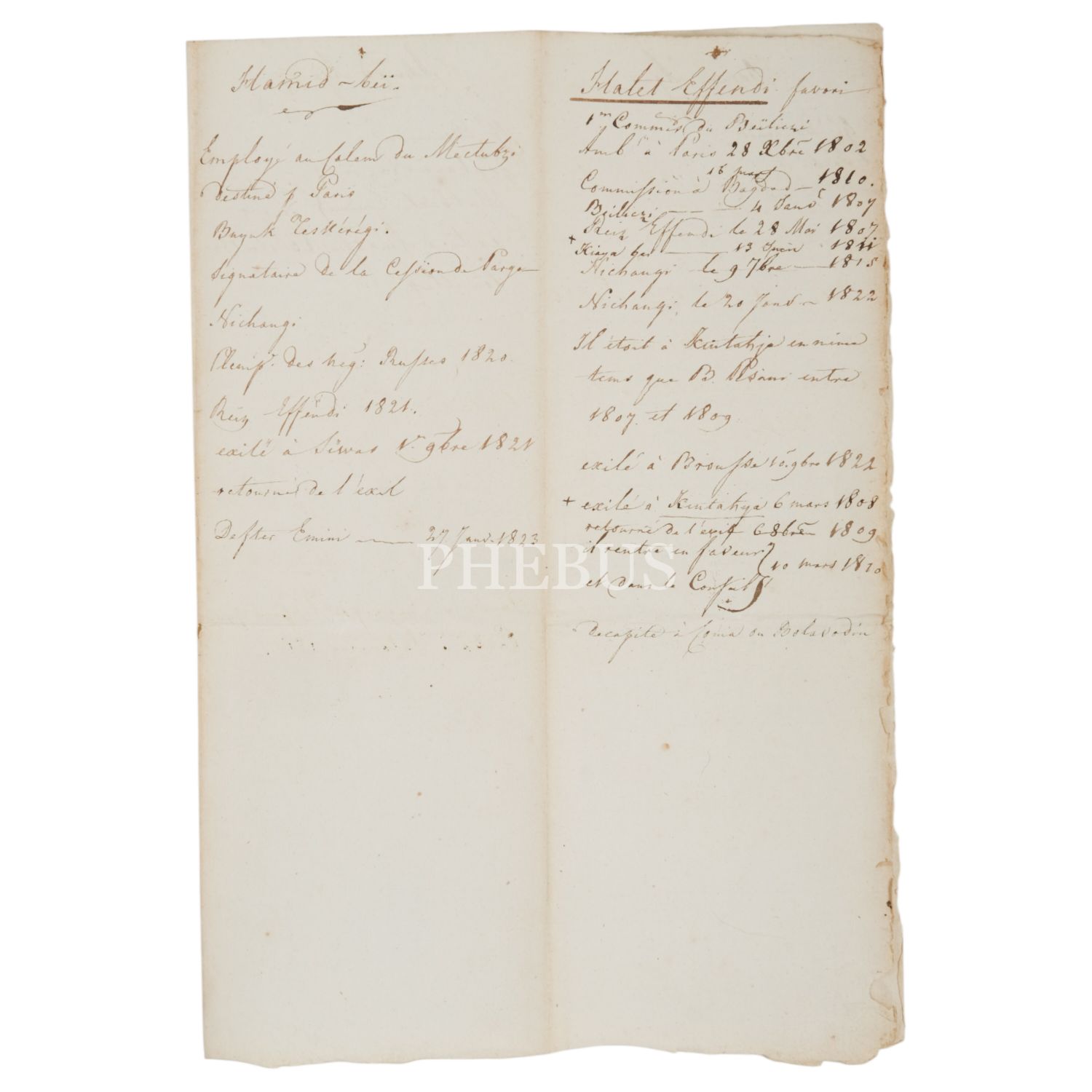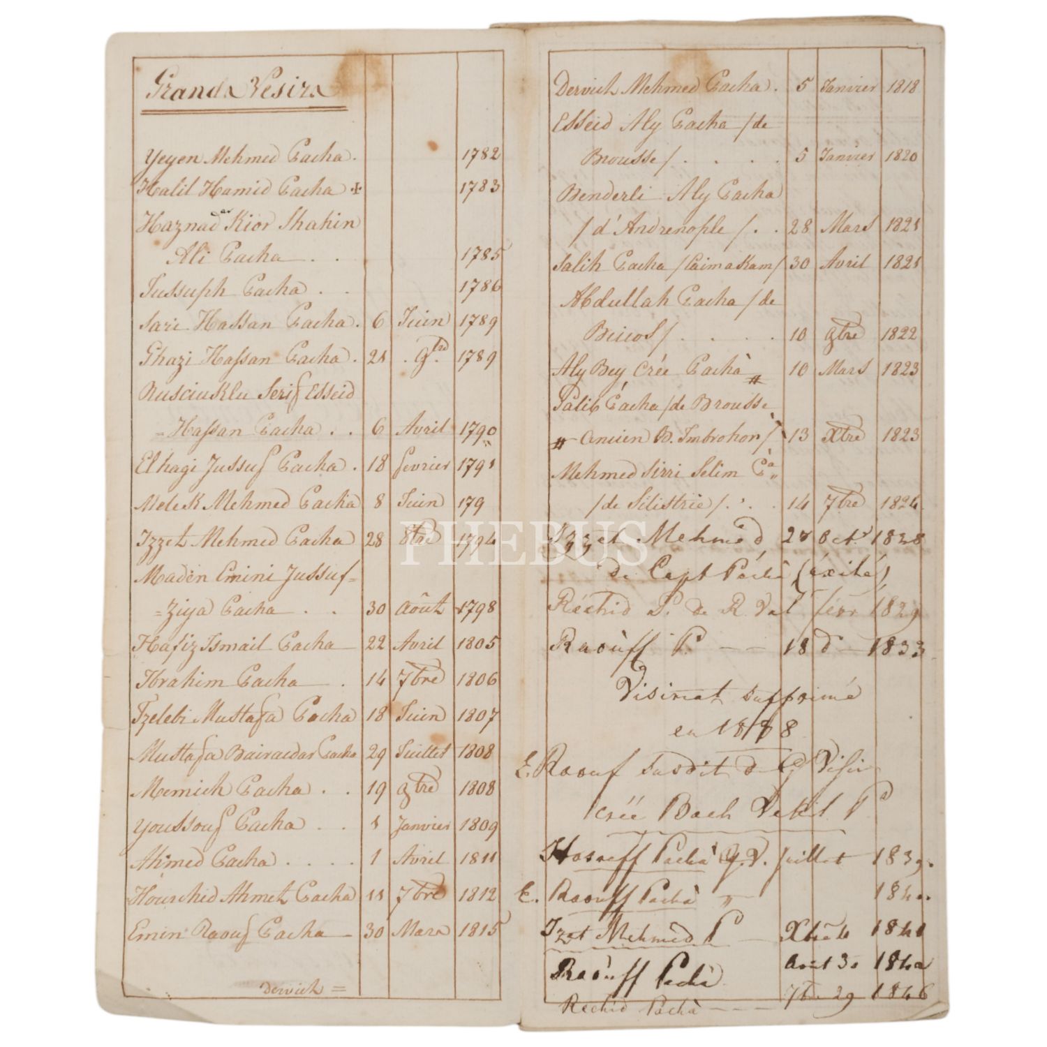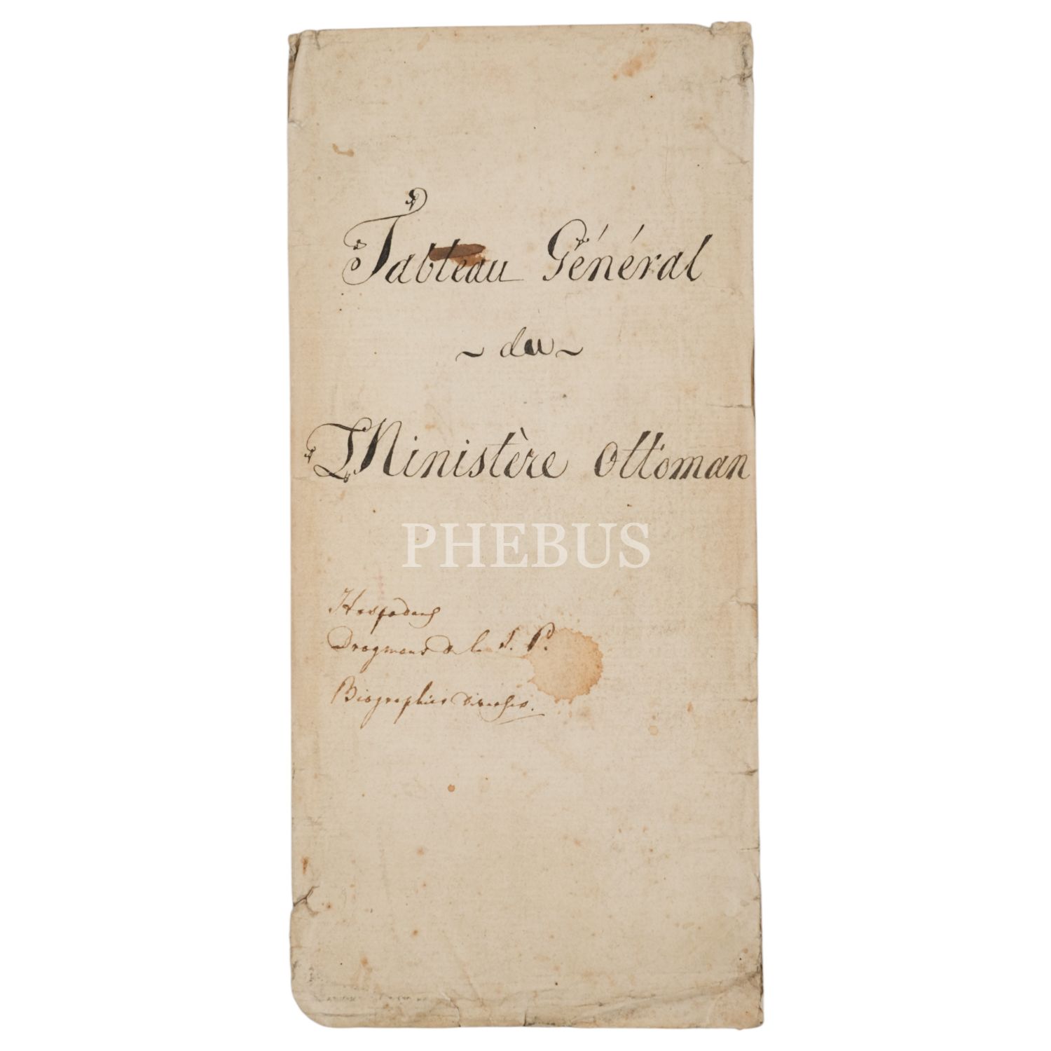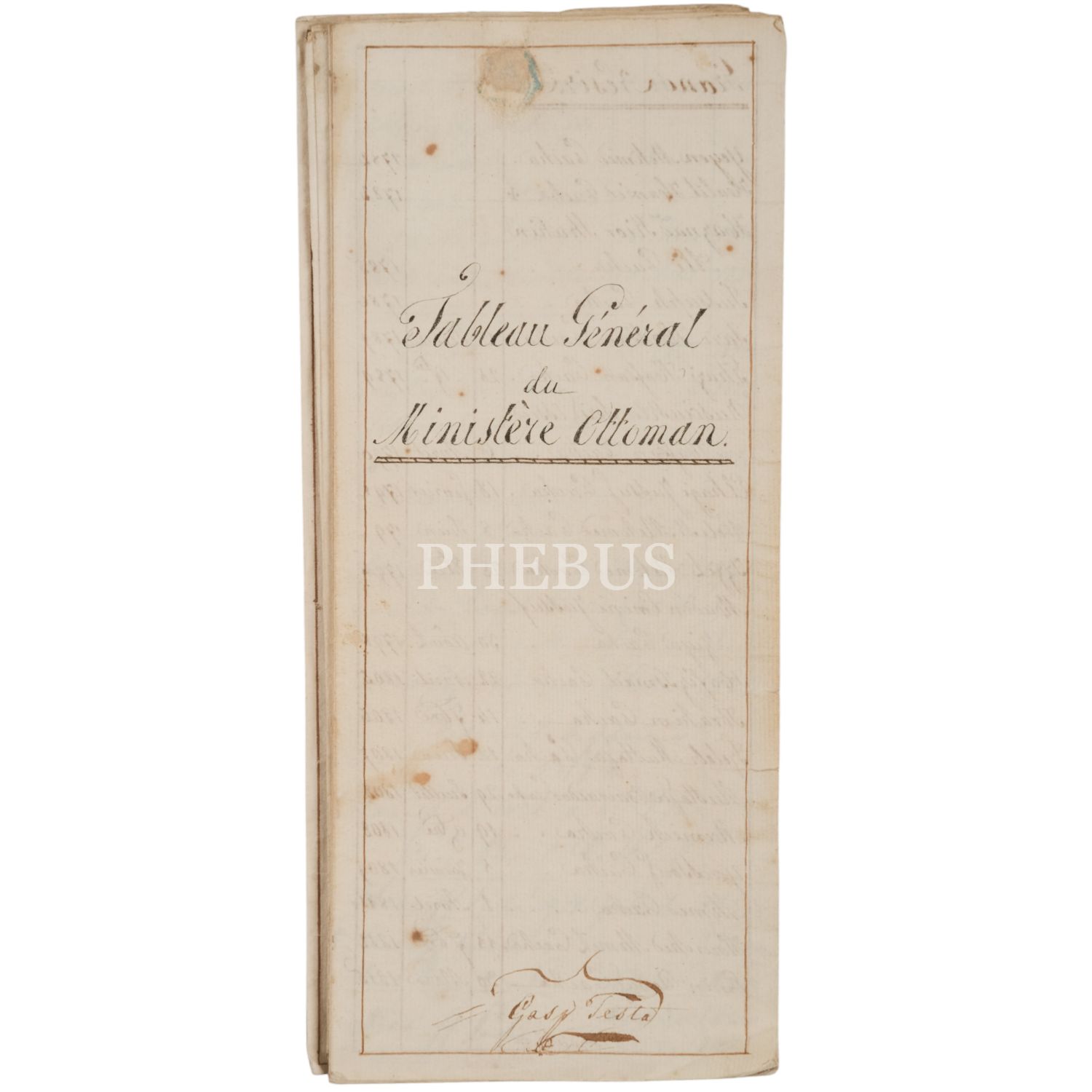 1782 yılından 1846´ya kadar, Osmanlı Devleti´nde önemli görevlerde bulunmuş şahsiyetlerin isimlerinin yer aldığı, el yazısıyla kaleme alınmış "Tableau General du Ministere Ottoman" başlıklı liste ve bu listede yer alan bazı şahsiyetlerin biyografilerinin yazılı olduğu sayfalar...