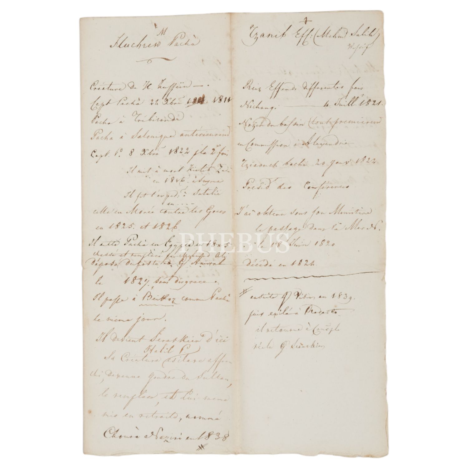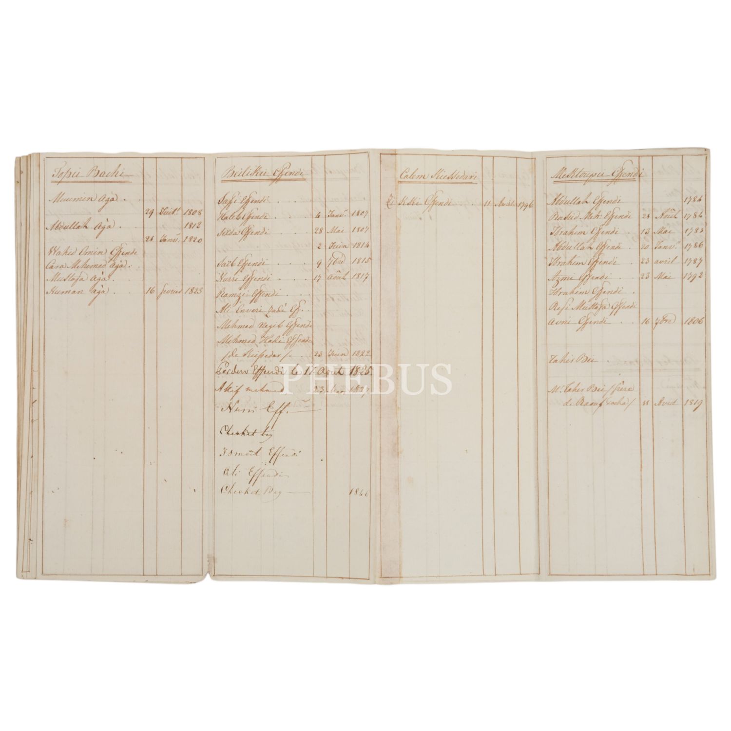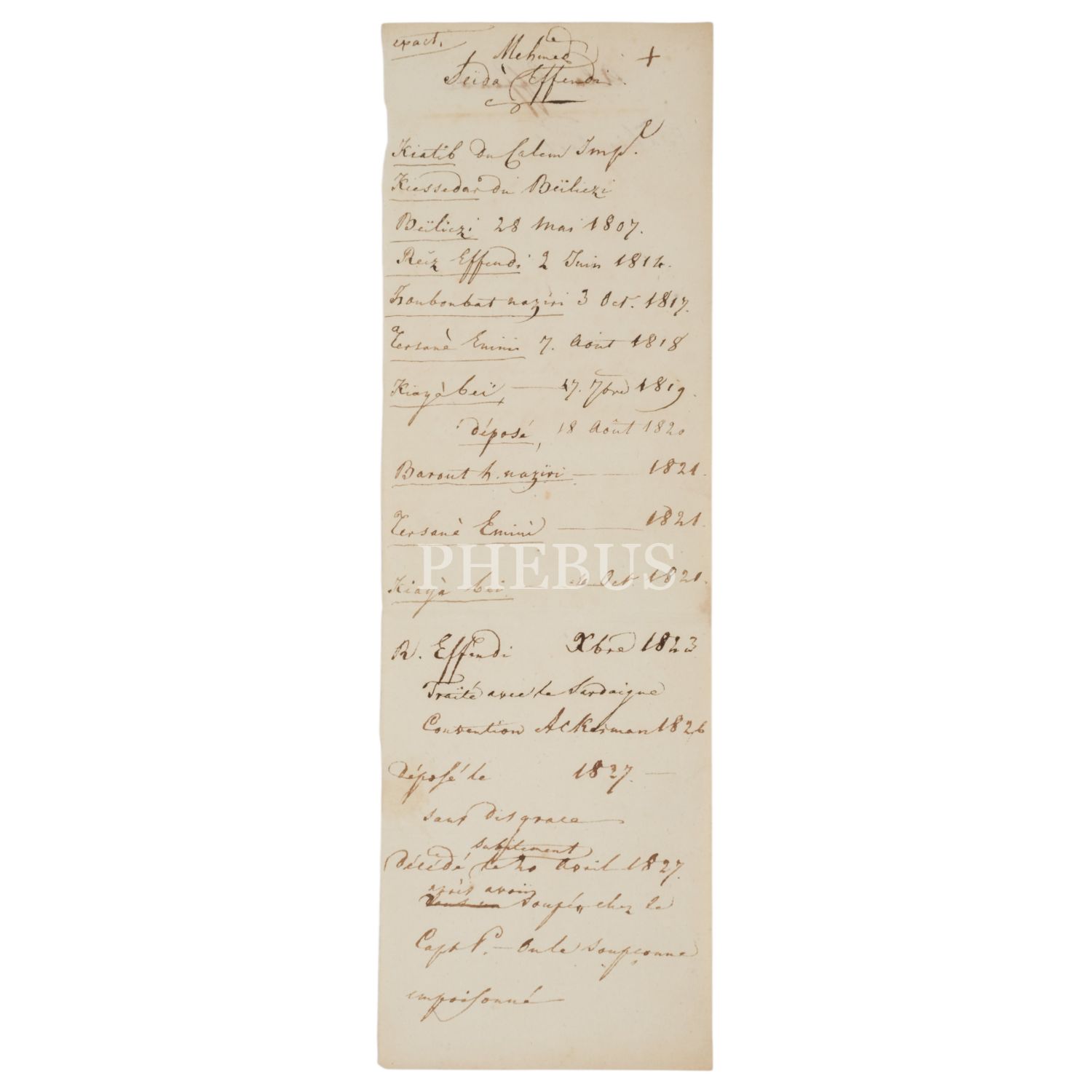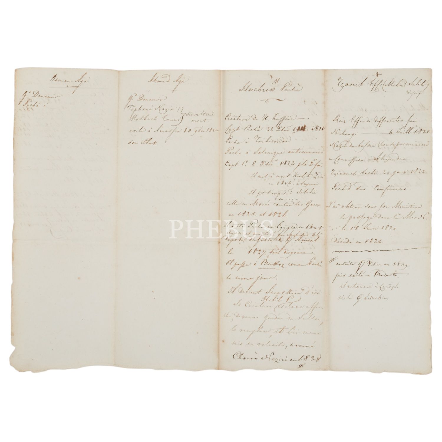1782 yılından 1846´ya kadar, Osmanlı Devleti´nde önemli görevlerde bulunmuş şahsiyetlerin isimlerinin yer aldığı, el yazısıyla kaleme alınmış "Tableau General du Ministere Ottoman" başlıklı liste ve bu listede yer alan bazı şahsiyetlerin biyografilerinin yazılı olduğu sayfalar...