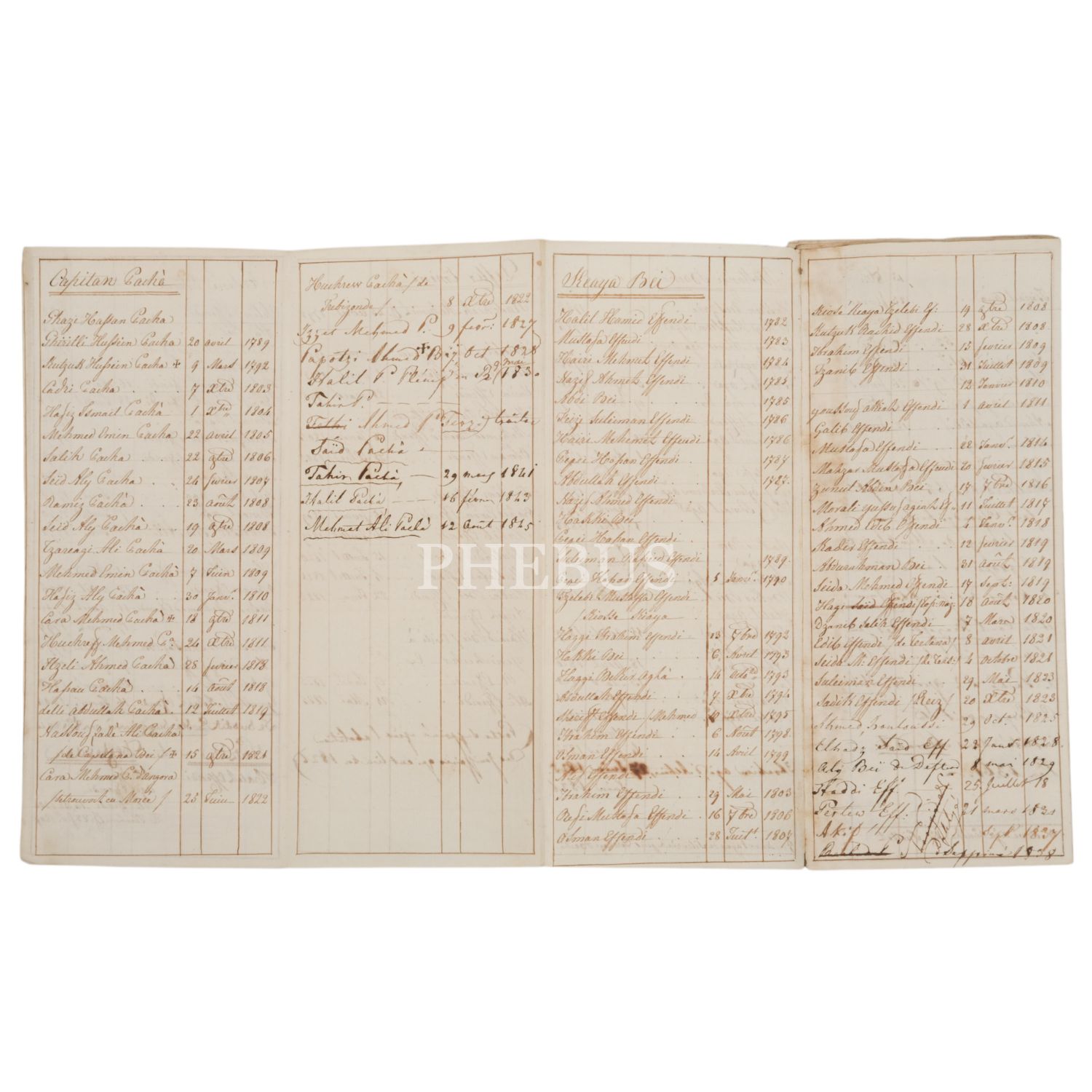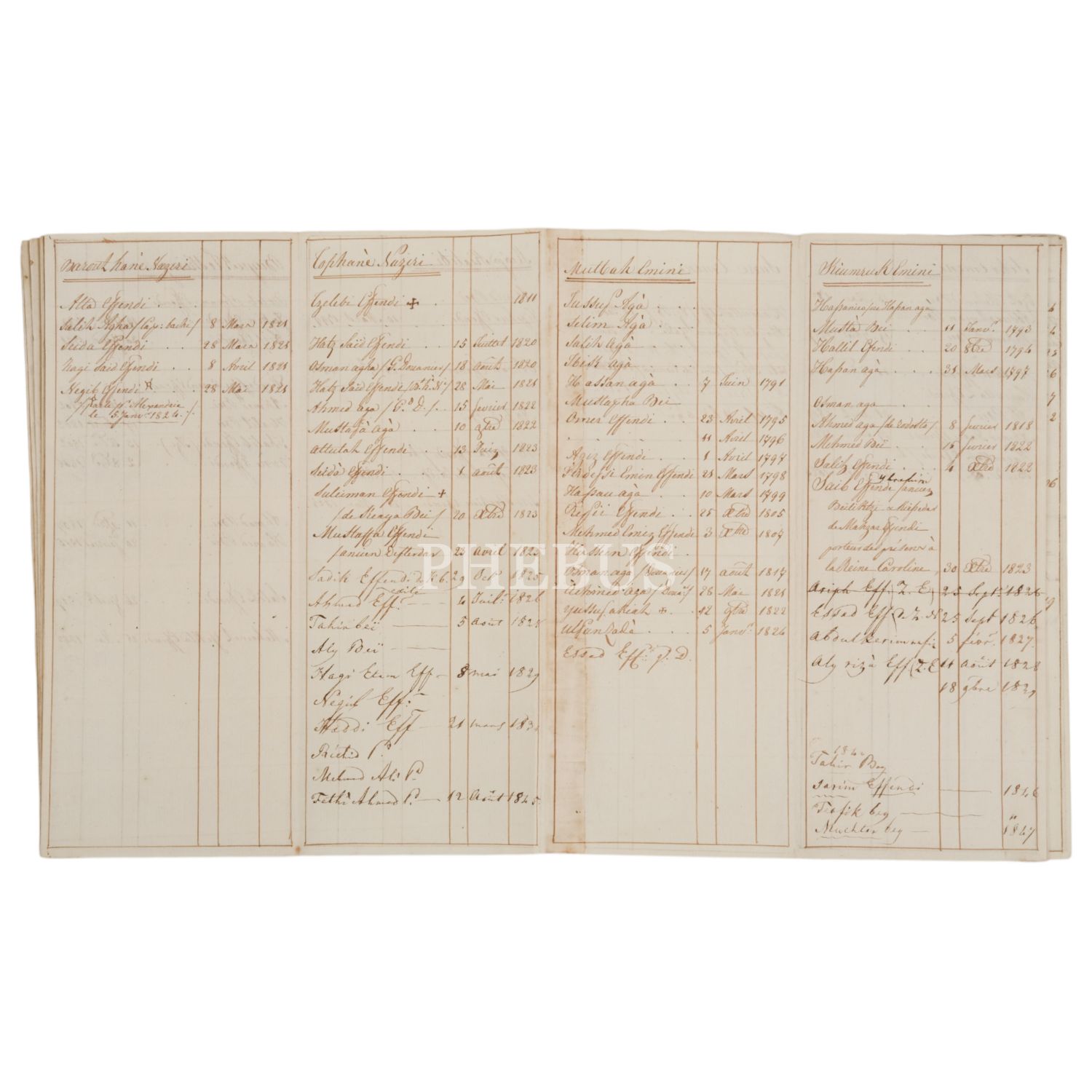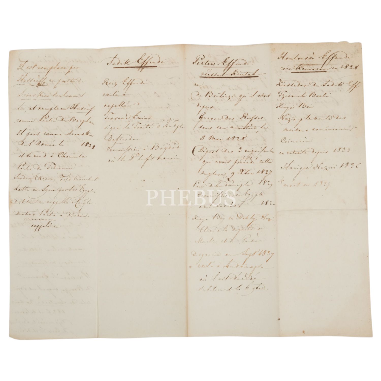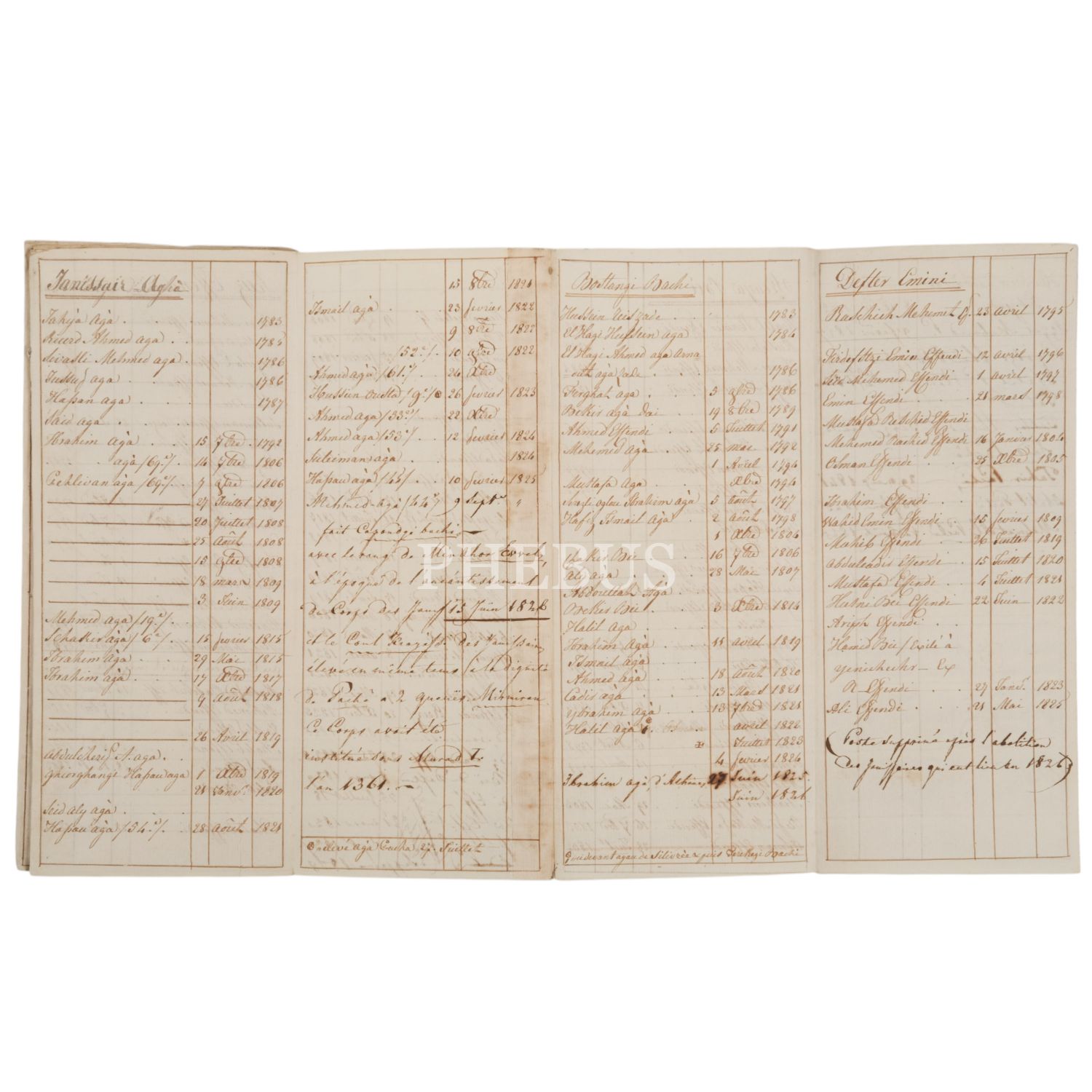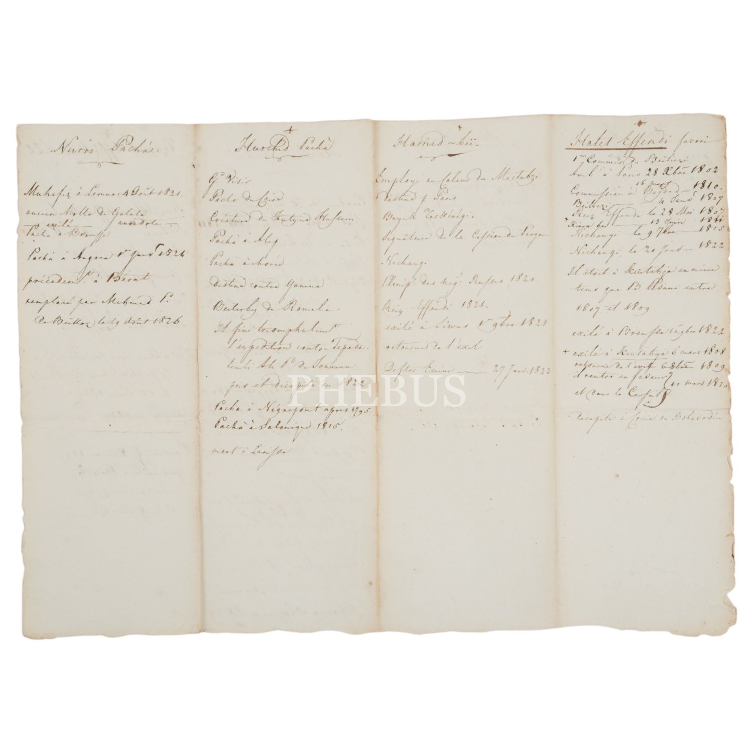 1782 yılından 1846´ya kadar, Osmanlı Devleti´nde önemli görevlerde bulunmuş şahsiyetlerin isimlerinin yer aldığı, el yazısıyla kaleme alınmış "Tableau General du Ministere Ottoman" başlıklı liste ve bu listede yer alan bazı şahsiyetlerin biyografilerinin yazılı olduğu sayfalar...