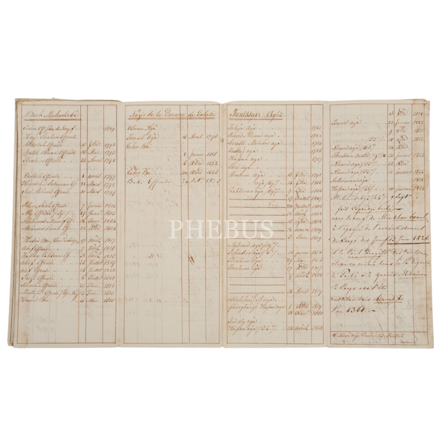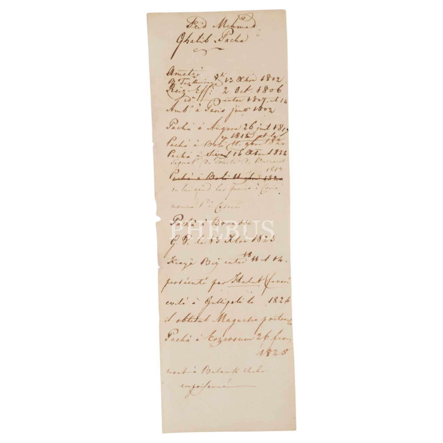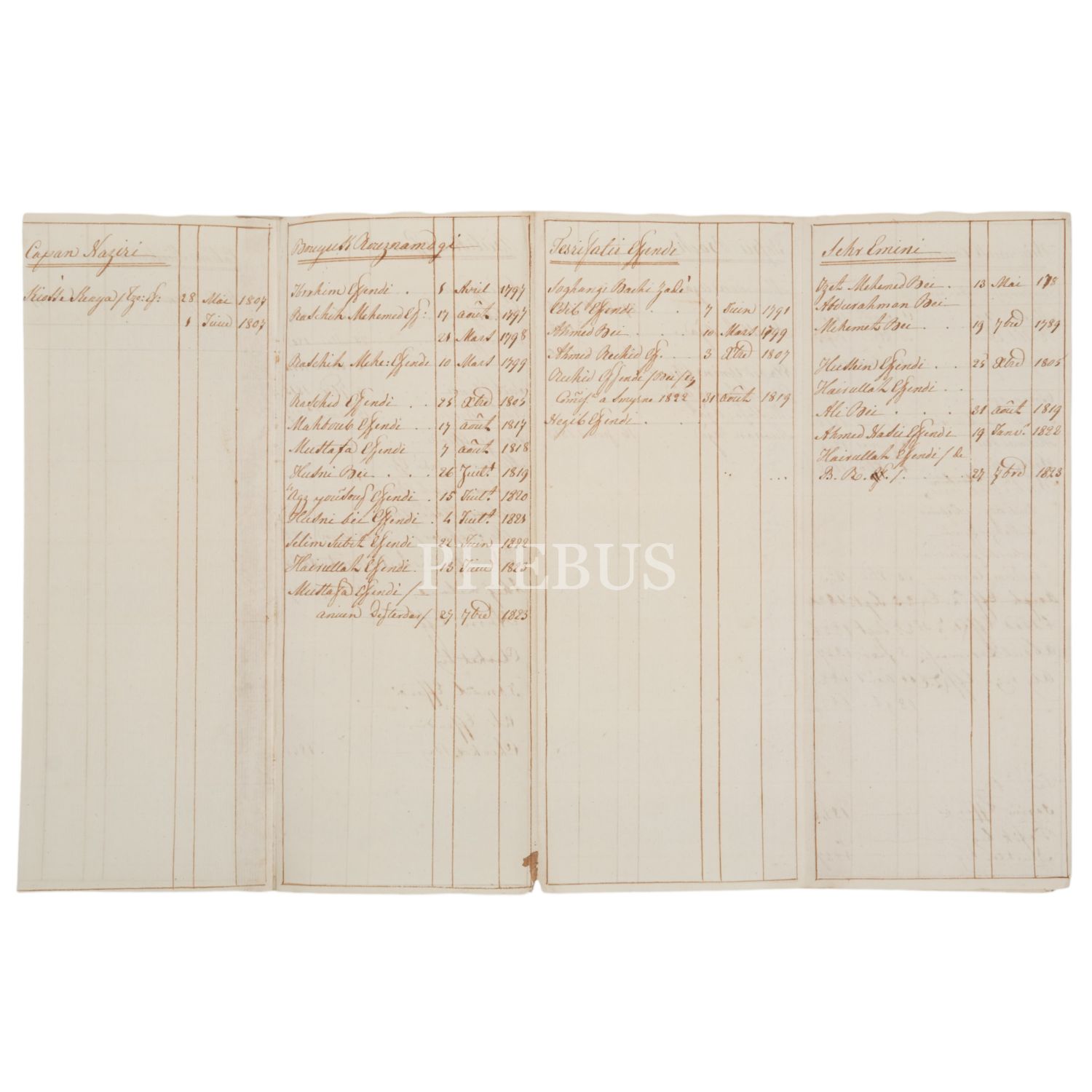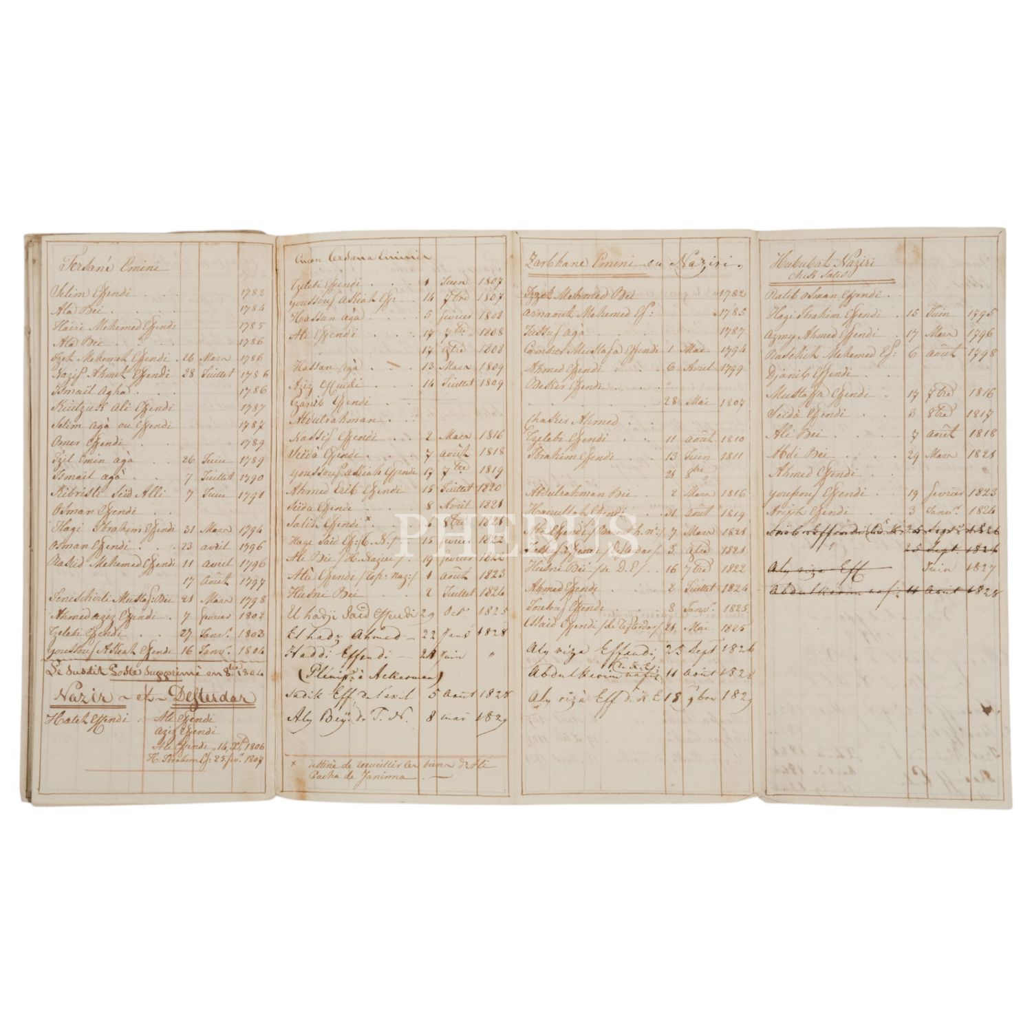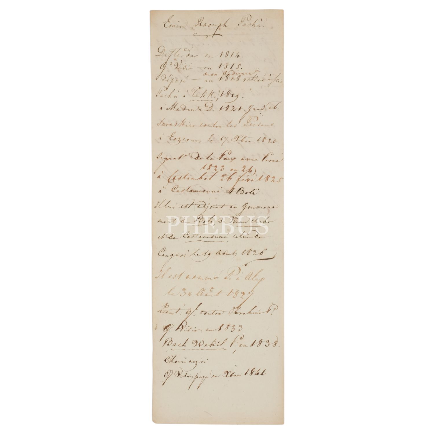 1782 yılından 1846´ya kadar, Osmanlı Devleti´nde önemli görevlerde bulunmuş şahsiyetlerin isimlerinin yer aldığı, el yazısıyla kaleme alınmış "Tableau General du Ministere Ottoman" başlıklı liste ve bu listede yer alan bazı şahsiyetlerin biyografilerinin yazılı olduğu sayfalar...