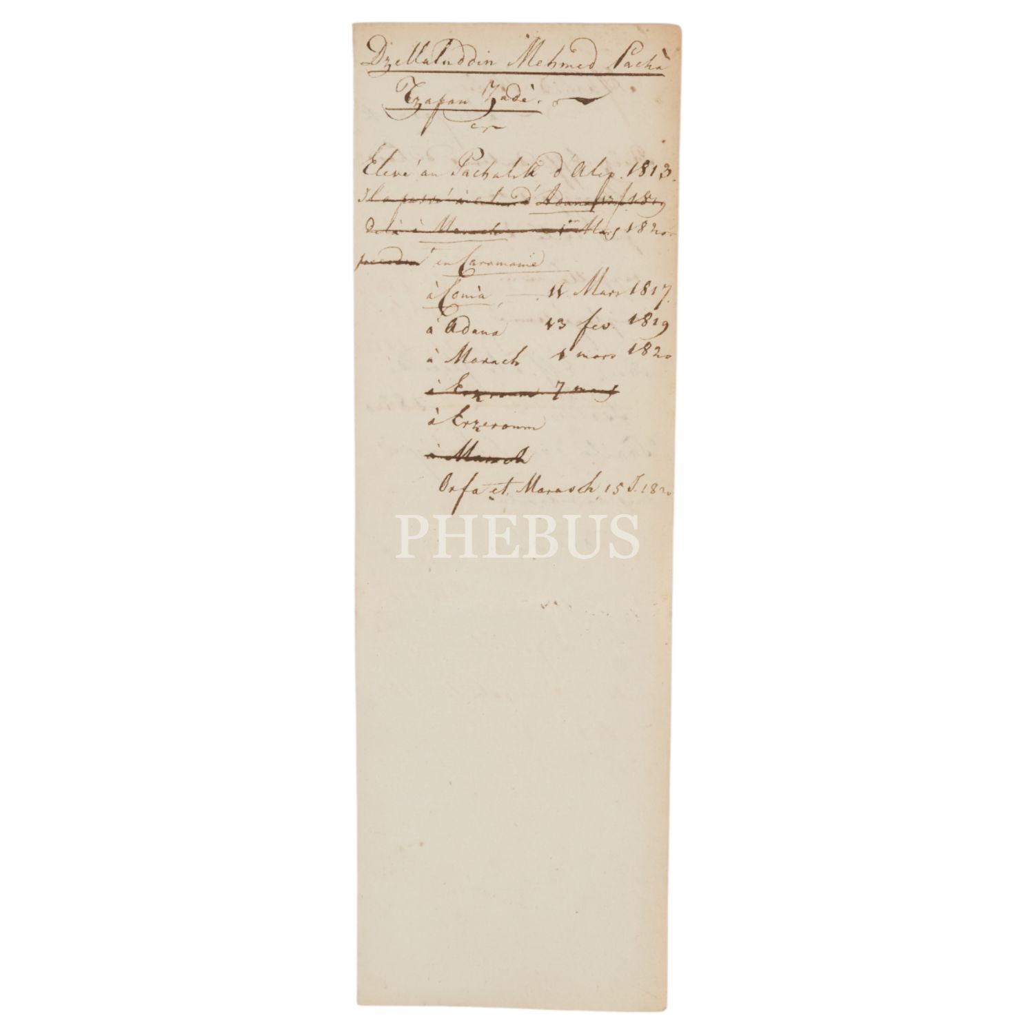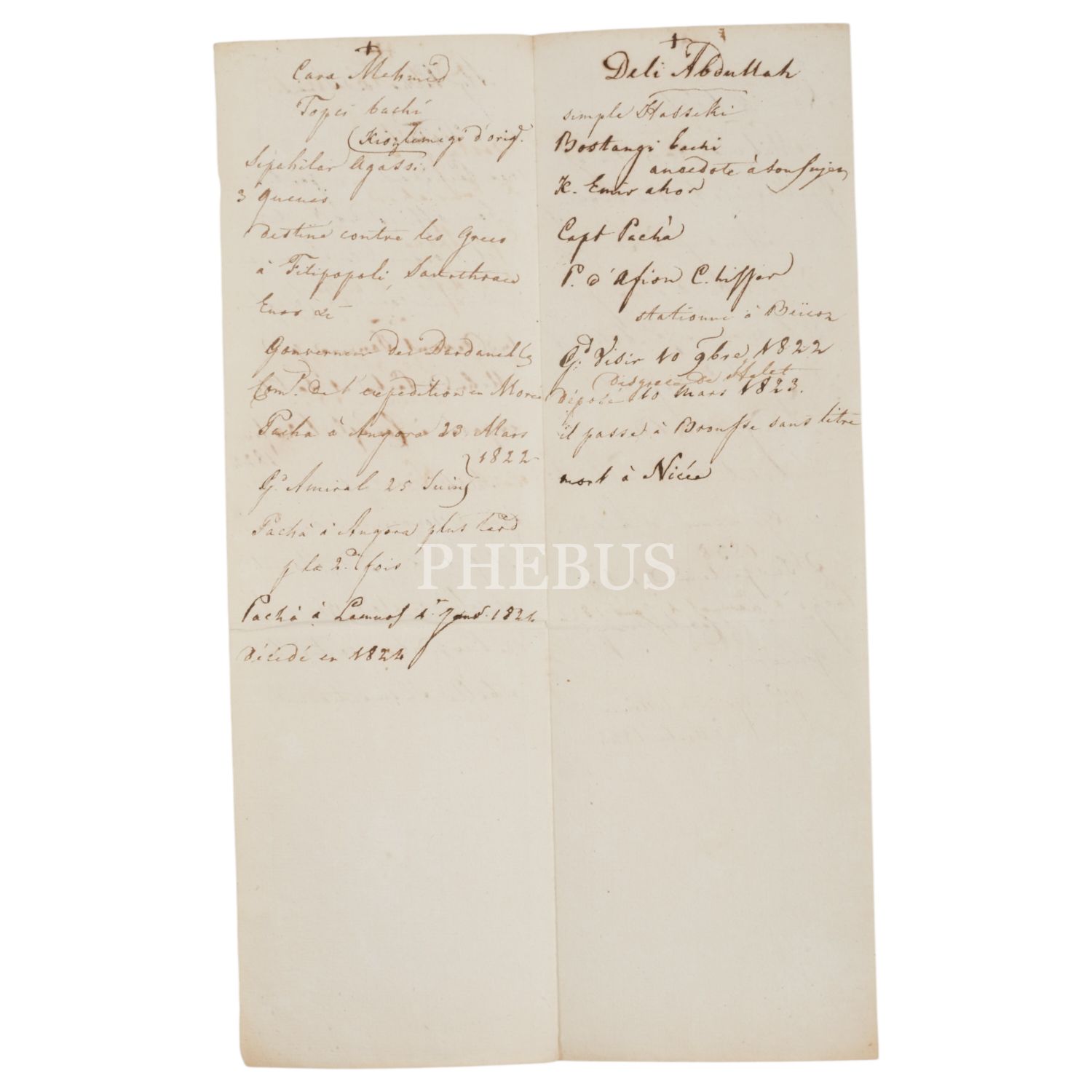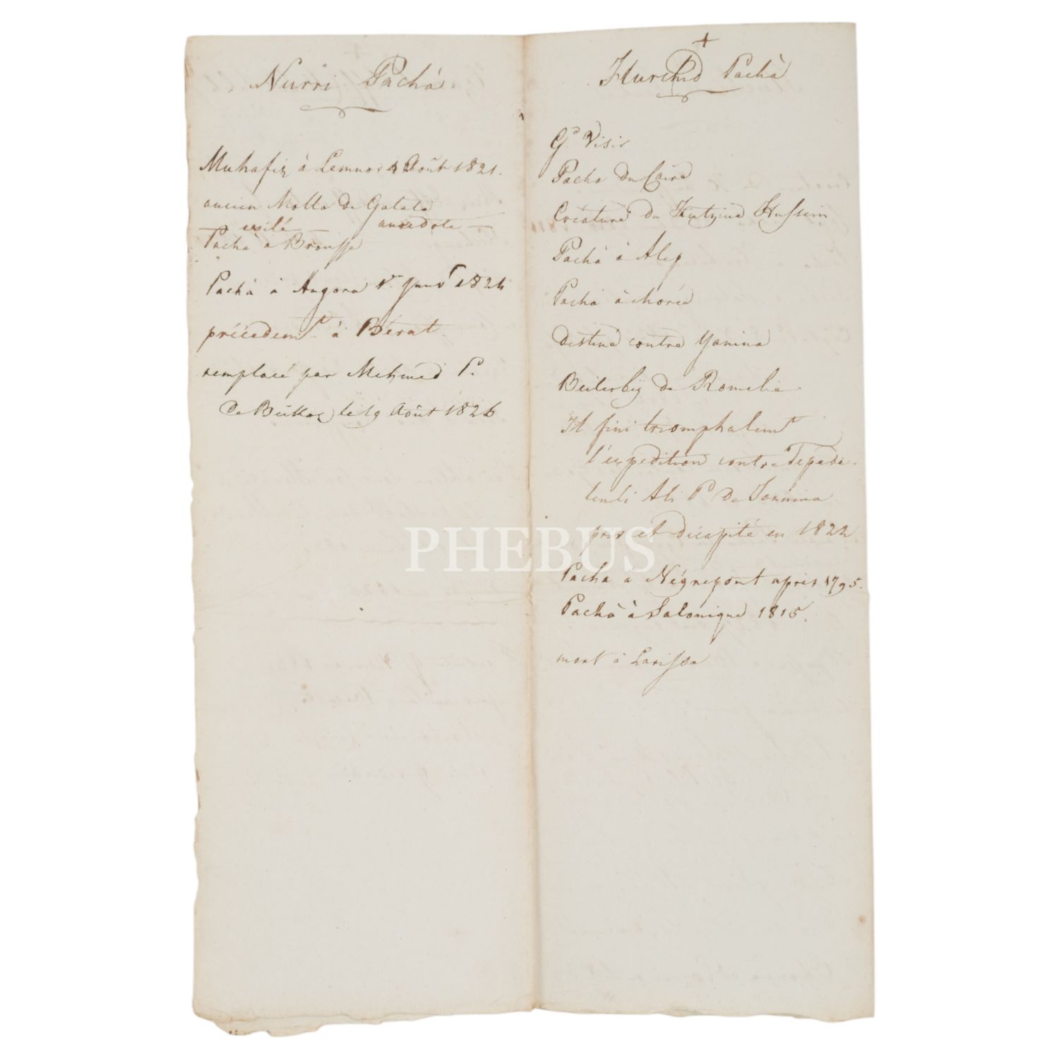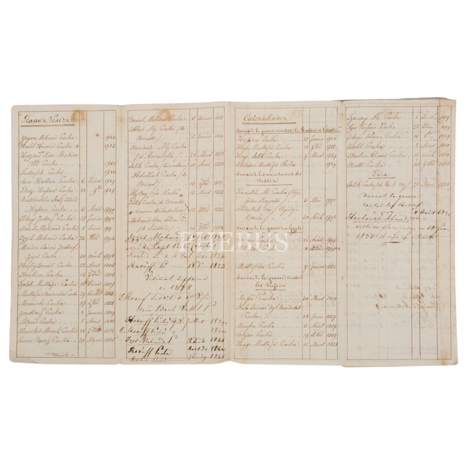 1782 yılından 1846´ya kadar, Osmanlı Devleti´nde önemli görevlerde bulunmuş şahsiyetlerin isimlerinin yer aldığı, el yazısıyla kaleme alınmış "Tableau General du Ministere Ottoman" başlıklı liste ve bu listede yer alan bazı şahsiyetlerin biyografilerinin yazılı olduğu sayfalar...