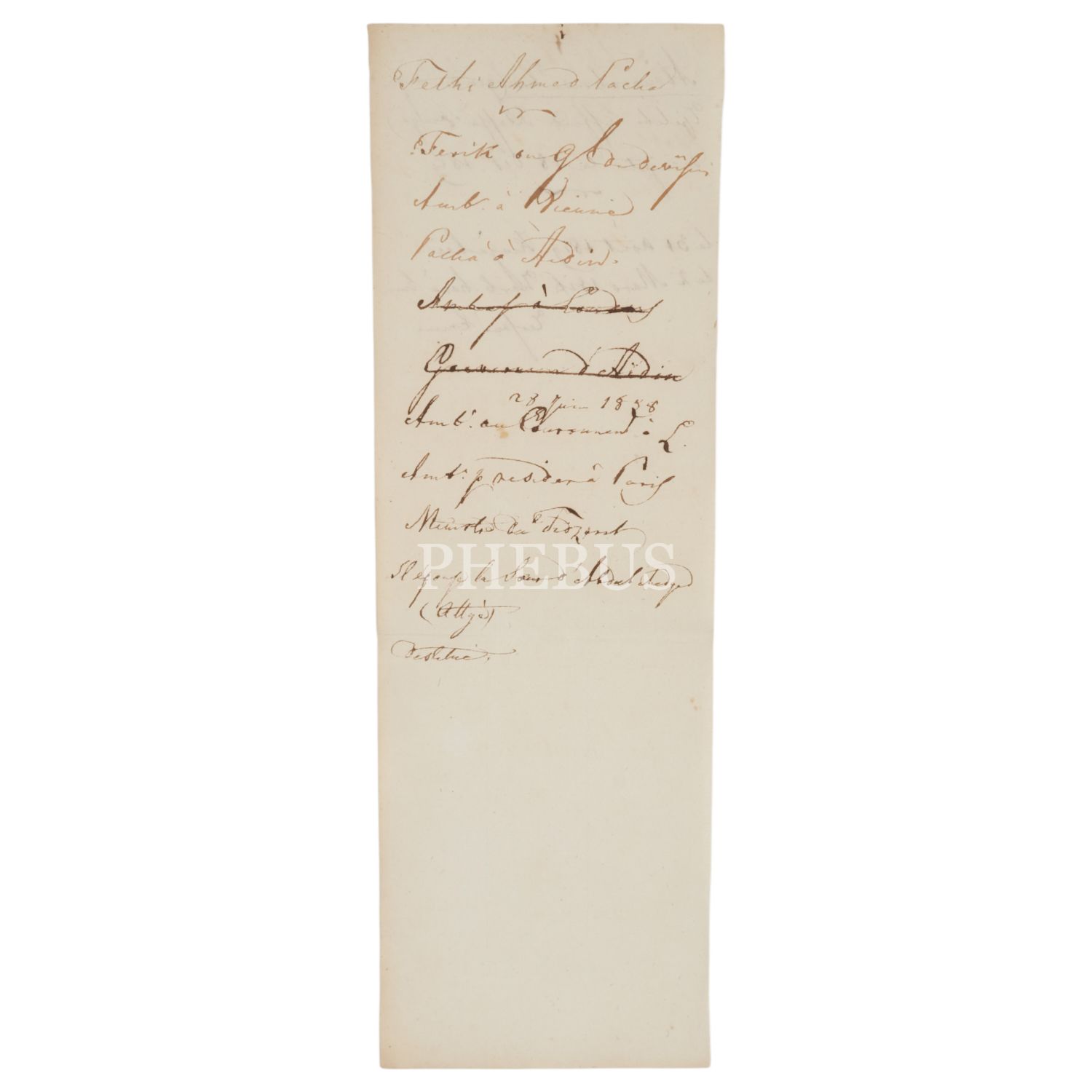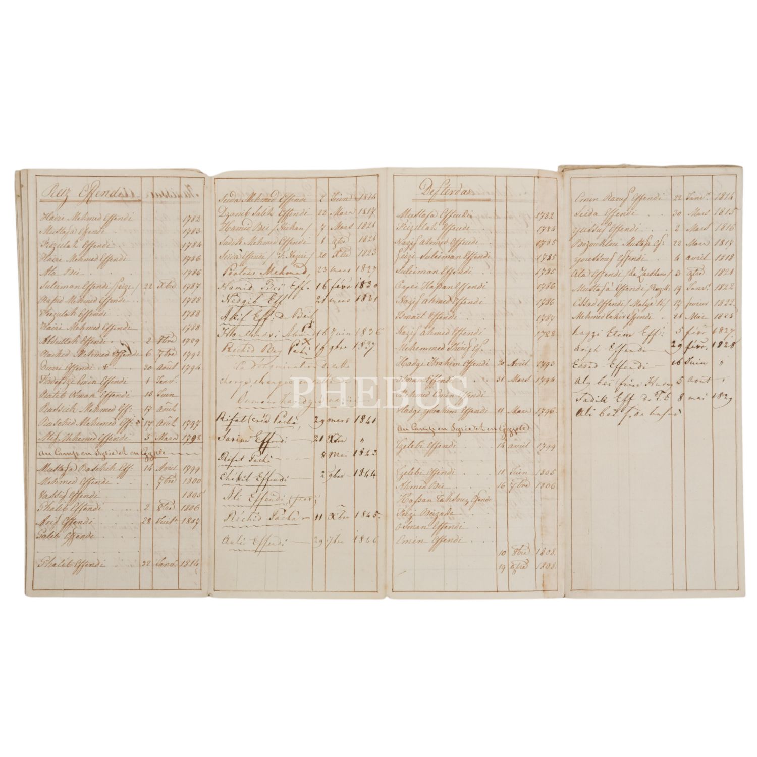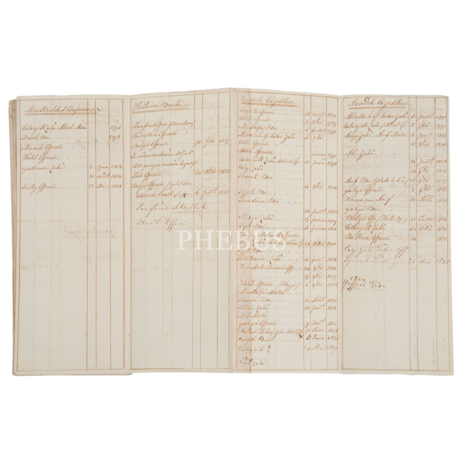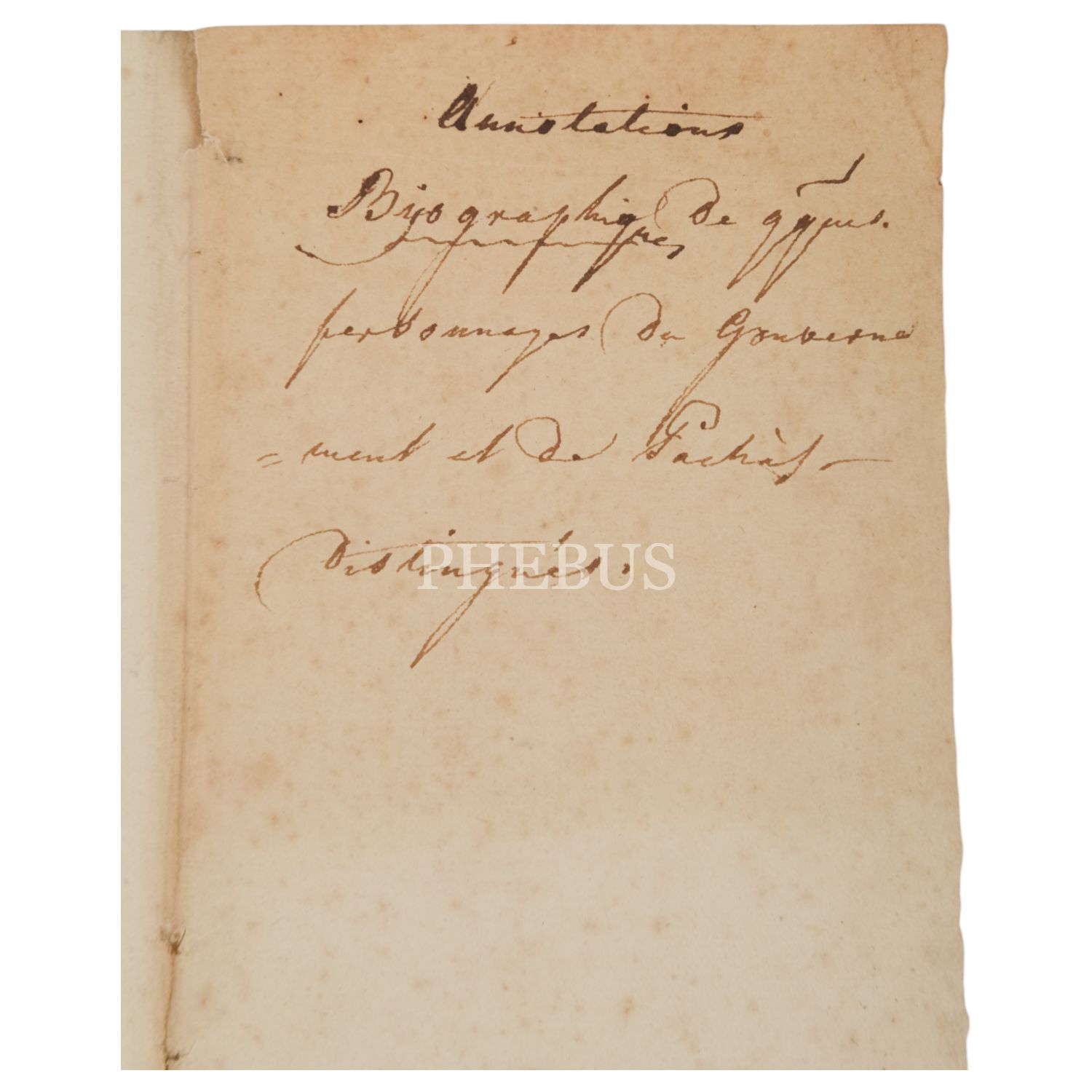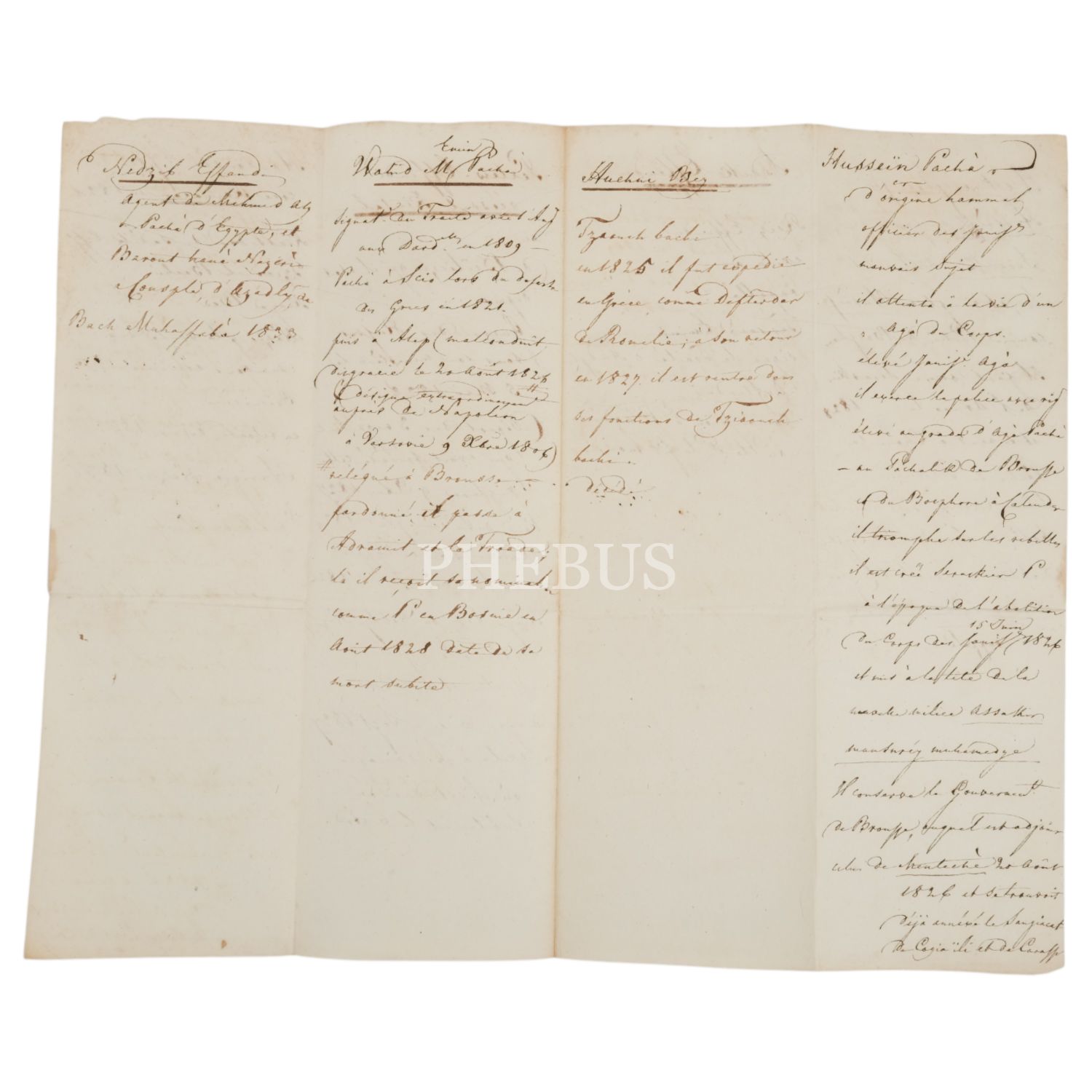 1782 yılından 1846´ya kadar, Osmanlı Devleti´nde önemli görevlerde bulunmuş şahsiyetlerin isimlerinin yer aldığı, el yazısıyla kaleme alınmış "Tableau General du Ministere Ottoman" başlıklı liste ve bu listede yer alan bazı şahsiyetlerin biyografilerinin yazılı olduğu sayfalar...