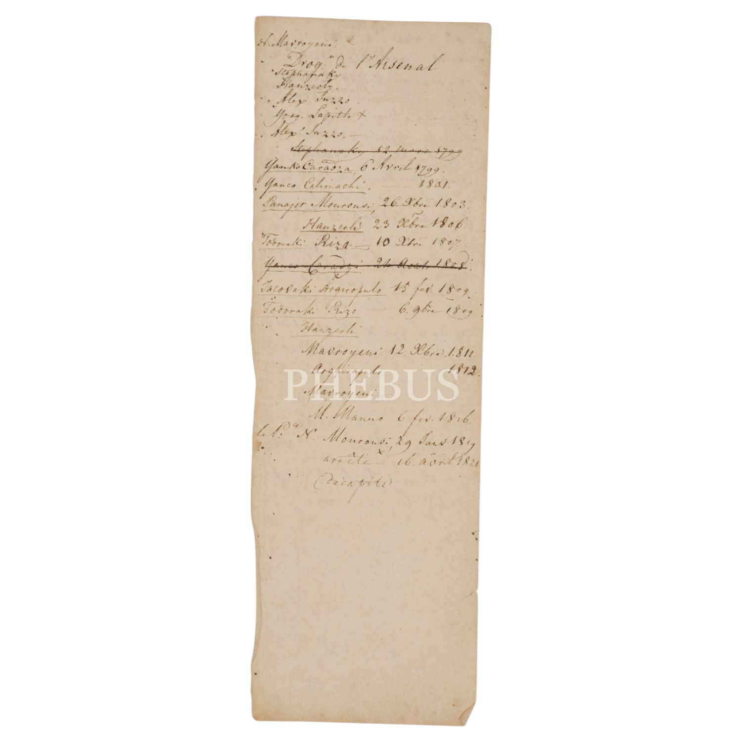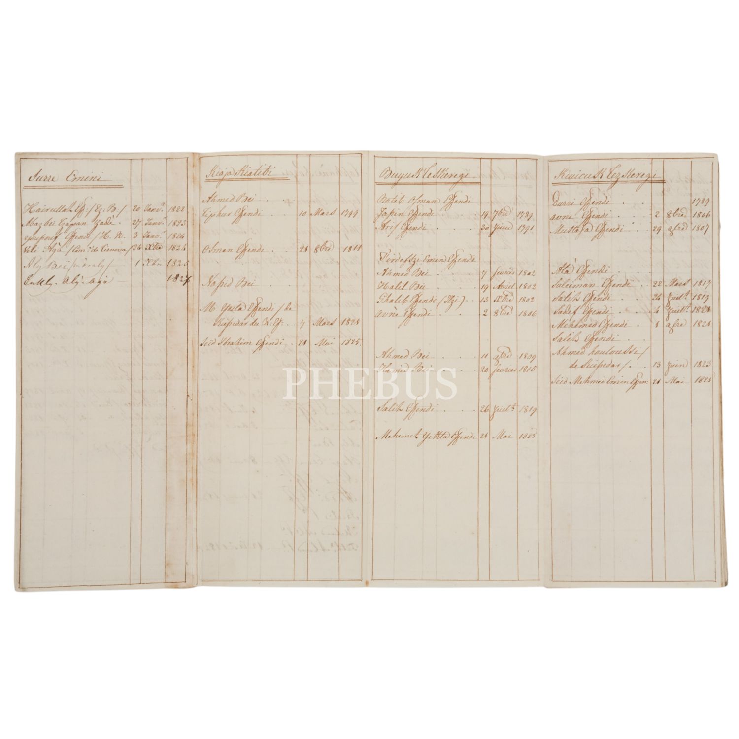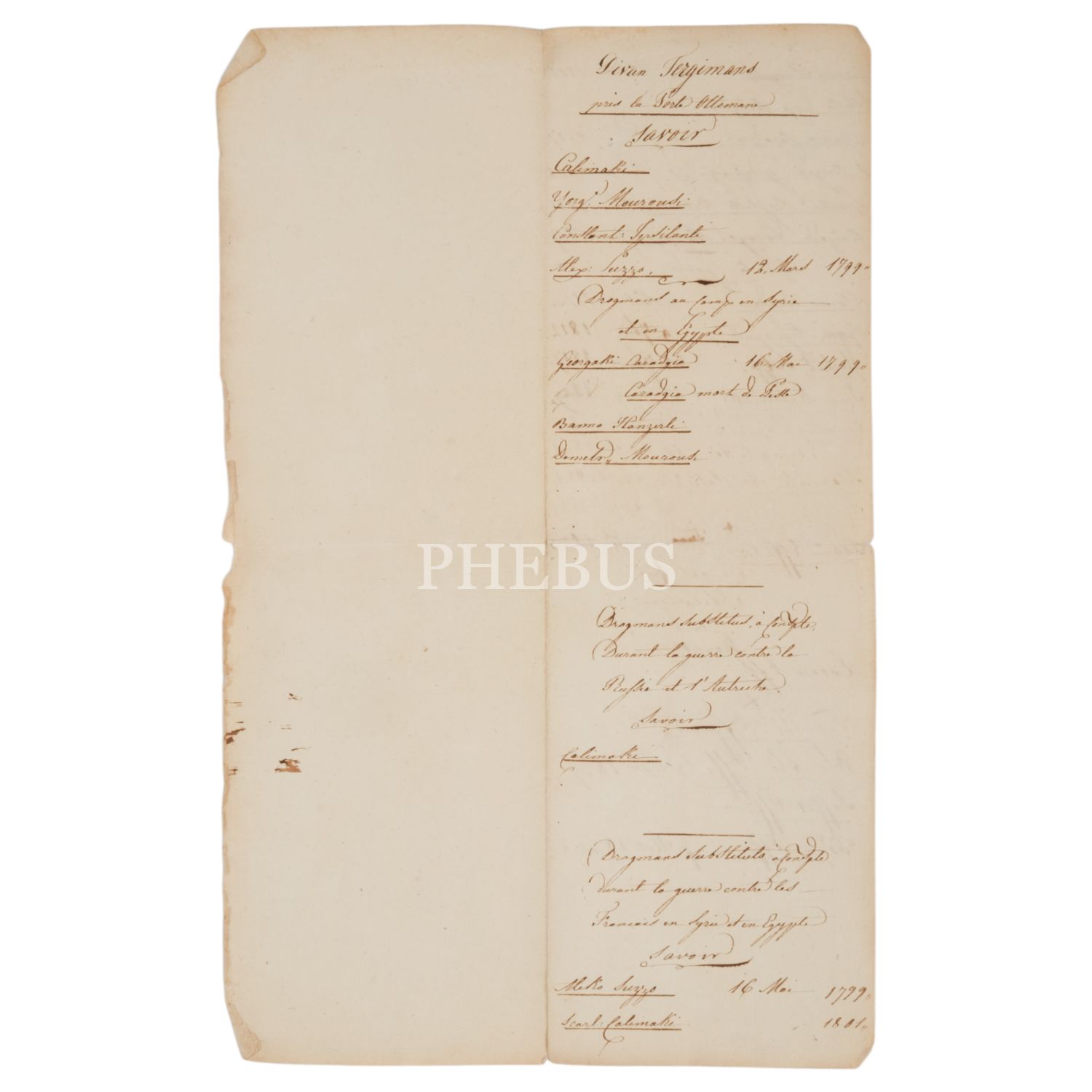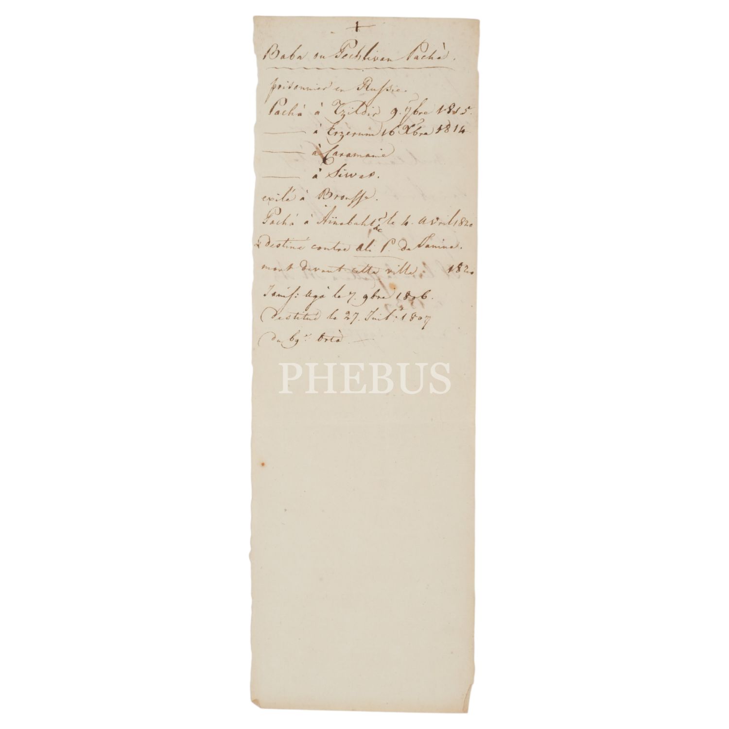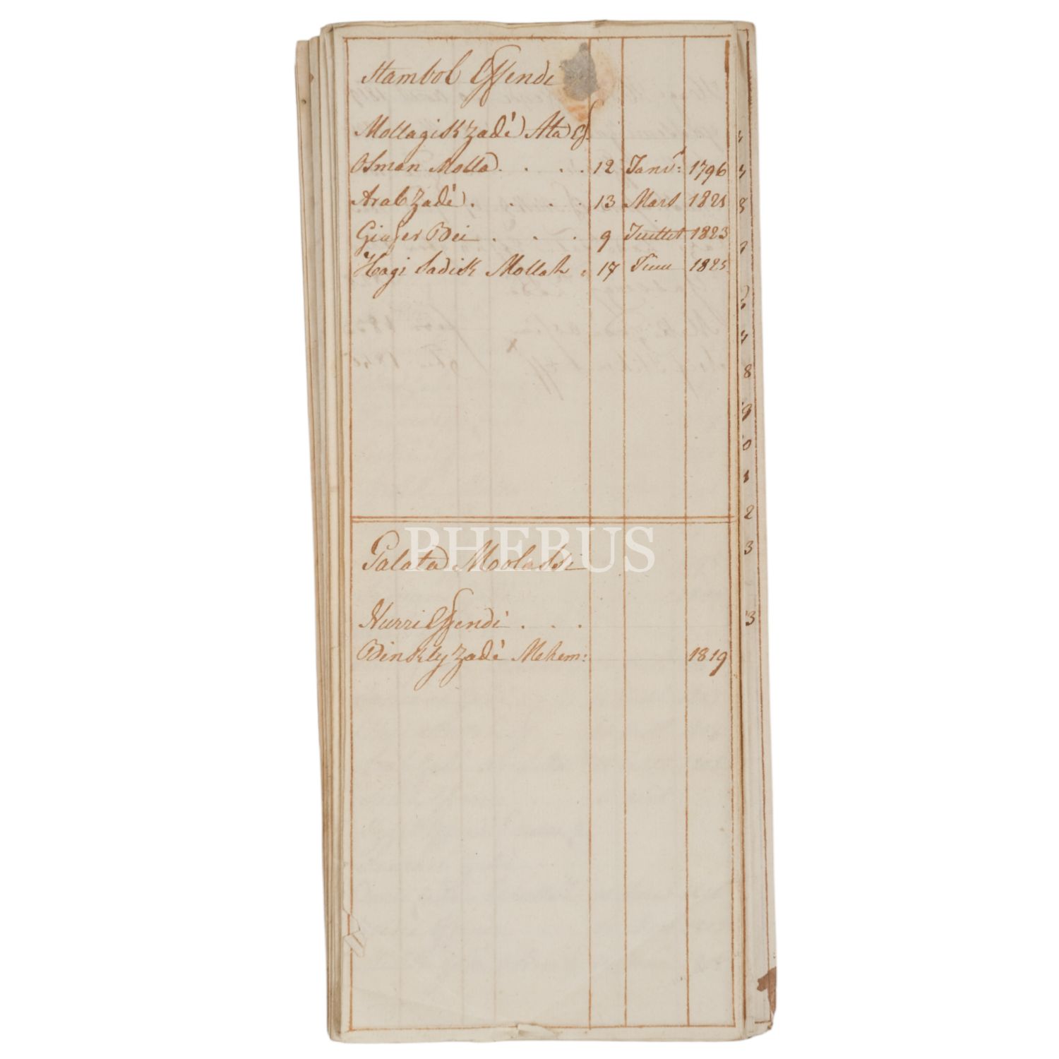 1782 yılından 1846´ya kadar, Osmanlı Devleti´nde önemli görevlerde bulunmuş şahsiyetlerin isimlerinin yer aldığı, el yazısıyla kaleme alınmış "Tableau General du Ministere Ottoman" başlıklı liste ve bu listede yer alan bazı şahsiyetlerin biyografilerinin yazılı olduğu sayfalar...