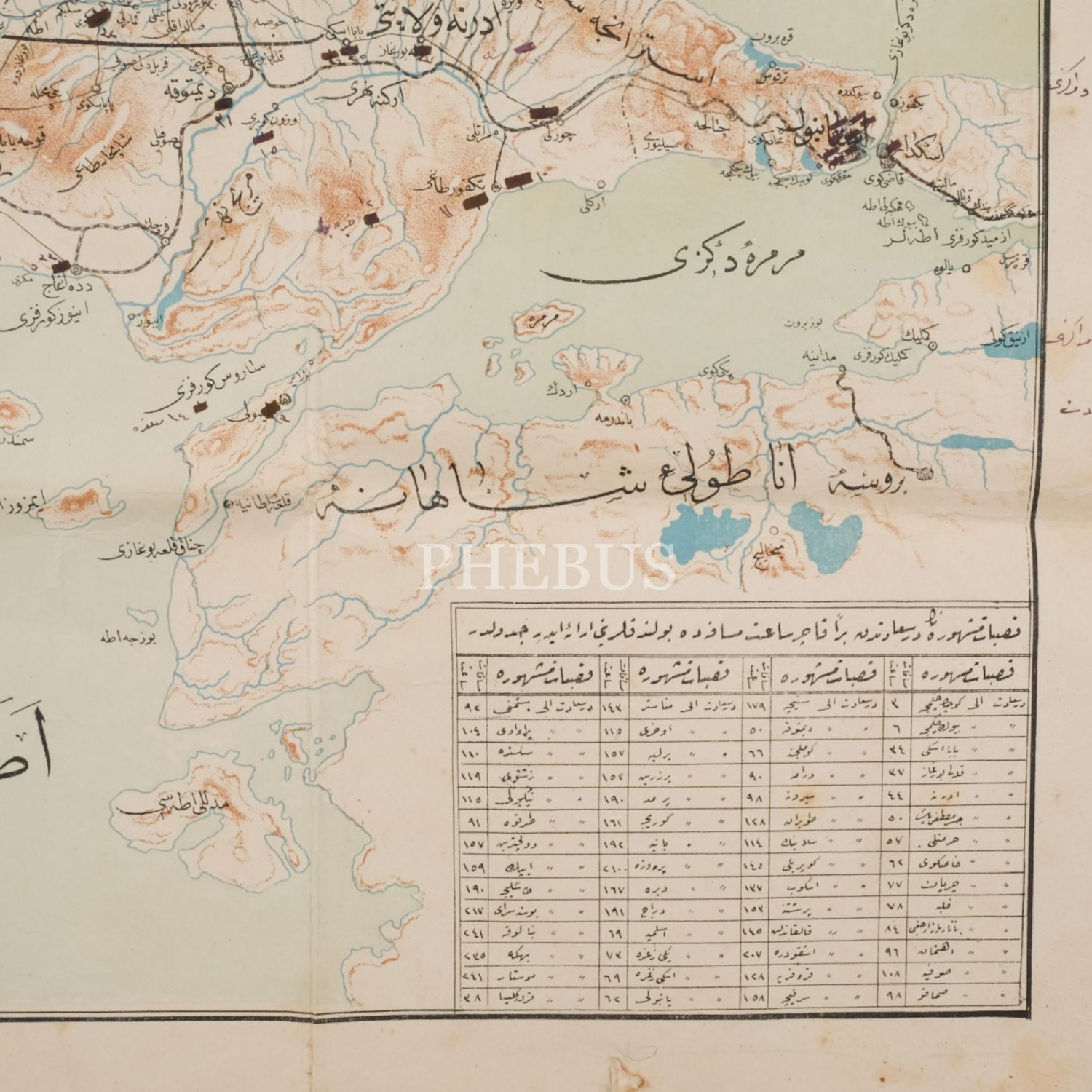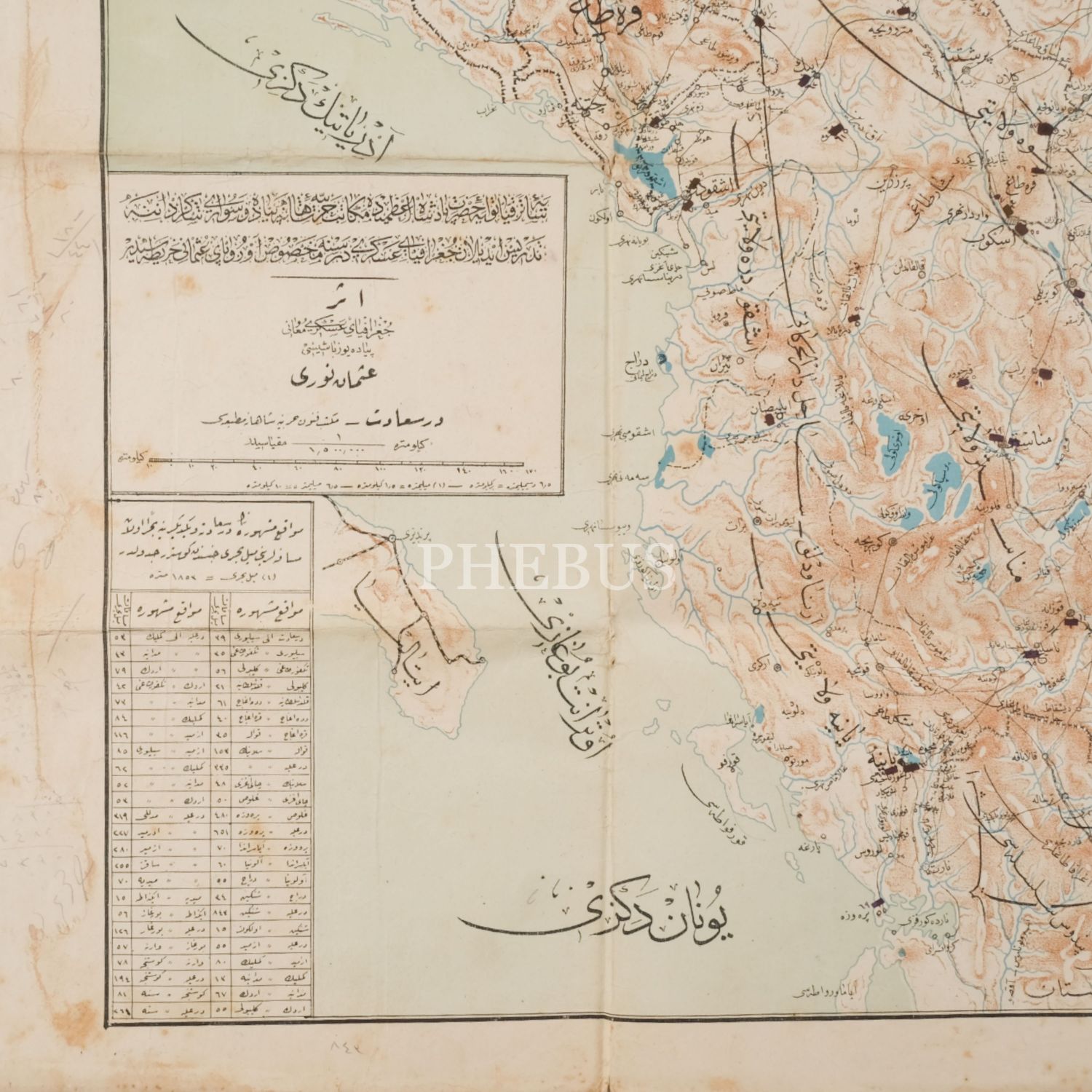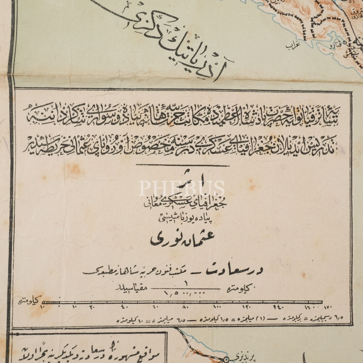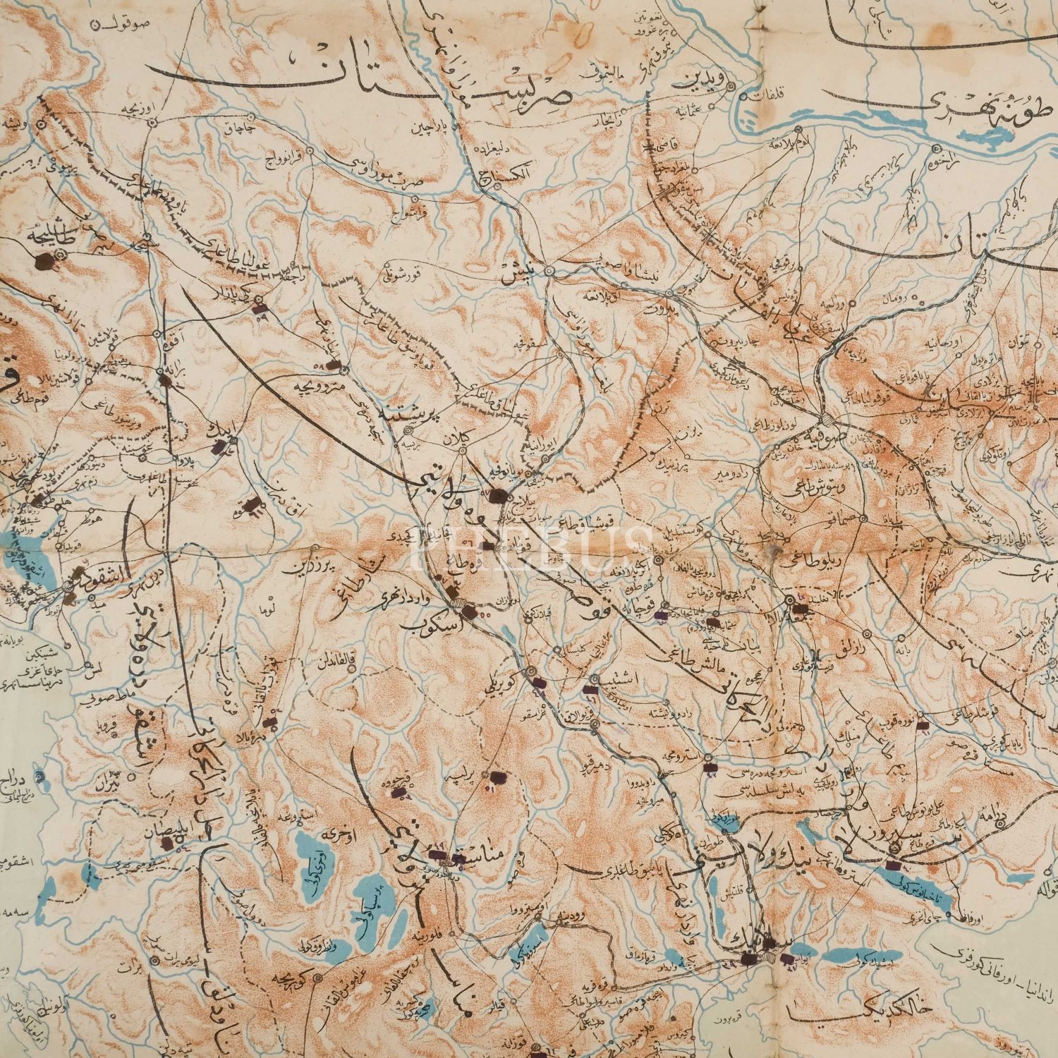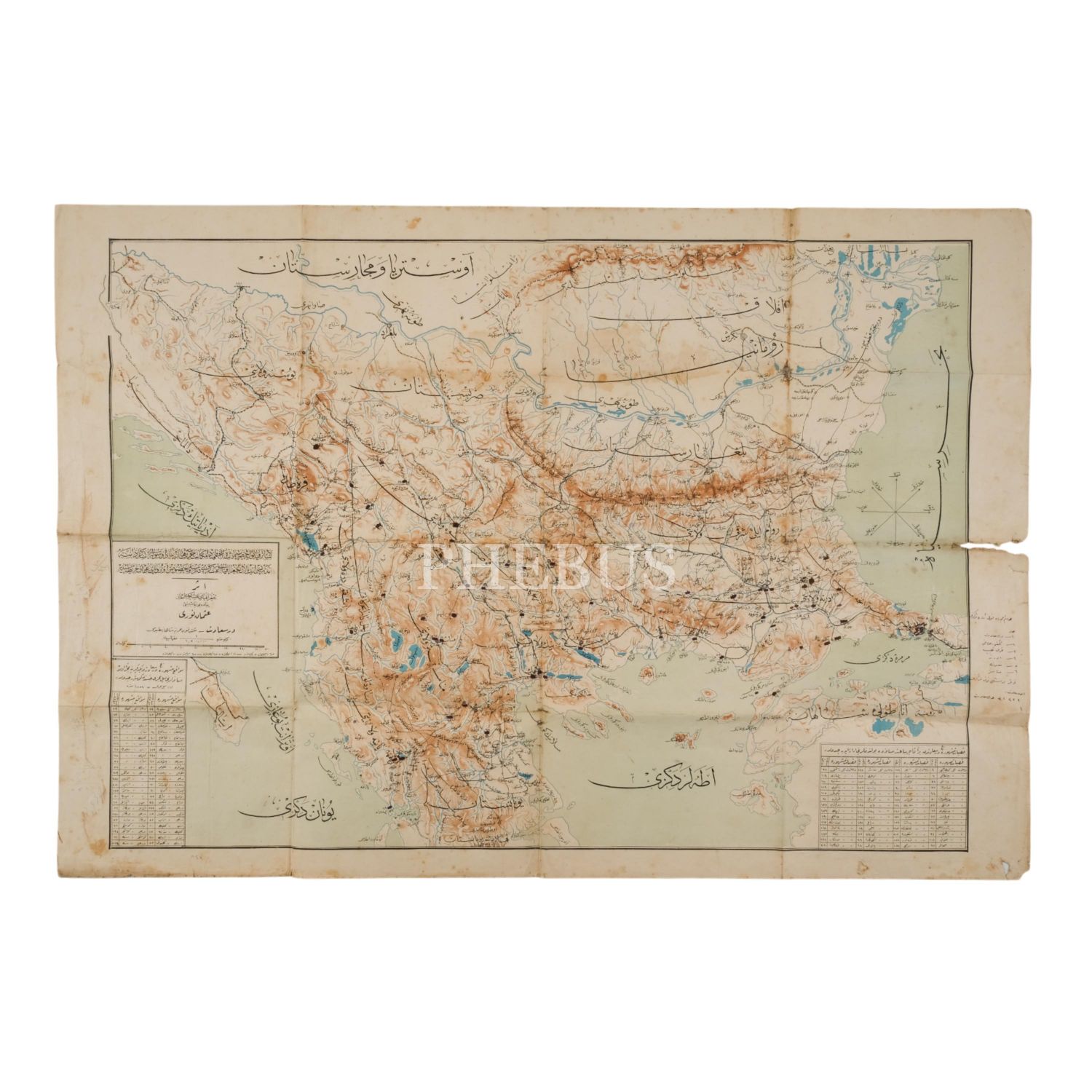 Piyade Yüzbaşı Coğrafya-yı Askeri Muallimi Osman Nuri Efendi tarafından tersim olunan, Mekteb-i Harbiye-i Şahane´nin coğrafya-yı askeri derslerinde kullanılan Avrupa-yı Osmani (Osmanlı´nın Avrupa´daki toprakları) haritası, 82x57 cm...