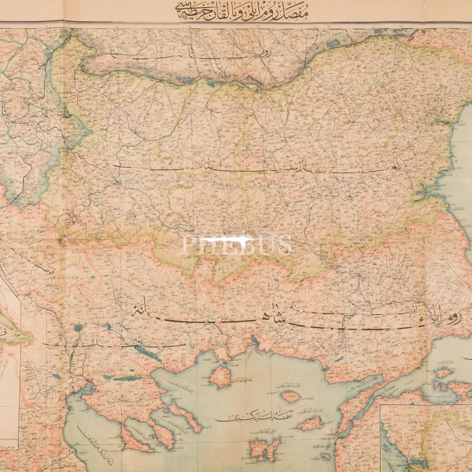 Mekteb-i Harbiye-i Şahane tarafından yayınmlanan "Mufassal Rumeli ve Balkan Haritası" başlıklı Osmanlıca harita, Matbaa-i Botton Gabai, 68x96 cm...