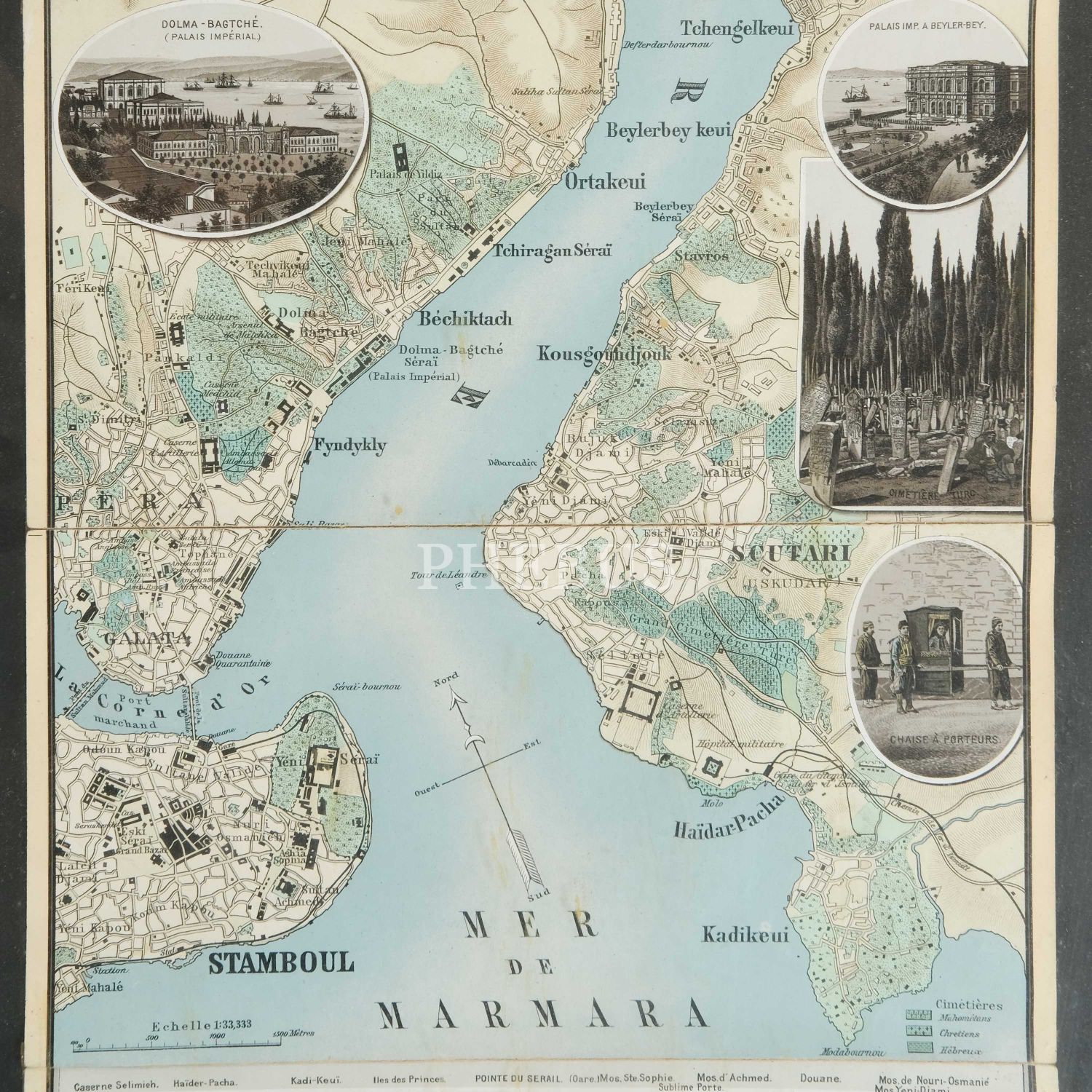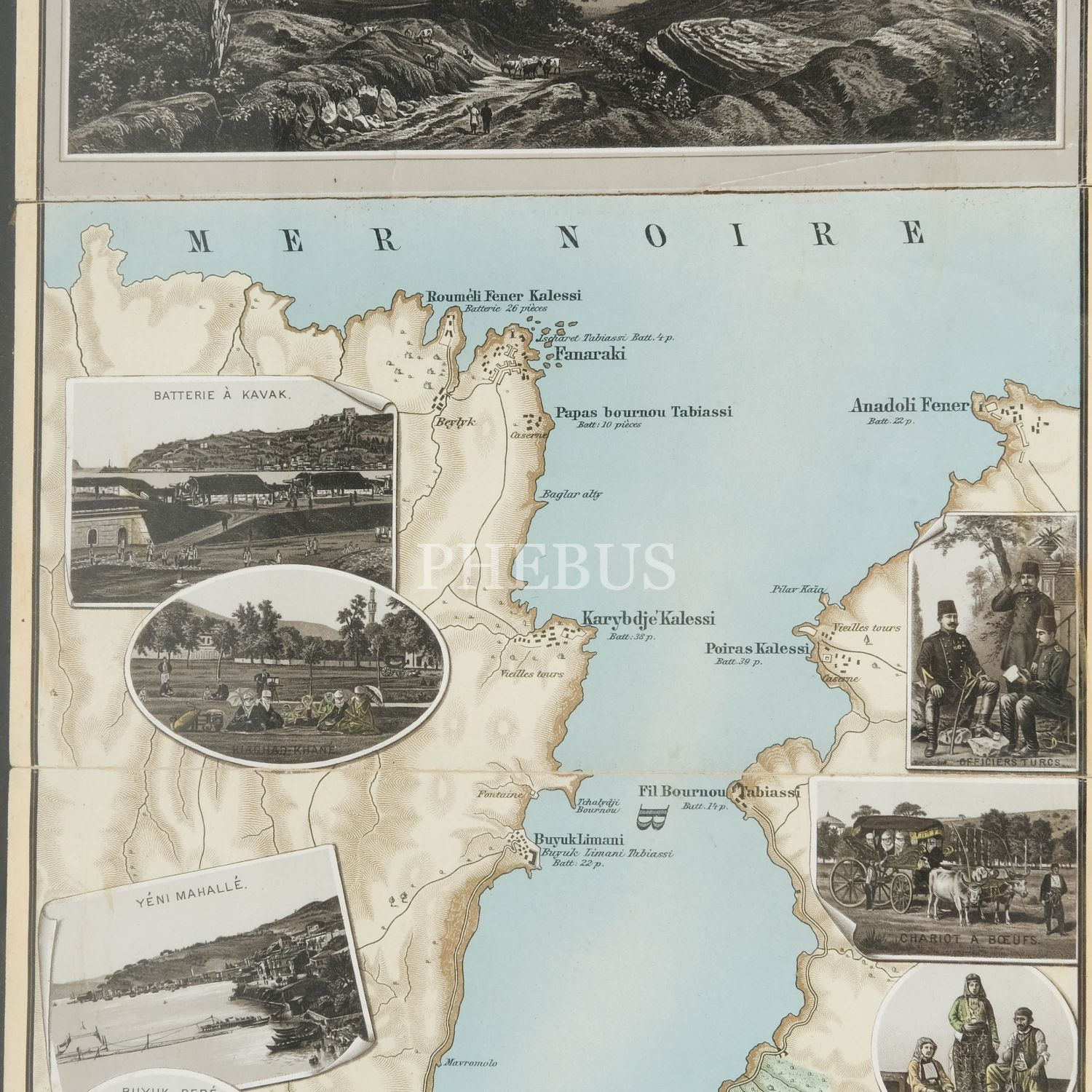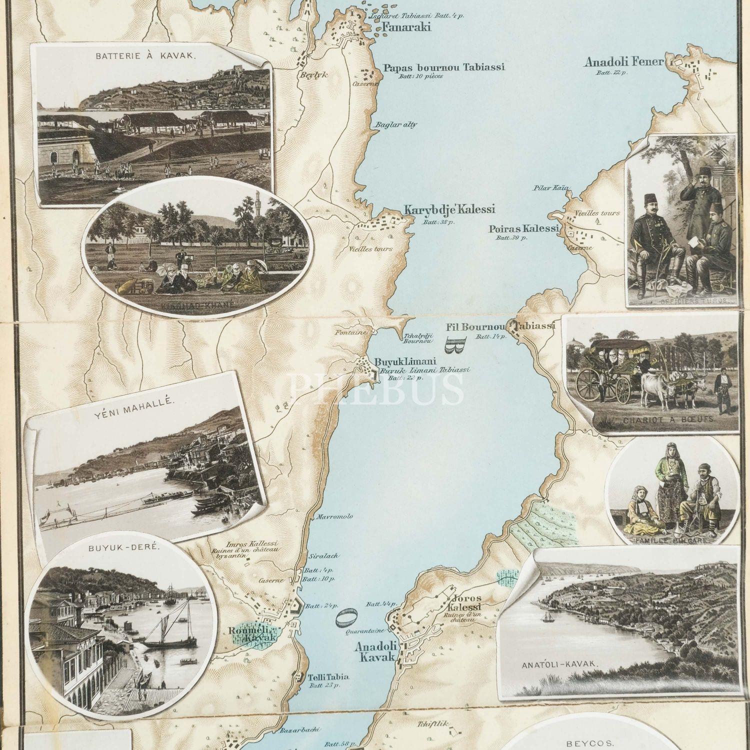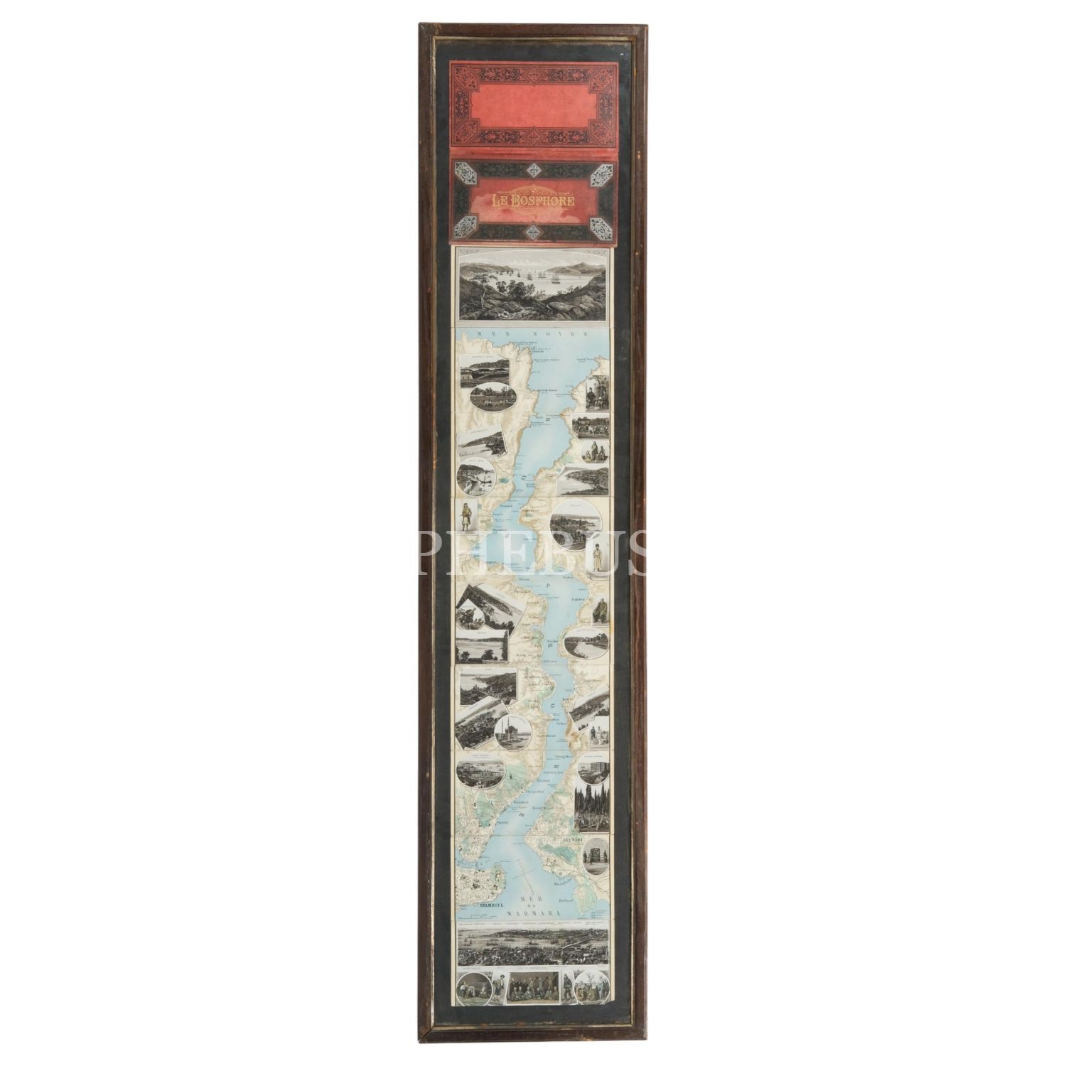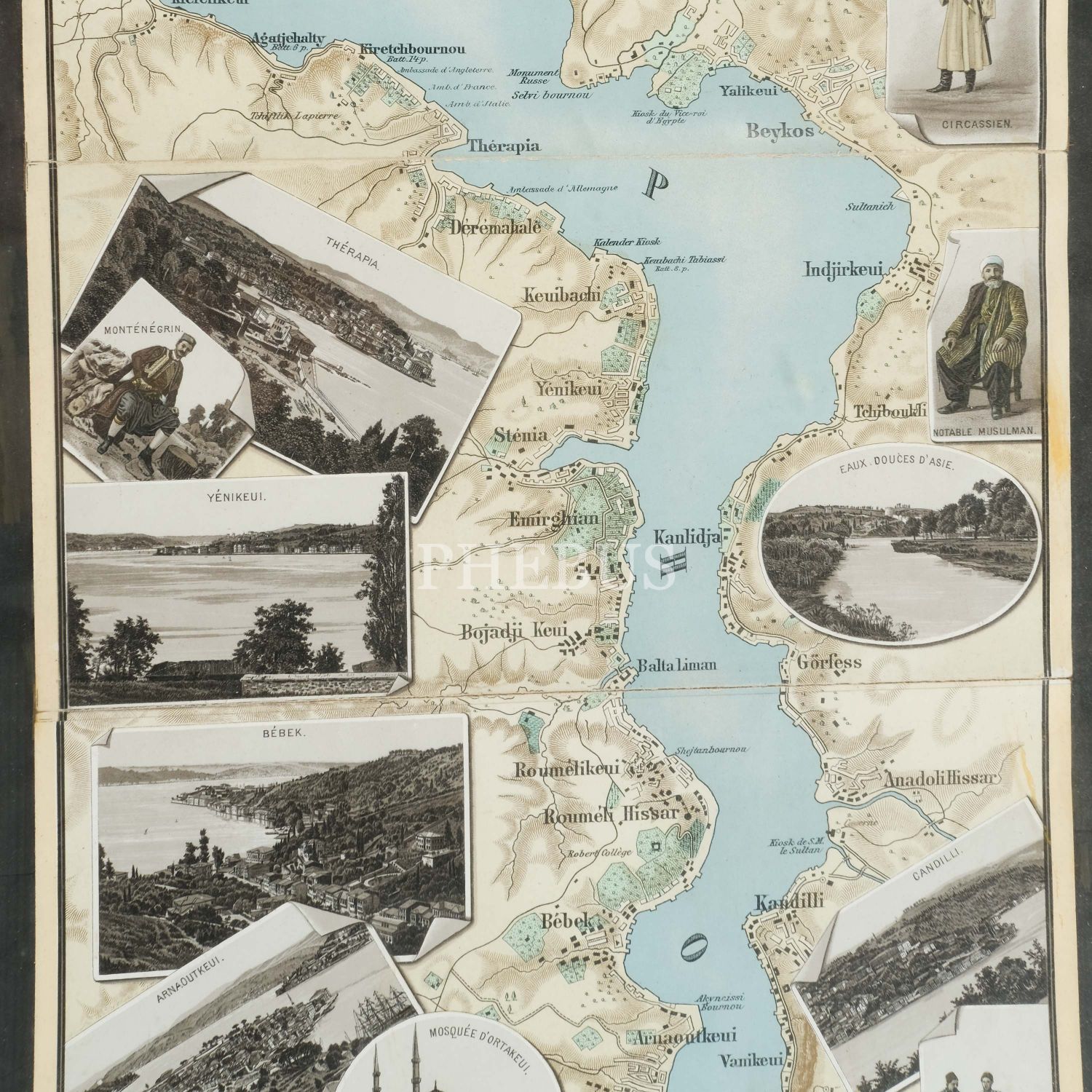 Sultan İkinci Abdülhamid döneminde F. Leoffler (Löfler) tarafından litografi tekniğiyle hazırlanmış, bol yer-mekan ve figür görselli, katlanır formda Boğaziçi haritası, "LE BOSPHORE", 138x25 cm...