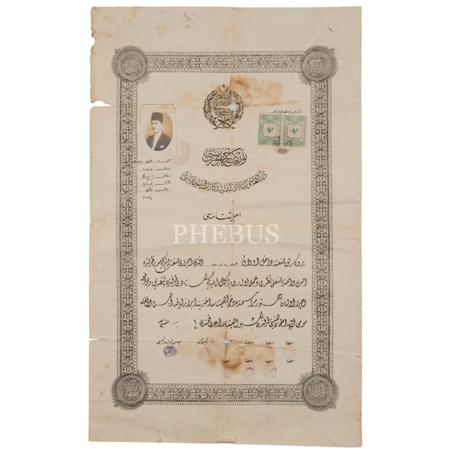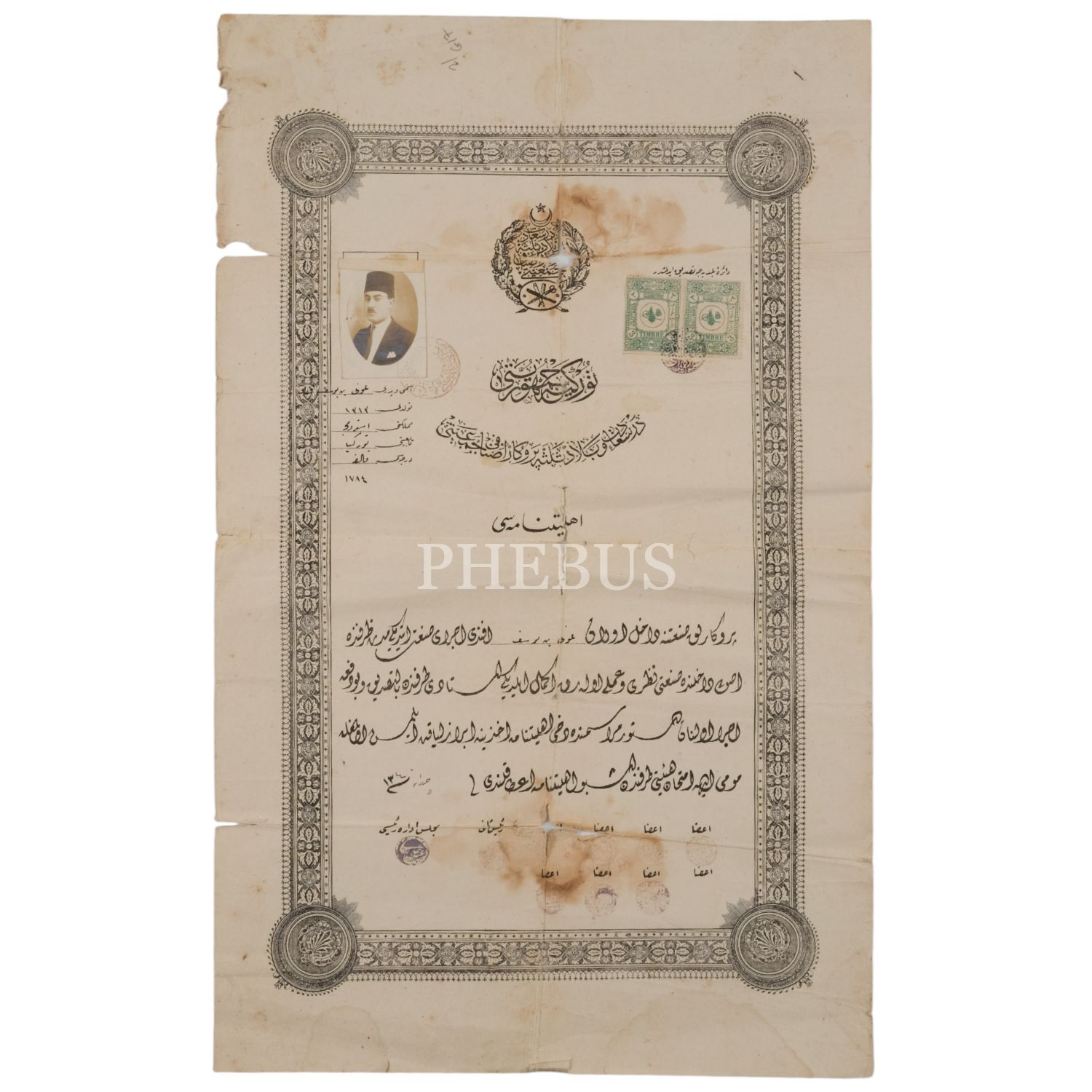Türkiye Cumhuriyeti Dersaadet ve Bilad-ı Selese Perukar Esnafı Cemiyeti tarafından Avni Oğlu Yusuf Efendi adına düzenlenen berber ehliyetnamesi, 1340 (1924), 31x50 cm...