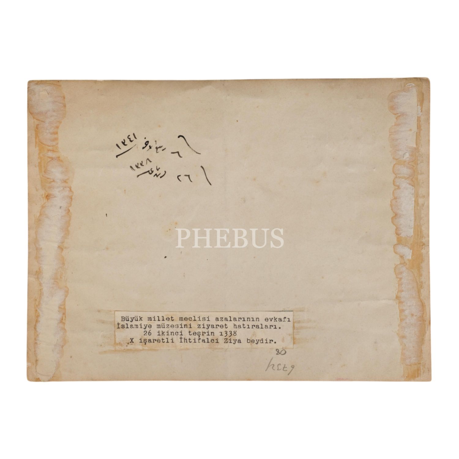 Günümüzde Türk ve İslam Eserleri Müzesi ismiyle anılan Evkaf-ı İslamiye Müzesi´nin kurucusu İbnülemin Mahmut Kemal İnal ve I. Meclis azalarının müzeye ziyaretlerinde çektirdikleri hatıra fotoğrafı, 26 Teşrinisani 1338 (26 Kasım 1922), 24x18 cm...