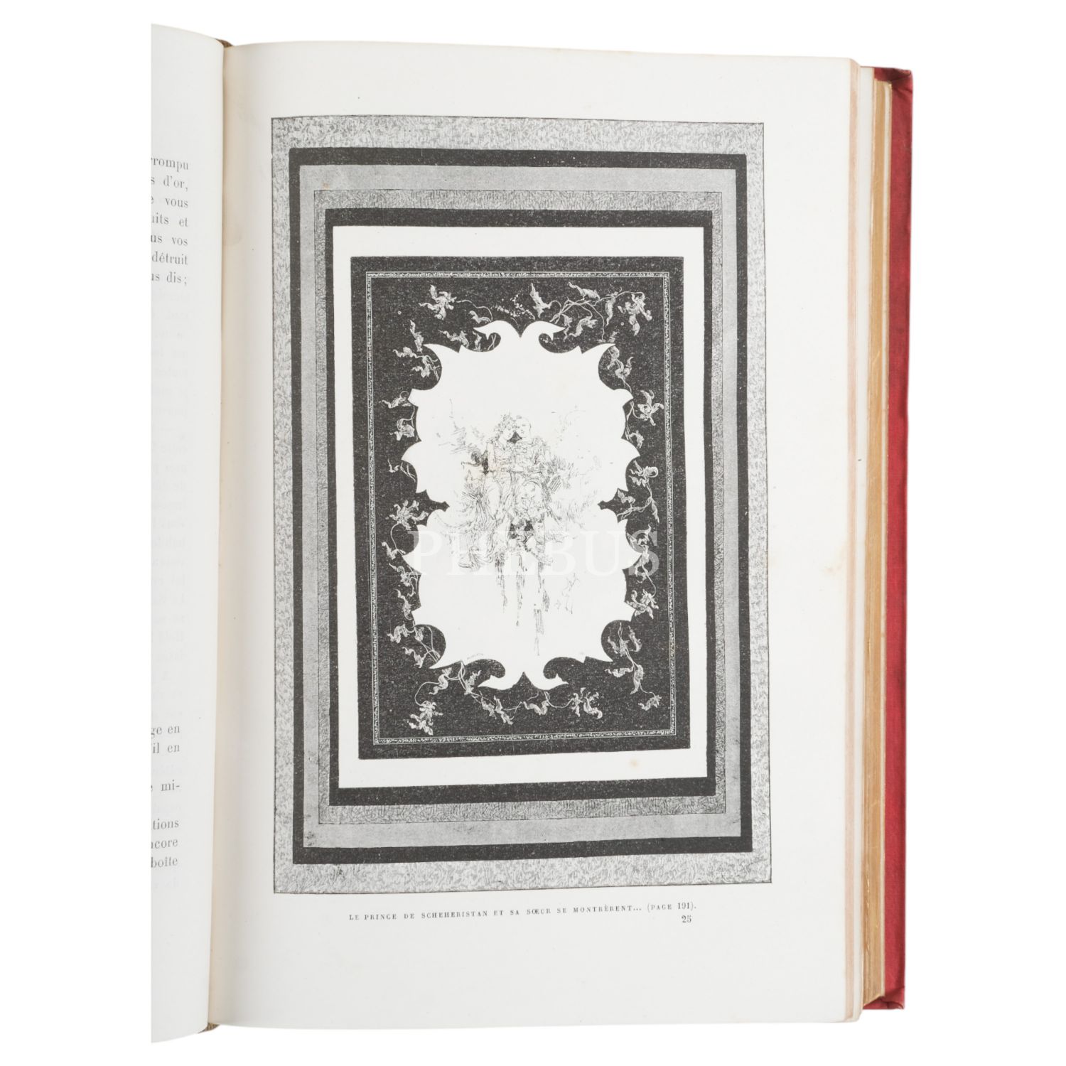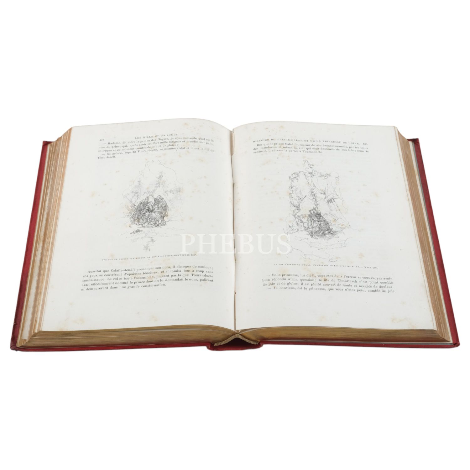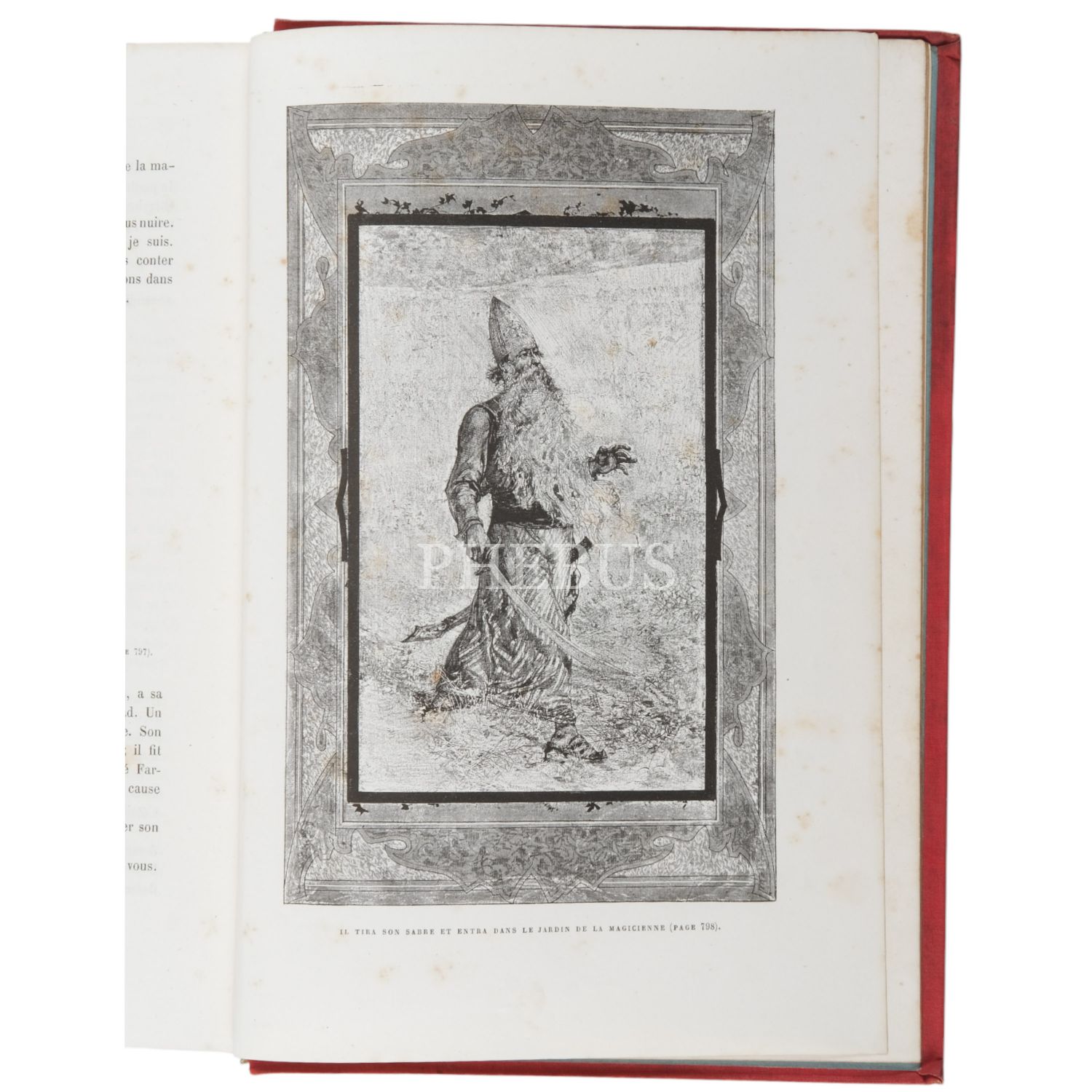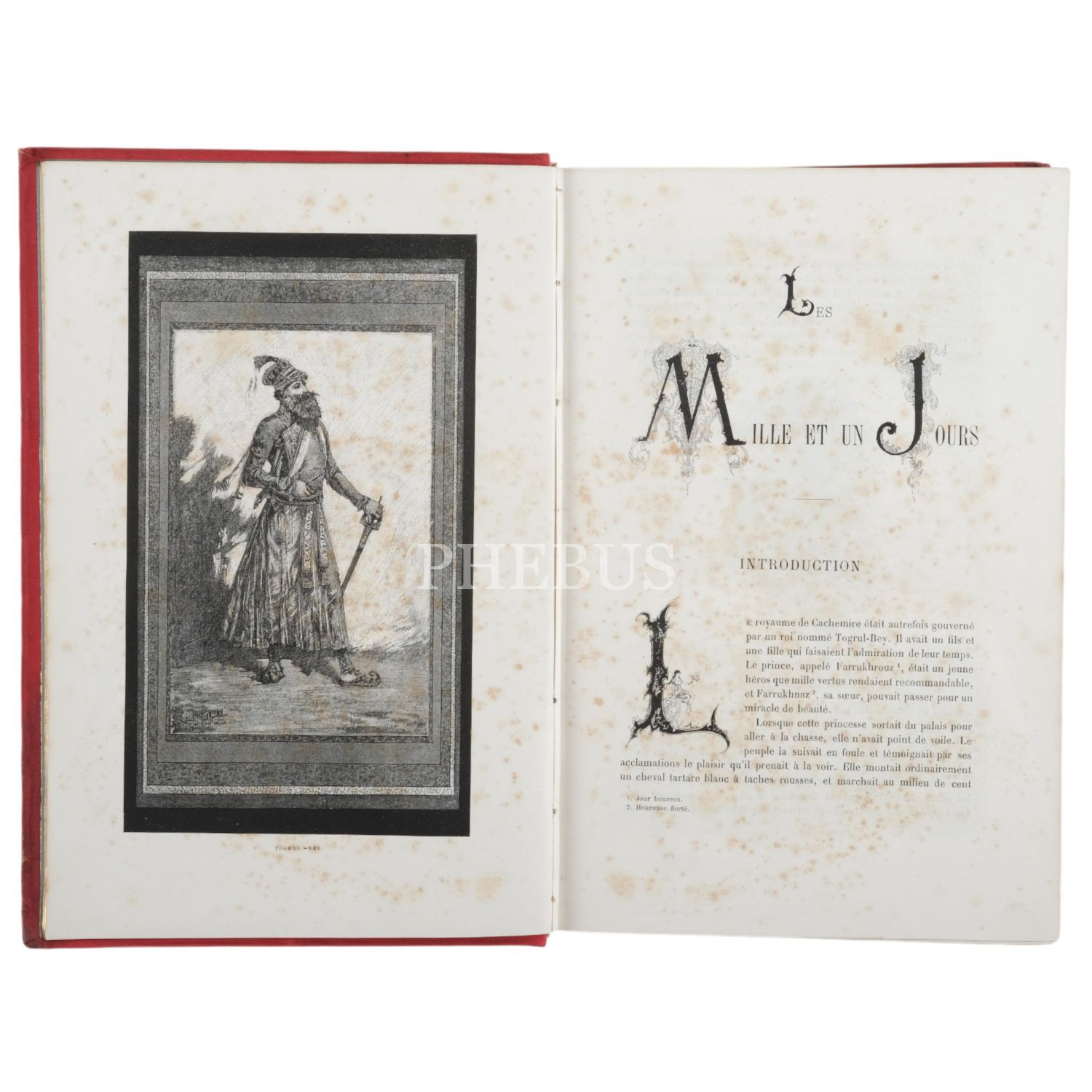 Suriye, İran ve Türkiye´de geçirdiği 10 yıl boyunca Arapça, Farsça ve Türkçe dillerine hakim olan Fransız oryantalist François Petis de la Croix´nın (1653-1713), Binbir Gece Masalları tarzında kaleme aldığı "Bin Bir Gün" isimli peri masalları derlemesi... Müzayedemizde sunduğumuz nüsha, ilk olarak 1710 - 1712 yılları arasında beş cilt halinde yayınlanan eserin, yayıncı E. Dupuis tarafından gençlerin kullanımına yönelik olarak hazırlanan 1855 tarihli baskısıdır. Masallara, A. Gaillard tarafından çizilen 500 adet çelik baskı illüstrasyon eşlik ediyor. Doğu ve Batı tarzı desenleri zarifçe buluşturan, yaldızlı, kabartmalı ve görkemli orijinal cildinde... Sayfa kenarları altın yaldızlıdır.