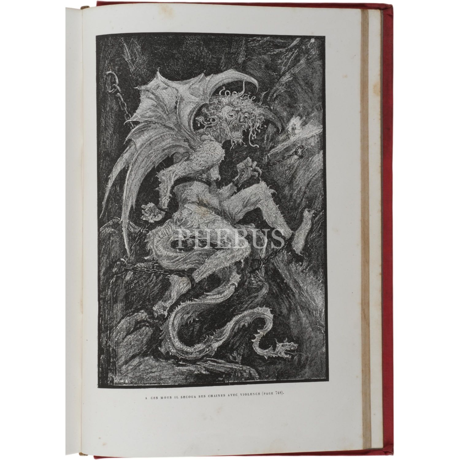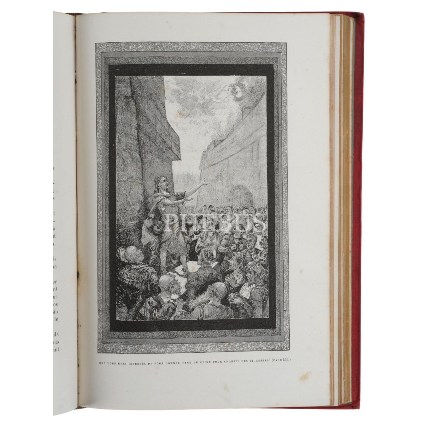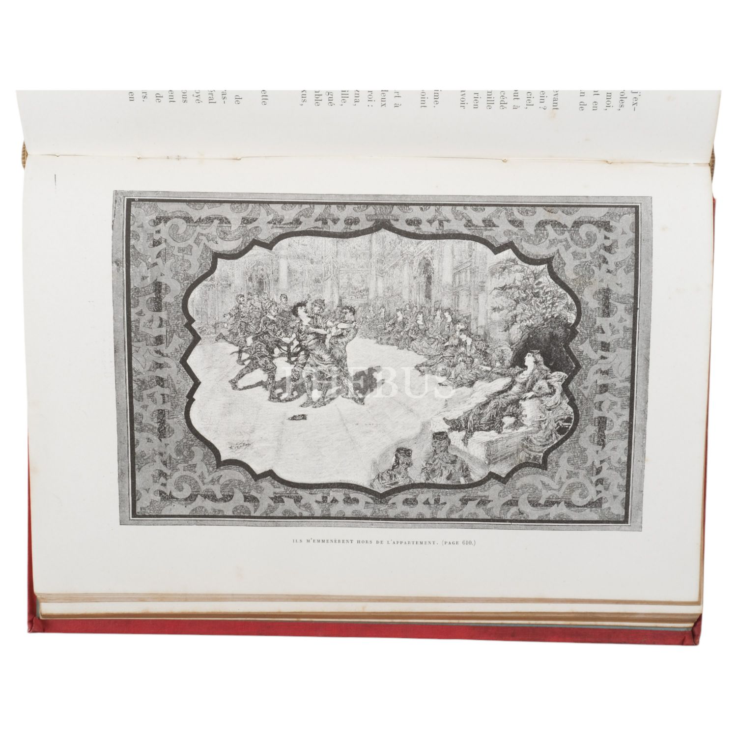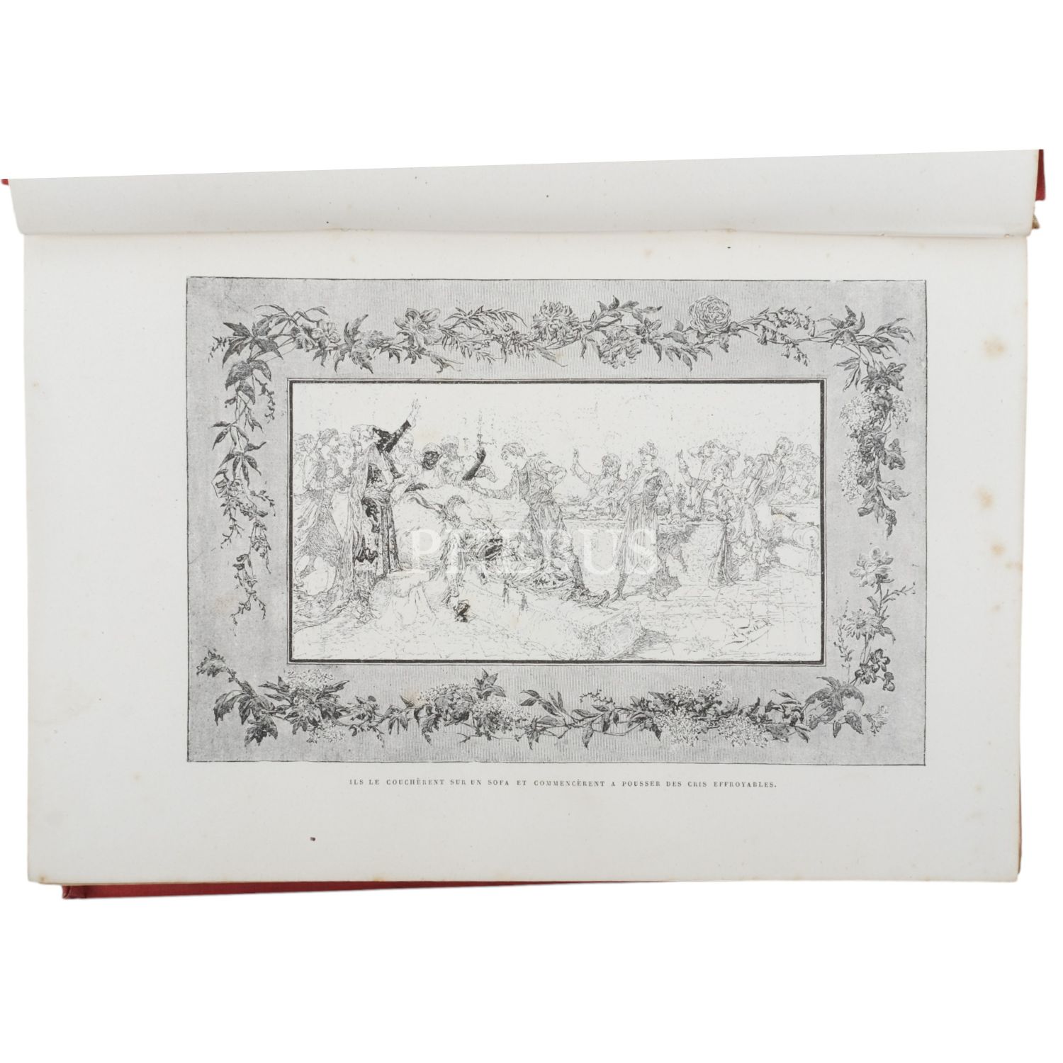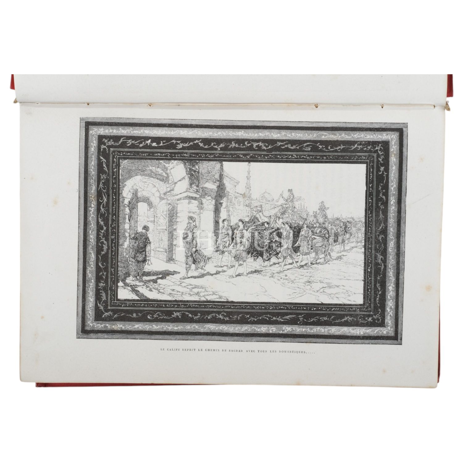 Suriye, İran ve Türkiye´de geçirdiği 10 yıl boyunca Arapça, Farsça ve Türkçe dillerine hakim olan Fransız oryantalist François Petis de la Croix´nın (1653-1713), Binbir Gece Masalları tarzında kaleme aldığı "Bin Bir Gün" isimli peri masalları derlemesi... Müzayedemizde sunduğumuz nüsha, ilk olarak 1710 - 1712 yılları arasında beş cilt halinde yayınlanan eserin, yayıncı E. Dupuis tarafından gençlerin kullanımına yönelik olarak hazırlanan 1855 tarihli baskısıdır. Masallara, A. Gaillard tarafından çizilen 500 adet çelik baskı illüstrasyon eşlik ediyor. Doğu ve Batı tarzı desenleri zarifçe buluşturan, yaldızlı, kabartmalı ve görkemli orijinal cildinde... Sayfa kenarları altın yaldızlıdır.