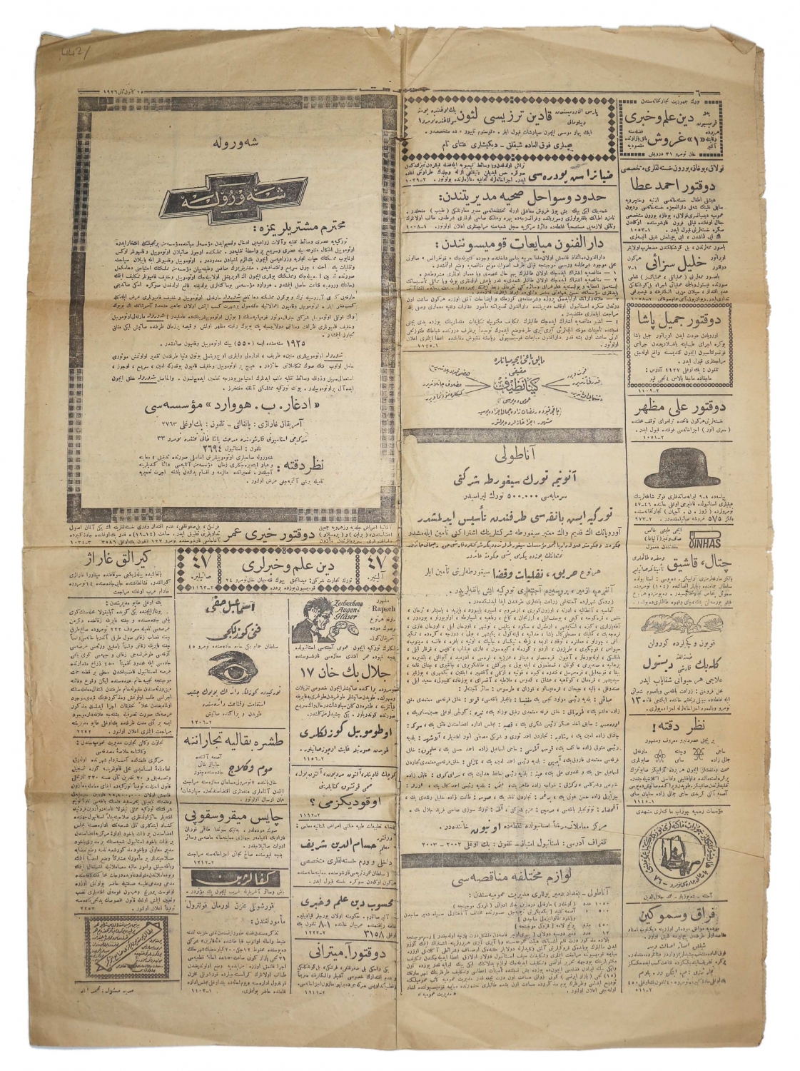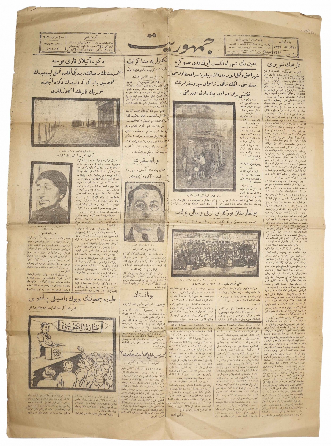 Osmanlıca Cumhuriyet gazetesi, 1344, "Emin Bey Şehremanetinden Ayrıldıktan Sonra" "Denize Atılan Karı Koca", "Bulgaristan Türkleri Terakki ve Teali Yolunda", 4 sayfa, 45x60 cm