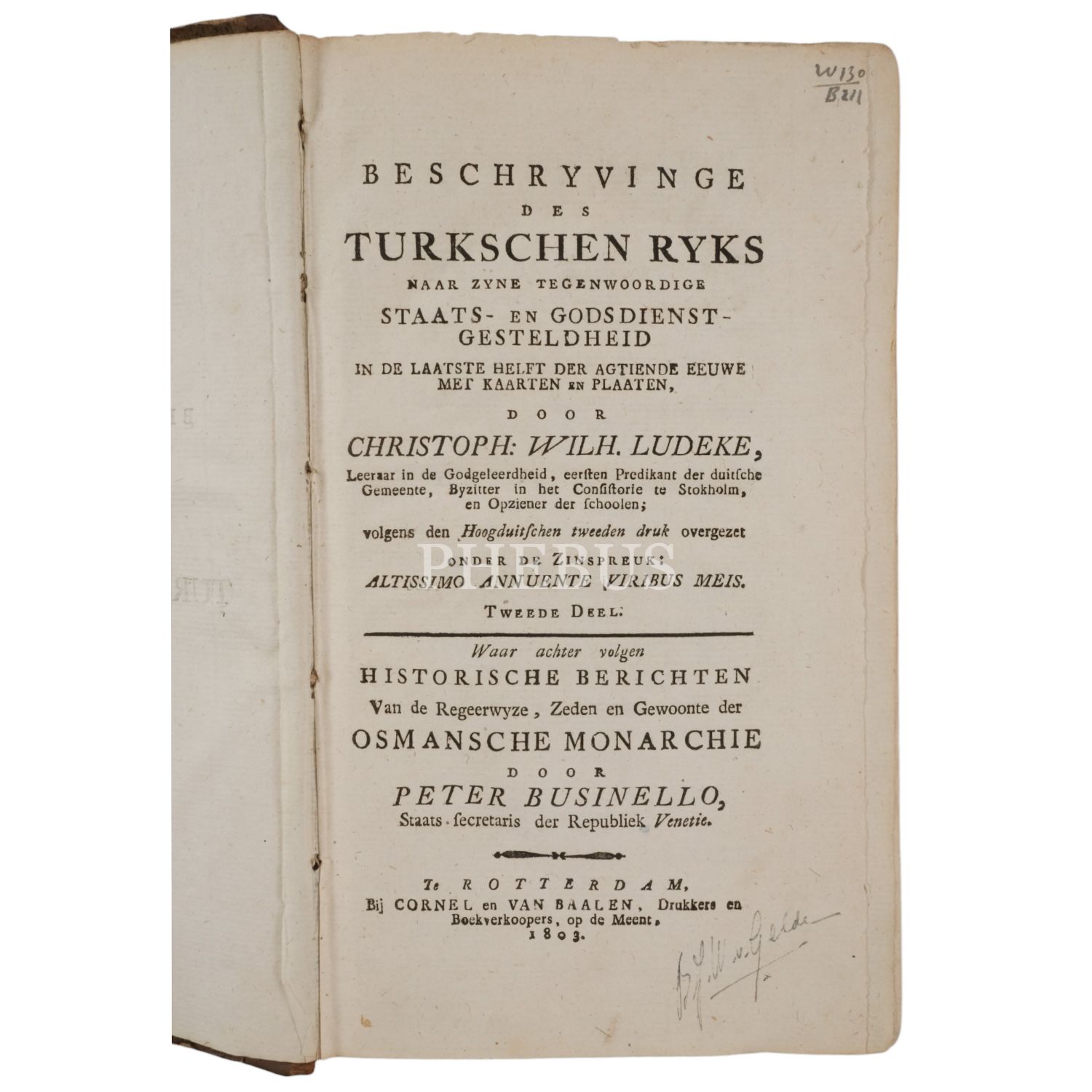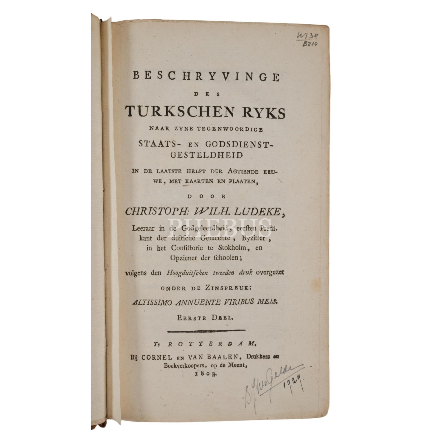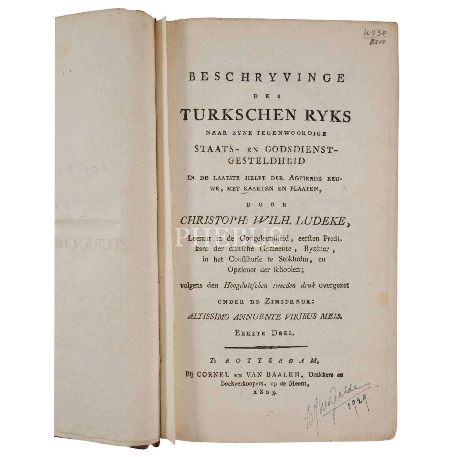 BESCHRYVINGE DES TURKSCHEN RYKS, Christoph. Wilh. Ludeke, 1803, Cornel en Van Baalen (Rotterdam), 566+673 sayfa, 14x20 cm...