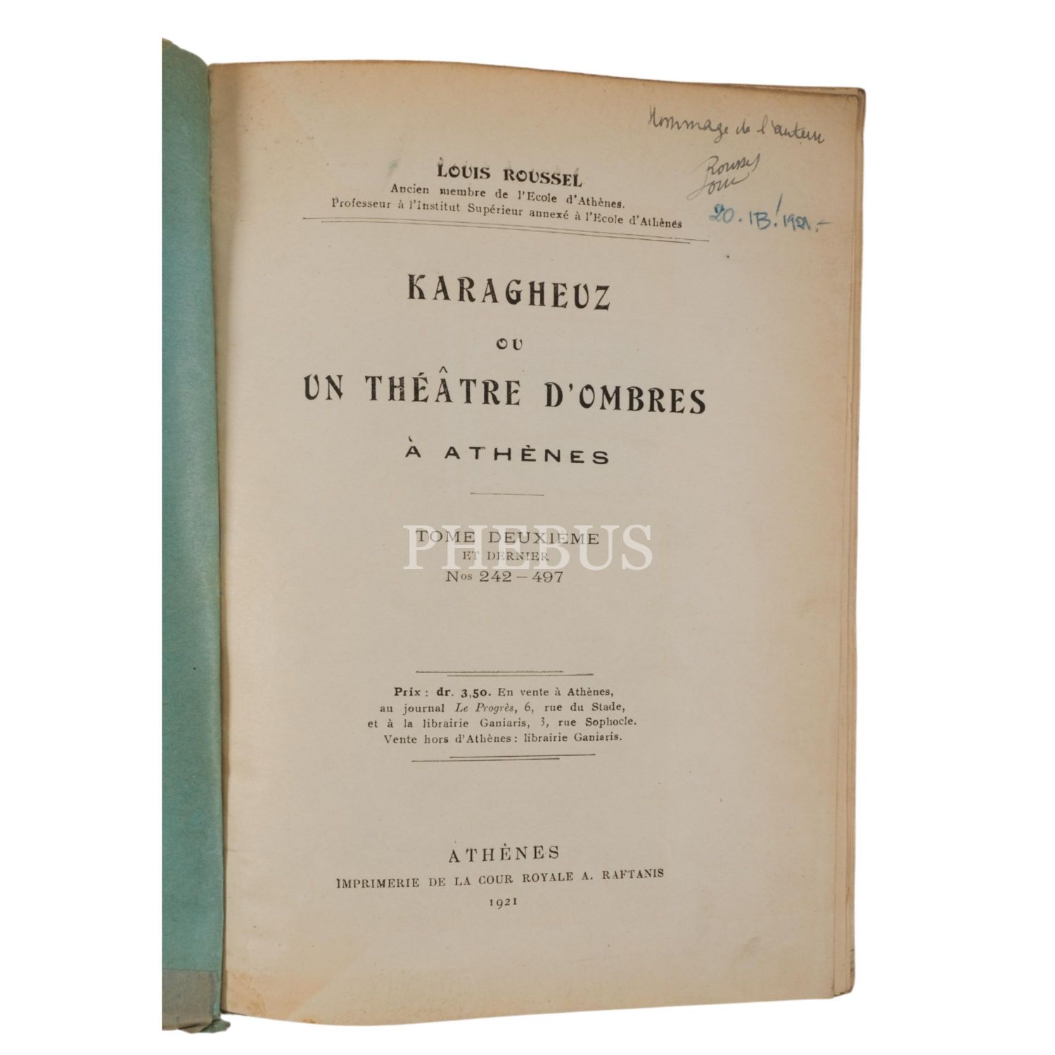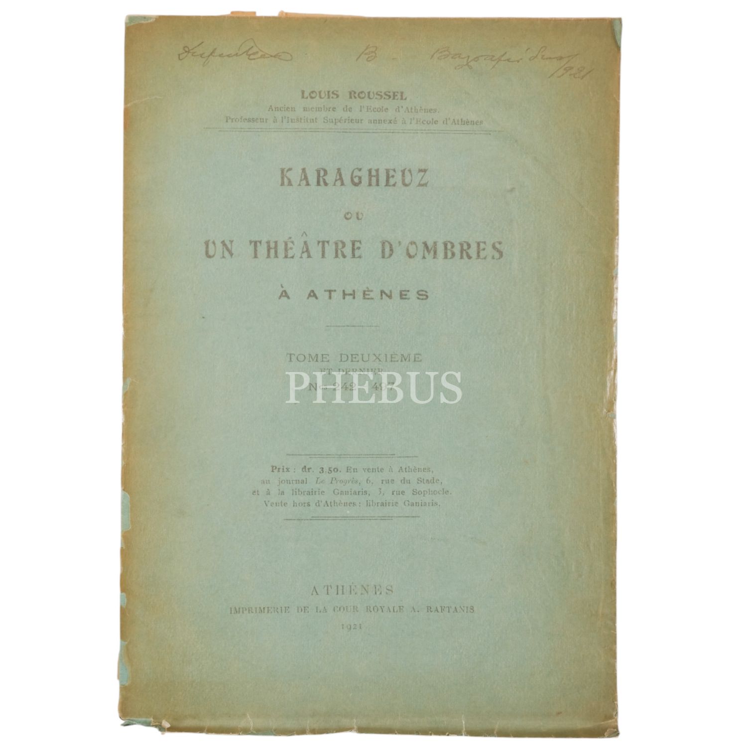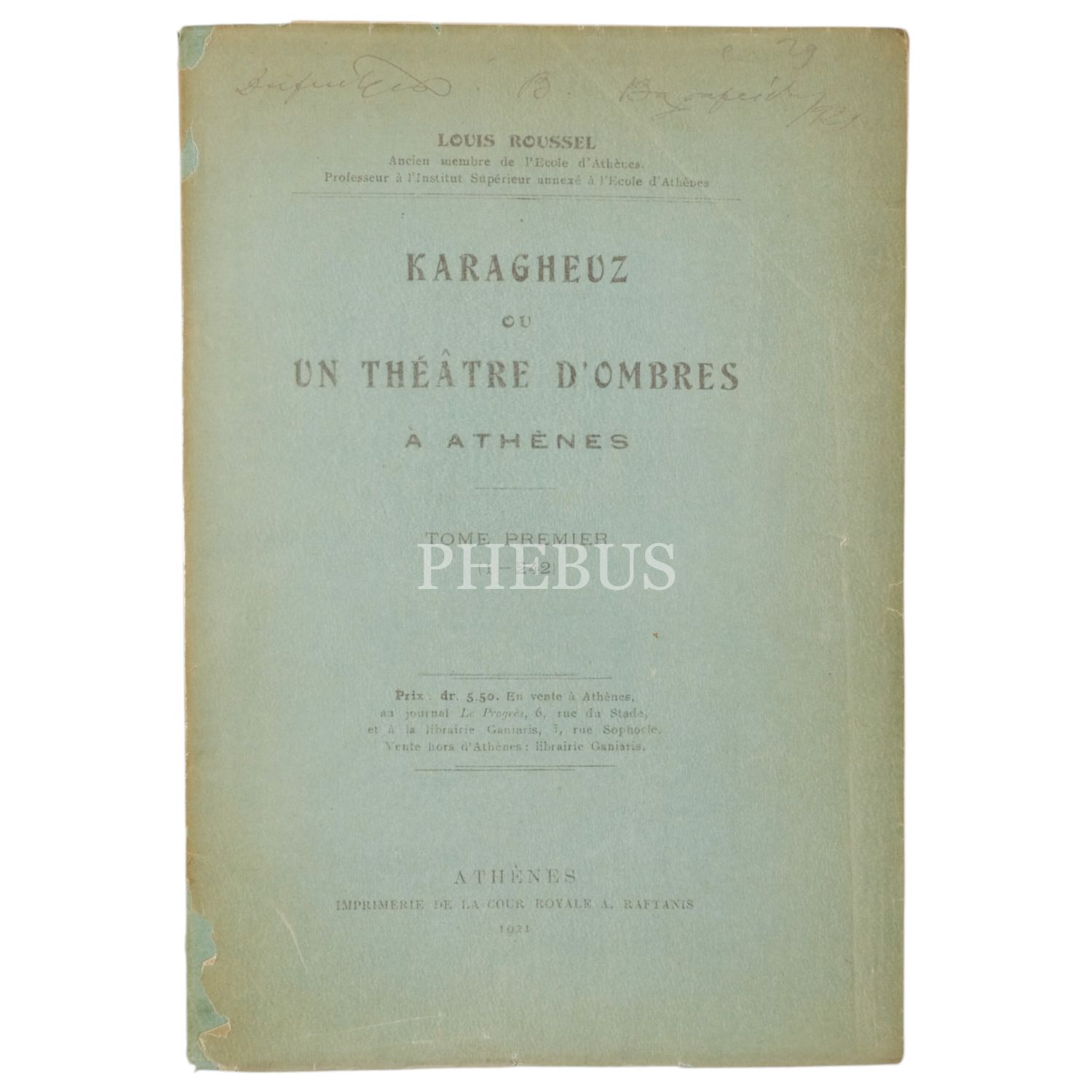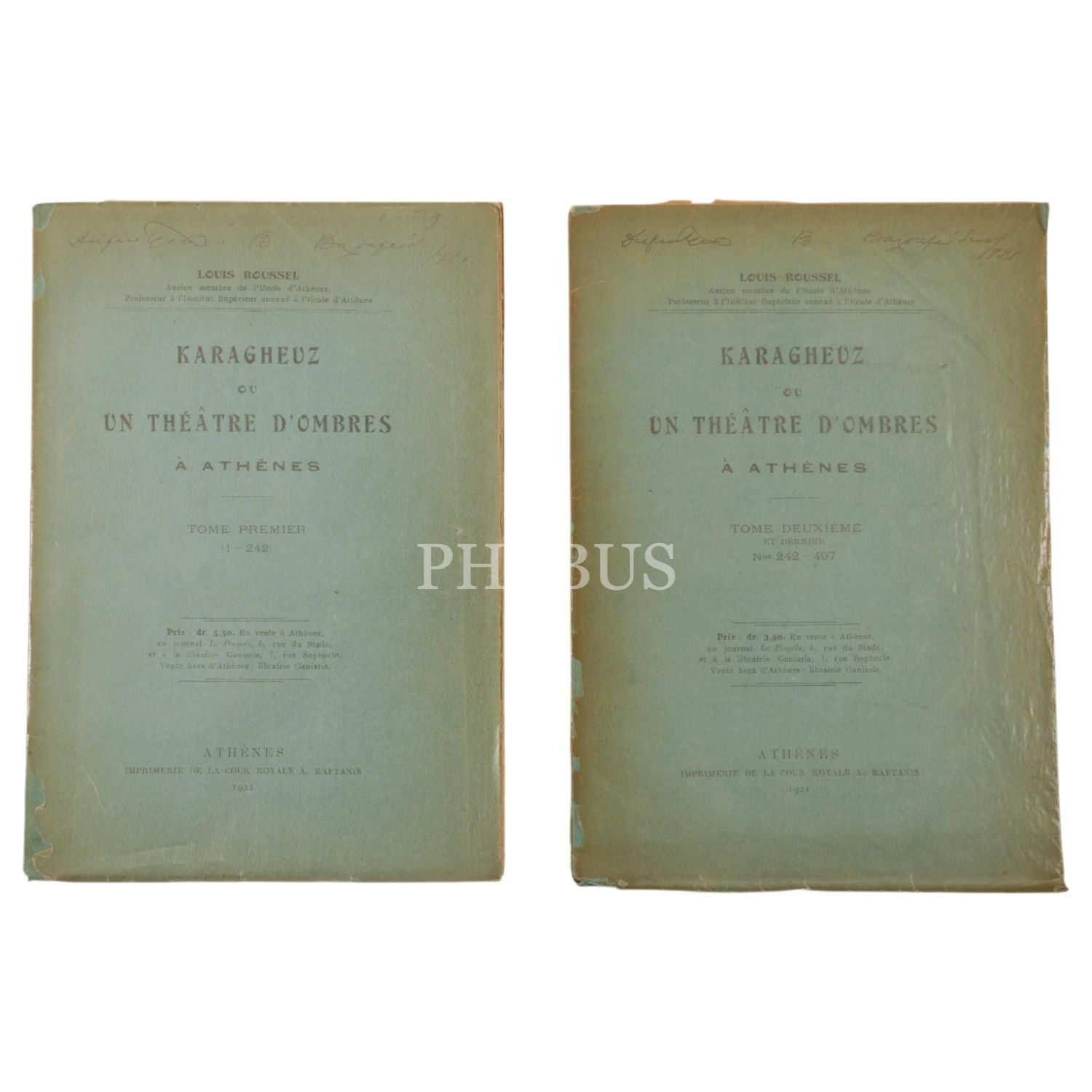 KARAGHEUZ OU UN THEATRE D´OMBRES A ATHENES (1 ve 2. Cilt), Louis Roussel, 1921, Imprimeire de la Cour Royale A. Raftains (Atina), 17x24 cm...