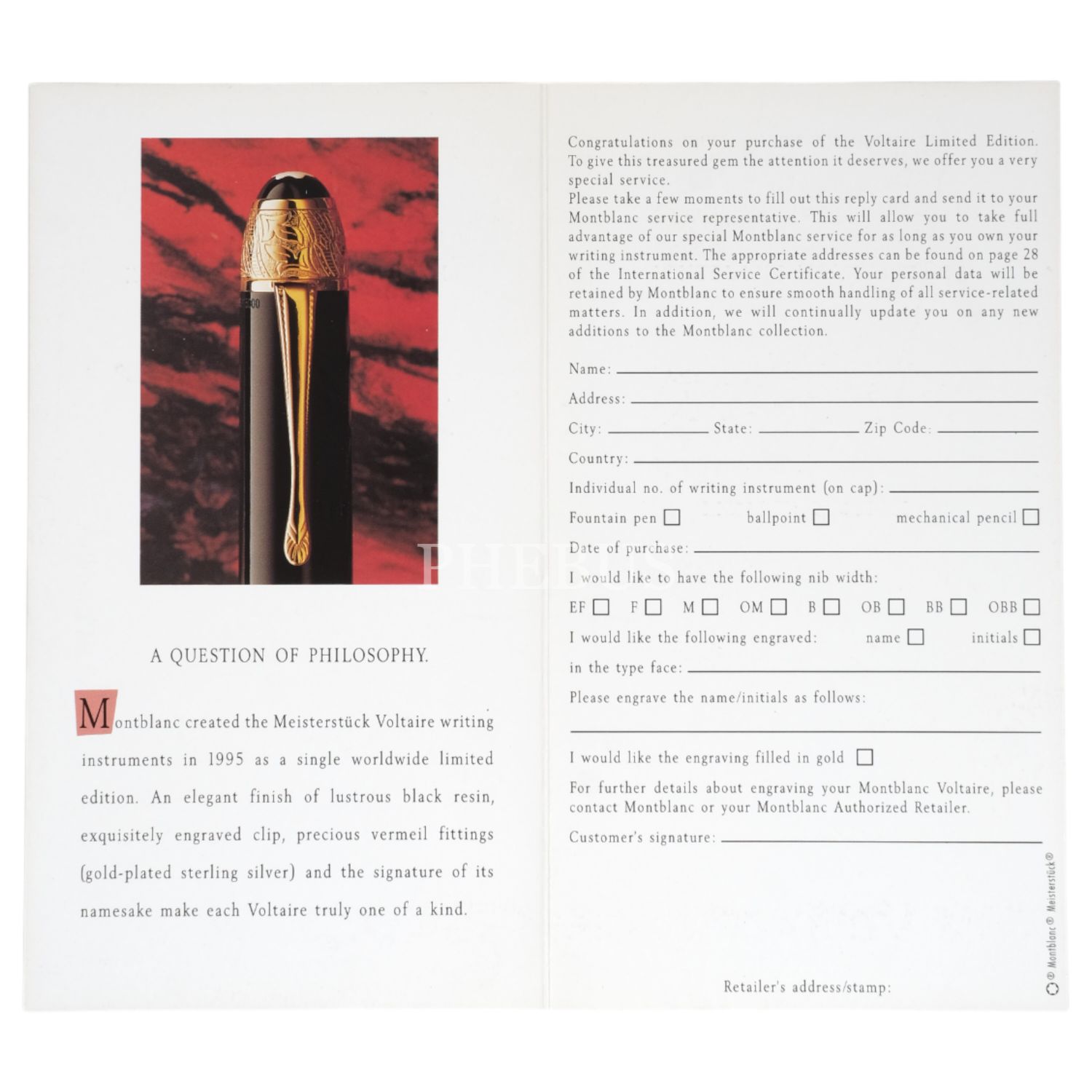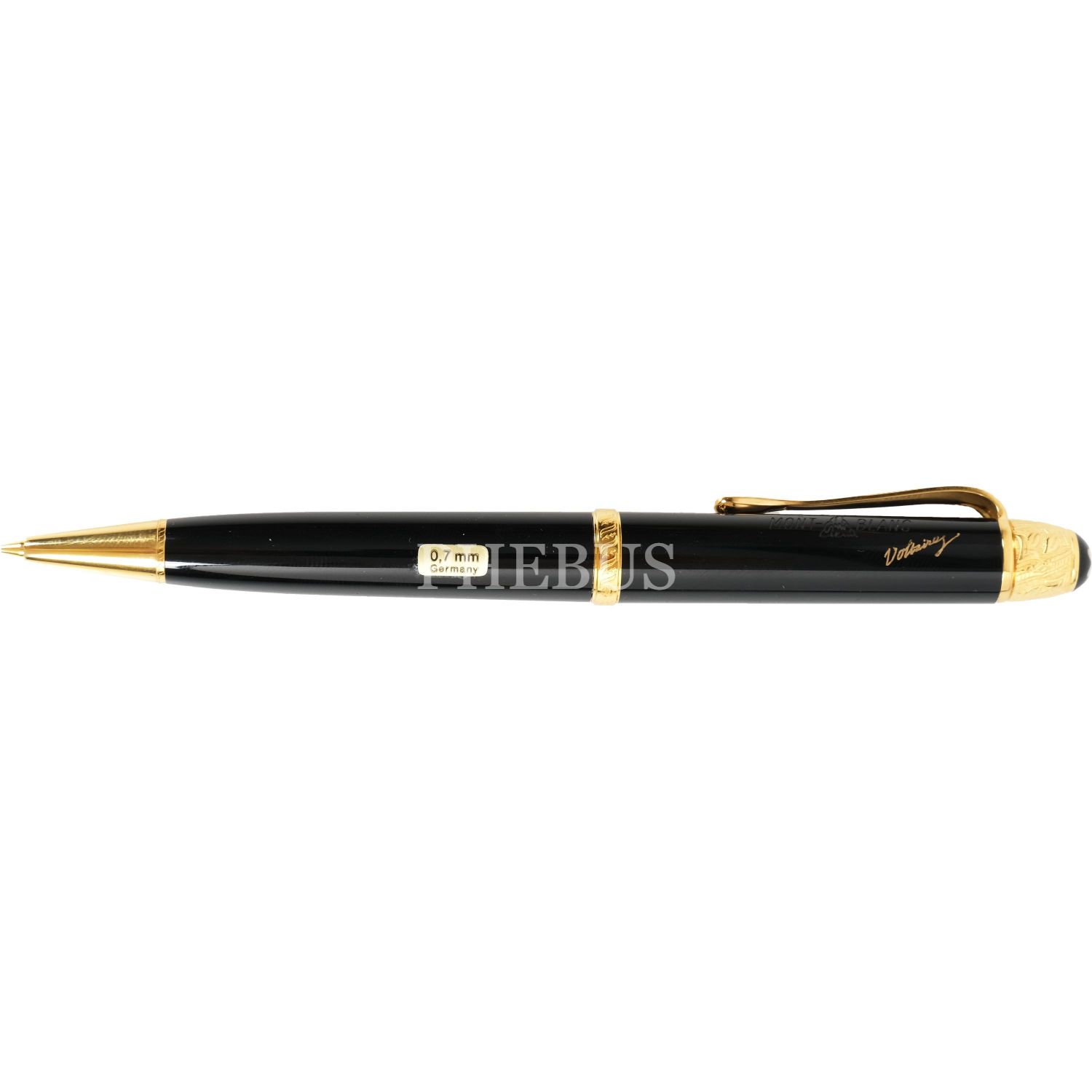 Montblanc, 1992’den beri her yıl Yazarlar Serisi kalemler üretmektedir. 1995 yılında üretilen Montblanc Voltaire, ünlü yazarın yaşamı ve eserlerinden ilham alınarak tasarlanmıştır. Siyah değerli reçine gövdeye, altın kaplama 925 ayar gümüş aksam ve vermeil kapak eşlik eder. Kapakta Voltaire’in dönemini yansıtan zarif gravürler bulunur. 0,7 mm uç kalınlığındaki bu kurşun kalem, hiç kullanılmamış olup orijinal kutusu ve sertifikasıyla birlikte sunulmaktadır. Limitli seri numarası: 10925.