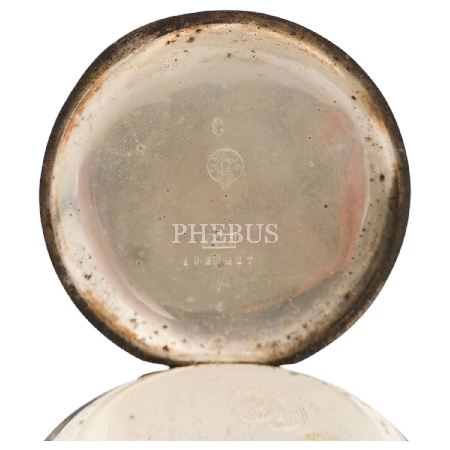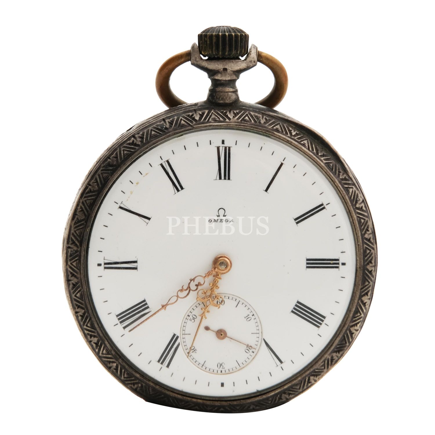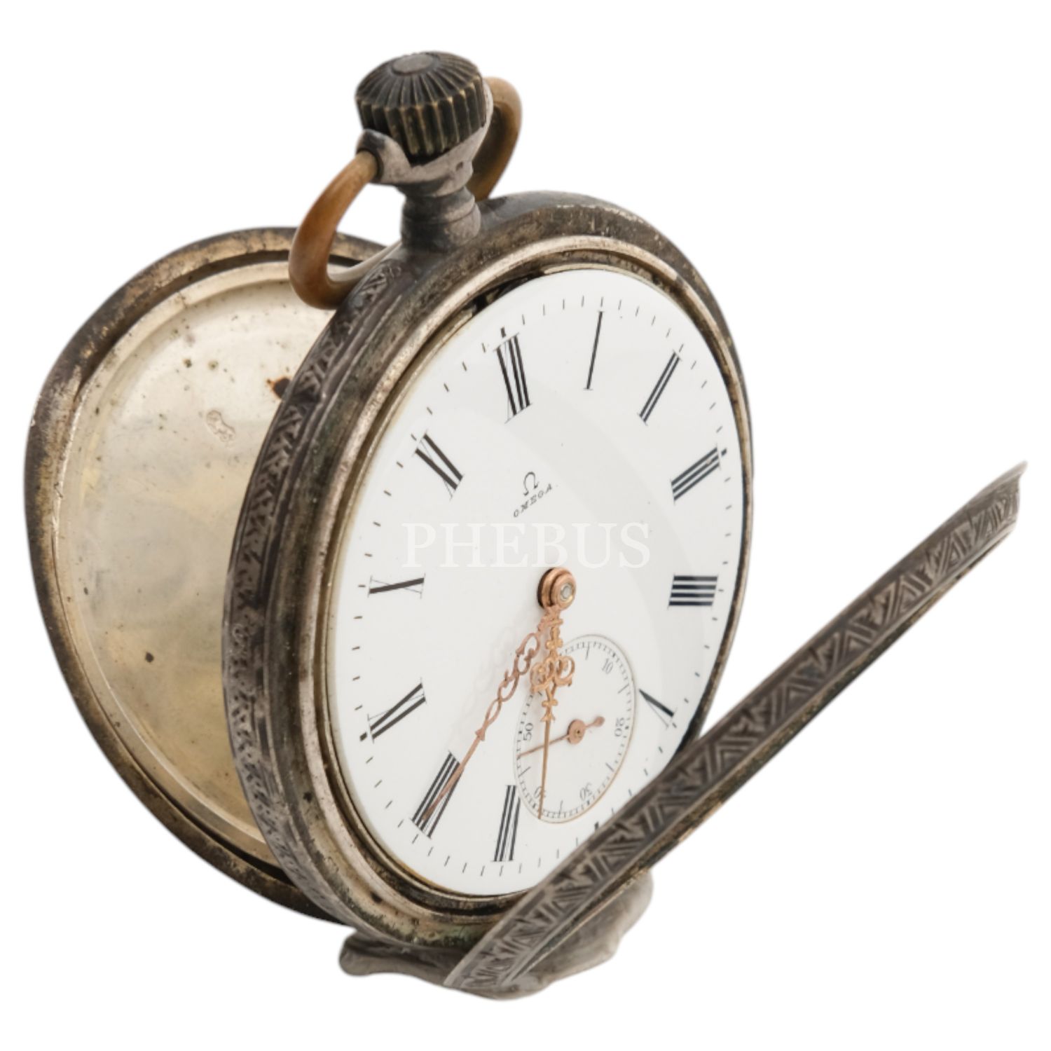 Omega, Roma rakamlı, arka kapağı Osmanlı arması işlemeli, gümüş kasalı çalışır durumda askeri cep saati, 53 mm...